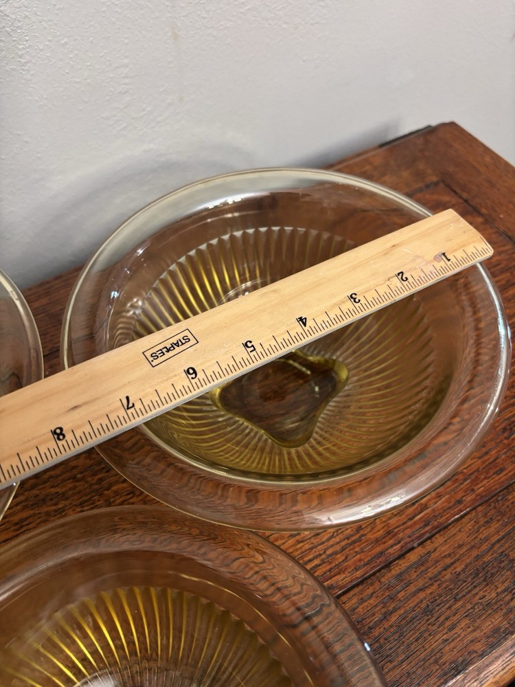 This set consists of three vintage yellow federal depression gold depression glass ribbed mixing bowls. Made from high-quality glass, these bowls are not only functional but also beautifully decorative. The yellow color and ribbed design add a touch of retro charm to any kitchen or dining area. Perfect for adding a vintage touch to your collection or as a unique gift for collectors of decorative items. The smallest bowl’s diameter measures to be 7 inches, the medium bowl’s diameter measures to be 7.5 inches, and the largest’s diameter measures at 8.5 inches.