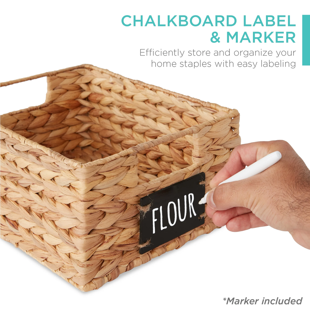 Stay organized with designated spaces that make it easy to keep track of your items. These baskets help you efficiently store and organize your home staples with easy labeling: where before you had a cluttered mess, you now have complete control over your space (Marker Included) Large baskets hold a variety of items and help optimize a space in need of order. Designed with natural materials and reinforced framing for a decorative appeal and long-lasting use, these baskets overlay a wire frame, with 100% water hyacinth, and add a wood veneer chalkboard. Make no mistake, whether it's in the bathroom, laundry, office, or bedroom, these baskets are a welcome addition to any room in need of fashionable storage. INCLUDED CHALKBOARD LABEL & MARKER: Comes complete with a water- and scratch-resistant chalkboard; use the marker to stay organized, then clean it off with a damp towel EASY ORGANIZATION: Help eliminate the excess clutter by organizing items for easy access or storing them away in style SPACE SAVING: These baskets are built large to comfortably hold up to 15 pounds of items and optimize any space for storage DURABLE MATERIALS: A wood veneer chalkboard attaches with string ties to 100% natural handwoven water hyacinth and wire frame MULTIPURPOSE STORAGE: These baskets add a practical and attractive addition to any room as you organize laundry, beauty products, cooking ingredients, and other home essentials; OVERALL DIMENSIONS: 12"(L) x 9"(W) x 5"(H); WEIGHT CAPACITY: 15 lbs.