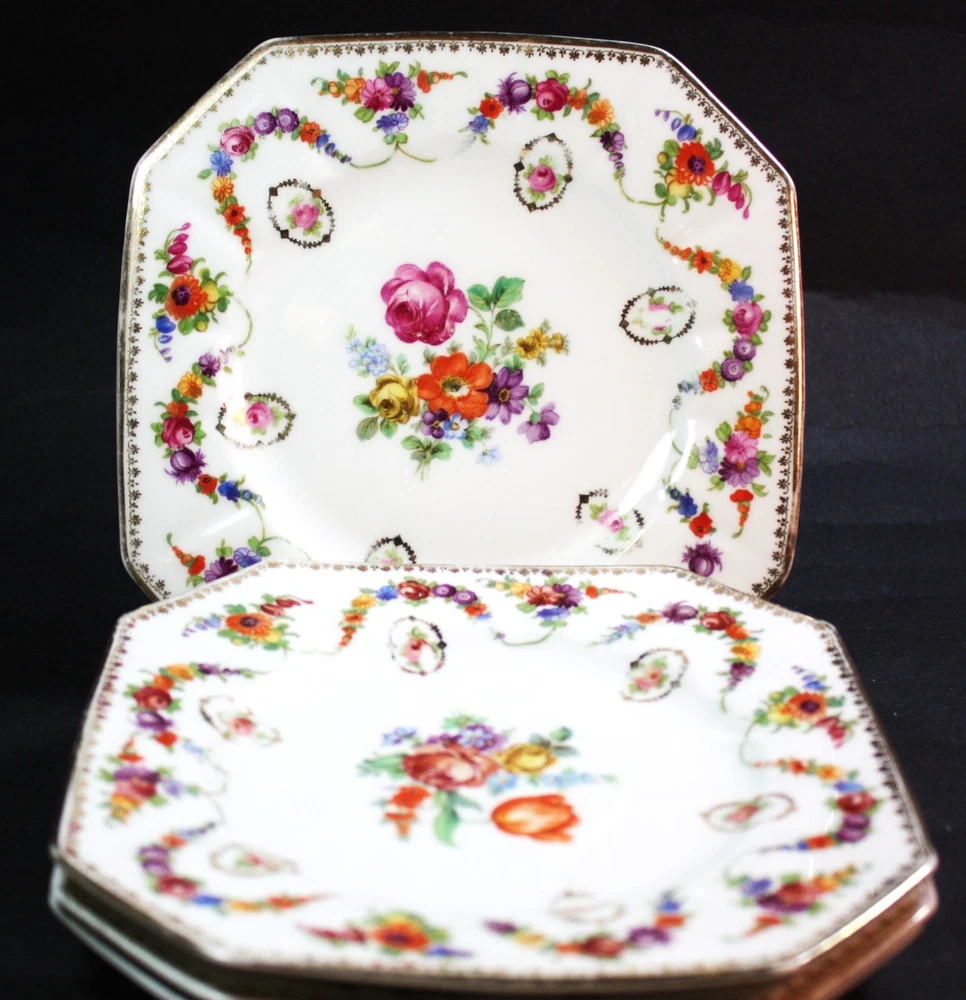 Discover the elegance of early 20th-century art pottery with this set of 4 Schumann Bavaria octagonal salad plates. Each plate showcases the vibrant Orange Tulip pattern, expertly crafted in Dresden, Germany, and features a stunning array of multicolor florals that bring a touch of Victorian charm to any table setting.These 7 1/4 inch porcelain plates are genuine antiques, produced between 1920-1929, and bear the original printed backstamp of Schumann Bavaria. Their decorative style and fine craftsmanship make them ideal for all occasions, requiring only hand washing to maintain their exquisite beauty.