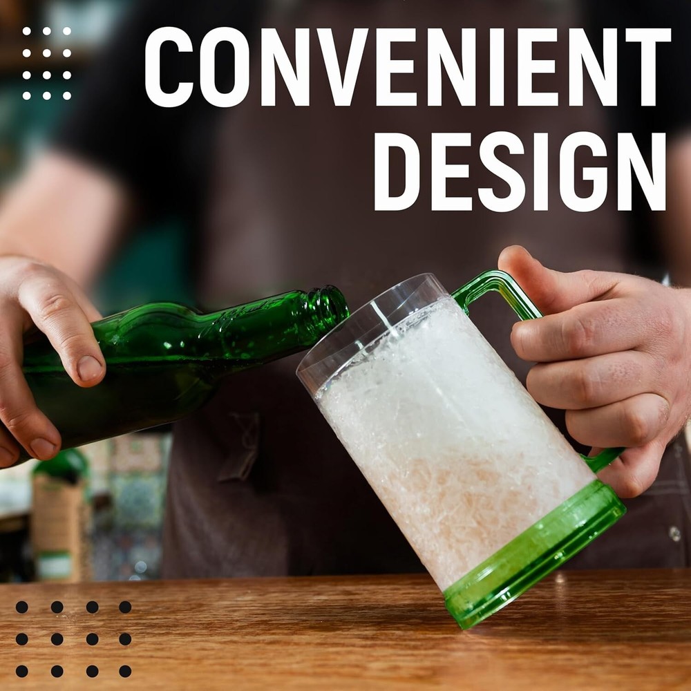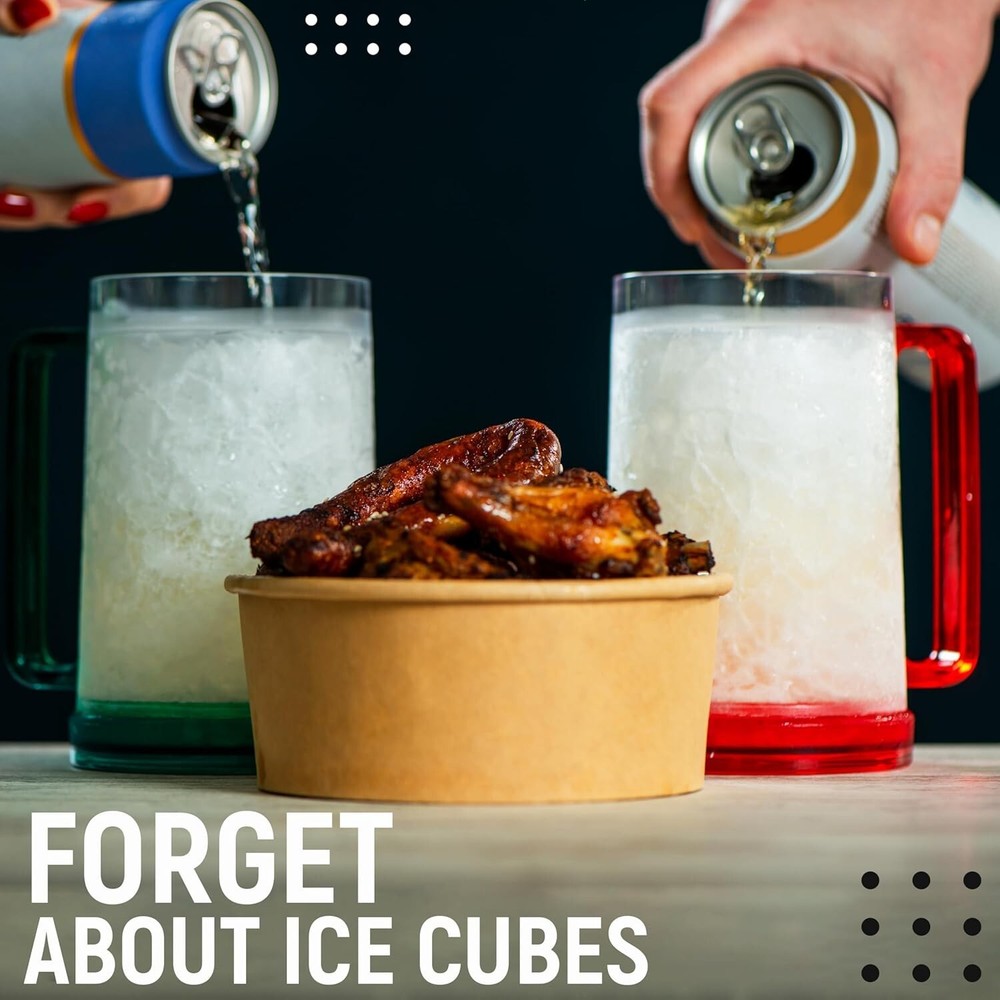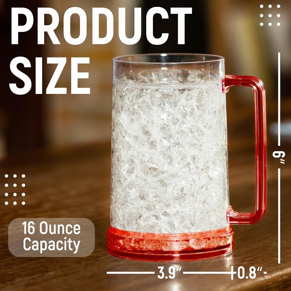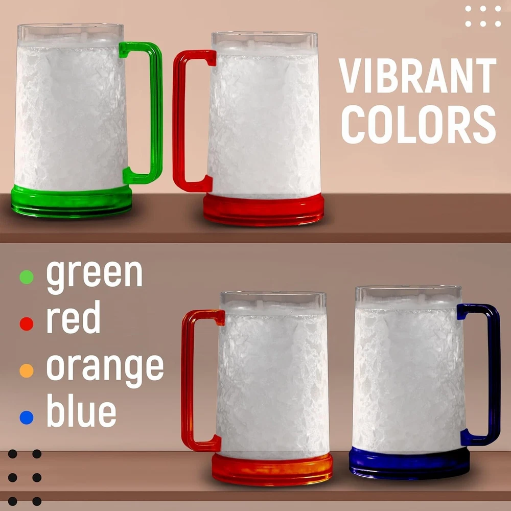 Beer Mugs with Gel Freezer 16 oz, Double Walled Beer Mugs with Handles, Color Handles Set Of 4 Unique Desing of Double Walled Beer Mug: walls of the plastic beer mugs with handles are filled with innovative gel that keeps drinks extra-freezing for up to 2 hours. Great Freezer Mugs for Beer: plastic mugs with handles are made of BPA-free acrylic materials and are absolutely safe to use with any beverage. Each frosty mug holds up to 16 ounces of liquid. Enjoy Beer Mugs for Freezer: Freezable beer glasses are great for any kind of beer, sodas, frozen drinks etc. you want to enjoy cold. No more melted ice cubes! Perfect Gift: freezer mugs with gel for men will be a suitable surprise as Christmas gifts, gifts for boyfriends, birthday gifts, gifts for men, or anniversary gifts for him. Important Tips: Do not freeze double-walled freezer mugs below -10°С / 14 °F. Put mugs upside down in freezer up to 4 hours, otherwise will cause a break. Do not use a microwave. Durable packaging!