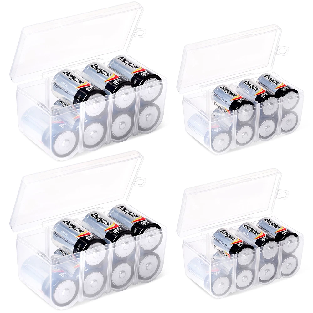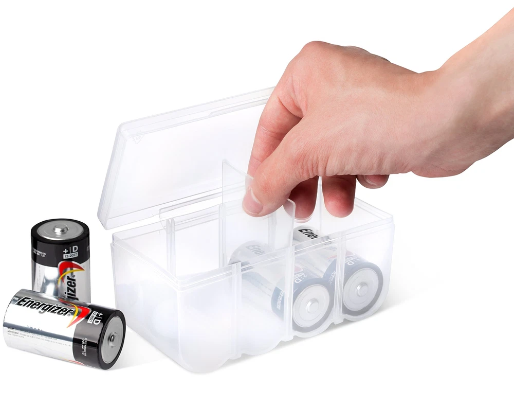 This Set of 4 - C and D Battery Storage Boxes is an excellent battery organizer for storing and protecting C and D batteries. These plastic battery storage boxes holds up to eight batteries at a time and includes a movable divider to help you keep fresh and dead rechargeable batteries separate. Set of 4 - C and D Handy Battery Storage and Organizing Boxes Each Box Provides Storage for up to 8 Batteries - Batteries Are Not Included Constructed from High Impact Plastic - Easy for Carrying Around Efficiently Snap Lid Keeps Batteries Neatly Organized and Safely Protected Inside Includes Divider for Separating Live Batteries from Dead - Good for Keeping your Batteries in While Traveling or Camping