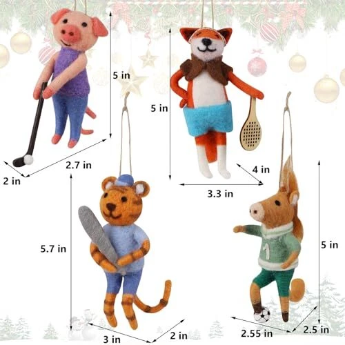 Return Policy Fast Delivery Trusted seller Set of 4 Christmas Felt Animal Athletes Ornaments, 5" Mini Hanging Wool Player Figurines, Tiered Tray Tabletop Decor, Animal Crafts Xmas Tree Festival Holiday Easter Gifts Home Office Party Supply Product Description CHRISTMAS FELT ANIMAL ATHLETES: This set includes four charming felt Athlete Animal ornaments - include pig, tiger, fox and horse, each showcg unique expressions and poses, perfectly capturing the whimsical spirit of the holidays and adding a touch of cuteness to your Xmas decor. The size approx. 2.7" X 2.5" X 5". Notes- It is for decoration, not a toy for children EASY TO DECOR: With a convenient string for hanging, each of these cute animal can be easily displayed on Christmas trees, Xmas wreath, hung from a mantle, or used as a special holiday touch on a beautifully wrapped gift. They can also be used as an indoor Christmas table decor - place them on your mantel, bookshelf, or as part of a table centerpiece, adding a whimsical element to your holiday table decor UNIQUE FESTIVAL ORNAMENTS: These vibrant colors animal ornaments make thoughtful gifts for friends and family during the holiday season, especially for animal lovers and those who enjoy unique, handcrafted decor. The playful design appeals to both children and adults, making them a great addition to any holiday setting PREMIUM QUALITY: These Christmas-themed little creatures are hand-crafted from soft wool, ensuring a unique and tactile element that stands out from traditional holiday decor. Each cute mice are dress properly and done with precision to give it a lifelike and realistic look WIDELY APPLICATION: Our Christmas Wool Athlete Animal Figurines offer versatile applications across various settings - from home and office decor to party and event decorations, and as a delightful gift. Add a touch of fun and festivity to your celebrations with these adorable mice, making them an ideal choice for Christmas, Easter, or any festive party supply needs Shipping Returns Payment Shipping Shipping is FREE to all addresses other than APO/PO boxes in the lower 48 states. All our stock ships from US-based warehouses. Shipped via USPS or UPS (depending on location and package weight) Unless stated otherwise, all orders will ship within 24-72 hours of your payment being processed. Check our feedback to see the great reviews of FAST shipping we offer. Returns Seller does not accept returns Payment We currently accept payment via eBay managed payments only. Once payment is cleared, we will dispatch your shipment within 1-3 business days. Please refer to the "Shipping" tab for more information regarding shipping speed to your destination.