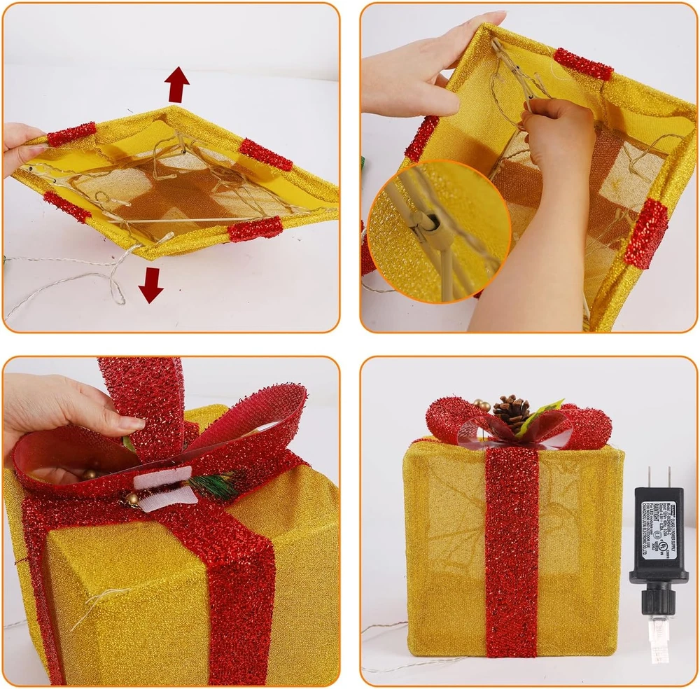Adorable Lighted Christmas Gift Boxes: Decorate your space with our set of 4 lighted Xmas red green yellow and blue tinsel present boxes in the coming up Christmas. Comes with super bright 70 LED warm white lights, it is absolutely a beautiful scenery to stack the gift boxes, or place them side by side under the Christmas tree or front porch Premium Quality: Our pre-lit Christmas gift boxes are made of PVC material and metal for a lovely look. The color of this cute gift box does not fade, sturdy and lightweight, will look great all the time. Decor them to anywhere you can place, you will be fast on your way to hosting a wonderful Christmas celebration Size Information: Package comes with 4 pcs lighted gift boxes in 4 different sizes. Extra Large - 8.5 x 8.5 x 8.5 inches, Large - 7.5 x 7.5 x 7.5 inches, Medium - 6.5 x 6.5 x 6.5 inches, Small - 4.7 x 4.7 x 5 inches. Extra long extension cord is 9.8ft. Plug the transformer into the wall outlet and the lights will come on Easy to Assemble & Storage: No tools or specialized skills are required. our Christmas gift boxes are very easy to set up and take down. Just takes few minutes to stretch the box and insert metal pole which in the box into the hole for fixing. When not in use, these gift boxes can be folded up and placed in a small box. If use outdoors, please use a waterproof receptacle cover, or keep them in the covered porch to avoid rainy and snowy Ideal Christmas Decorations: Unique appearance design make our light up organza present boxes vivid and lifelike, suitable for multiple use. Vivid posture make them look more attractive and lovely, suitable for indoor outdoor multiple use. Perfect for Christmas tree, front door, living room, fireplace, cabinets, outdoor covered porch, wedding party or any other places to welcome your guests and create a romantic atmosphere Product description The video showcases the product in use. The video guides you through product setup. The video compares multiple products. The video shows the product being unpacked. Set of 4 Christmas Lighted Gift Boxes Decorations Specification: Material: PVC Plastic, Metal LED Color: Warm White LED quantity: 70 LED Extra Large Box: 8.5 x 8.5 x 8.5 inches Large Box: 7.5 x 7.5 x 7.5 inches Medium Box: 6.5 x 6.5 x 6.5 inches Small Box: 4.7 x 4.7 x 5 inches Extra long cable: 9.8ft Power adapter: 4.5V low voltage plug Package included: Set of 4 Lighted Christmas Gift Boxes Set of 4 Christmas Lighted Gift Boxes Decorations, Pre-lit Tinsel Present Box Decorate your space with our set of 4 lighted Xmas red green yellow and blue tinsel present boxes in the coming up Christmas. It is absolutely a beautiful scenery to stack the gift boxes, or place them side by side under the Christmas tree or front porch. Our pre-lit Christmas gift boxes are made of PVC material and metal for a lovely look. The color of this cute gift box does not fade, sturdy and lightweight, will look great all the time. Notes: 1. If use outdoors, please use a waterproof receptacle cover, or keep them in the covered porch to avoid rainy and snowy. 2. If any ornaments fall off, please stick them back on. 3. The color may exist a slight difference due to different screen displays. 4. When you receive the product, it may be slightly deformed due to transportation, please adjust by hand to the best condition. Some More Christmas Decorations Add to Cart Add to Cart Add to Cart Add to Cart Customer Reviews 3.9 out of 5 stars 88 4.2 out of 5 stars 186 4.2 out of 5 stars 731 4.6 out of 5 stars 152 4.3 out of 5 stars 112 4.2 out of 5 stars 317 4.4 out of 5 stars 5,466 Price — — — $24.99 $ 24 . 99 $23.45 $ 23 . 45 $22.49 $ 22 . 49 $22.99 $ 22 . 99 Package: Set of 10 Set of 6 x 2 1 Pack Set of 3 Set of 6 Set of 2 1 Pack Number of Light Sources: 60 Count 72 Count 10 Count 60 LED 100 Count 100 LED 300 LED Powered Source: Plug In Plug In Plug In Adapter Powered Plug In Battery Powered USB & Adapter Operated Material: Plastic Plastic Plastic PVC Plastic, Organza Plastic Plastic Plastic Light Color: Clear Clear Clear Warm White Clear Warm White RGB 16 Colors Changing Some More Christmas Decorations Add to Cart Customer Reviews 4.2 out of 5 stars 136 4.2 out of 5 stars 136 4.2 out of 5 stars 136 4.4 out of 5 stars 417 4.4 out of 5 stars 417 4.4 out of 5 stars 417 4.6 out of 5 stars 15,924 Price — — — — — — $24.99 $ 24 . 99 Package: 1 Pack 1 Pack 1 Pack 2 Pack 2 Pack 2 Pack 1 Pack Number of Light Sources: 50 LED 50 LED 50 LED 50 LED Each 50 LED Each 50 LED Each 200 LED Powered Source: Adapter Powered Adapter Powered Adapter Powered Battery Powered Battery Powered Battery Powered Adapter Powered Material: Plastic Plastic Plastic Plastic Plastic Plastic Plastic Light Color: Warm White Multicolor Red Purple Multicolor Warm White Cool White 20 Colors Some More Christmas Decorations Add to Cart Add to Cart Add to Cart Add to Cart Add to Cart Add to Cart Add to Cart Customer Reviews 4.4 out of 5 stars 307 4.4 out of 5 stars 307 4.5 out of 5 stars 2,730 4.5 out of 5 stars 2,730 4.5 out of 5 stars 2,730 4.5 out of 5 stars 2,730 4.5 out of 5 stars 2,730 Price $29.99 $ 29 . 99 $29.99 $ 29 . 99 $12.99 $ 12 . 99 $12.99 $ 12 . 99 $12.99 $ 12 . 99 $14.99 $ 14 . 99 $12.99 $ 12 . 99 Package: 1 Pack 1 Pack 1 Pack & 3 Pack 1 Pack & 3 Pack 1 Pack & 3 Pack 1 Pack & 3 Pack 1 Pack & 3 Pack Number of Light Sources: 1000 LED 1000 LED 150 Each 150 Each 150 Each 150 Each 150 Each Powered Source: Adapter Powered Adapter Powered Plug In Plug In Plug In Plug In Plug In Material: Plastic Plastic Plastic Plastic Plastic Plastic Plastic Light Color: Multicolor Warm White Multicolor Red Blue Green Clear Warm White