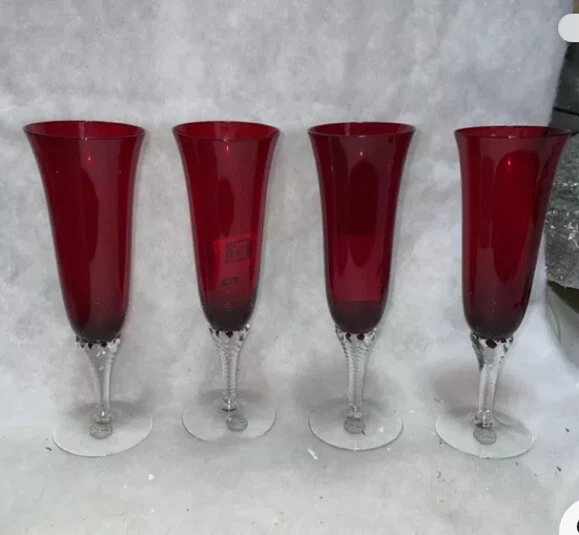Elevate your drinking experience with this set of four Czech Republic red glasses. The glasses feature a clear base and a fluted stem, adding a touch of elegance to any occasion. Each glass is 8 1/2" tall and has a tapered shape, making them perfect for champagne or any other beverage. These glasses are not just functional, but also decorative, adding a touch of ruby glass to your collection. The set includes four glasses and is an original, licensed reproduction. Toast to life with these beautiful glasses that are sure to impress your guests.