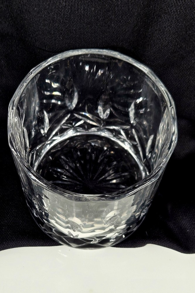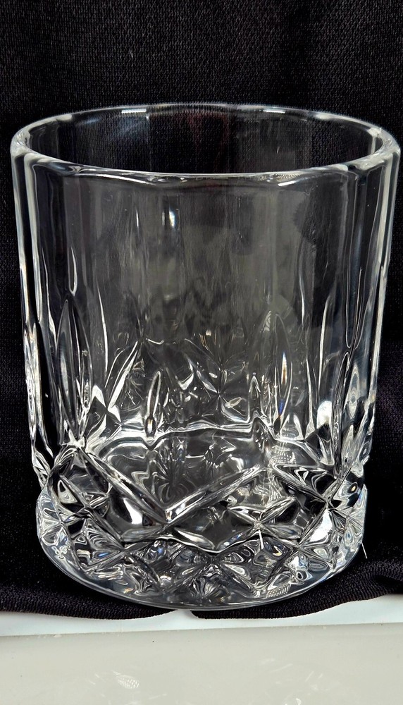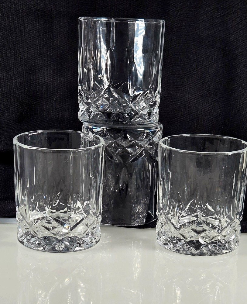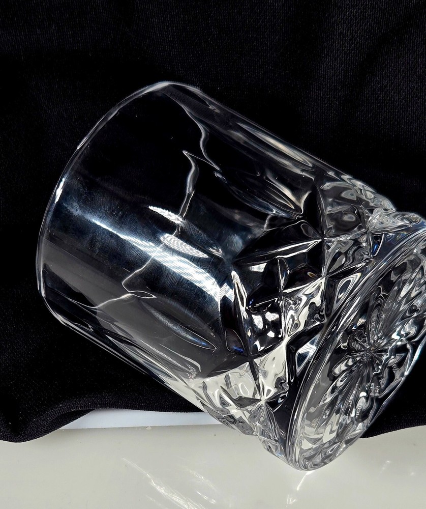 The set of 4 whiskey low ball glasses features a contemporary style with a diamond cut design, made of high-quality lead crystal. Each glass measures 3.75 inches in height, perfect for enjoying your favorite whiskey or cocktail in a sophisticated manner. The clear crystal material and cut-glass production style add a touch of elegance to any occasion, making this set of glasses ideal for all types of gatherings and events. J006