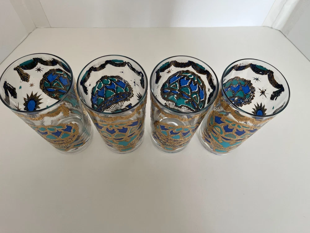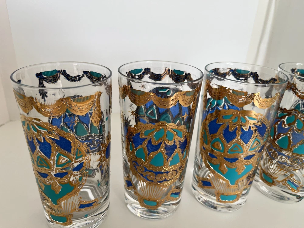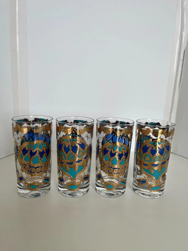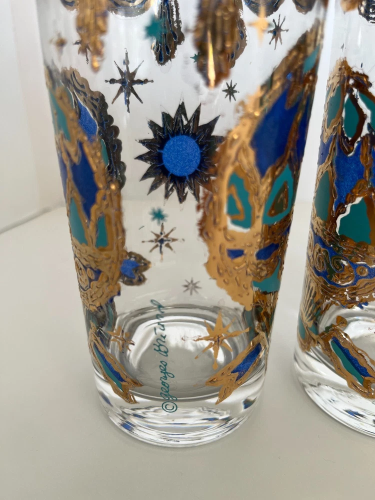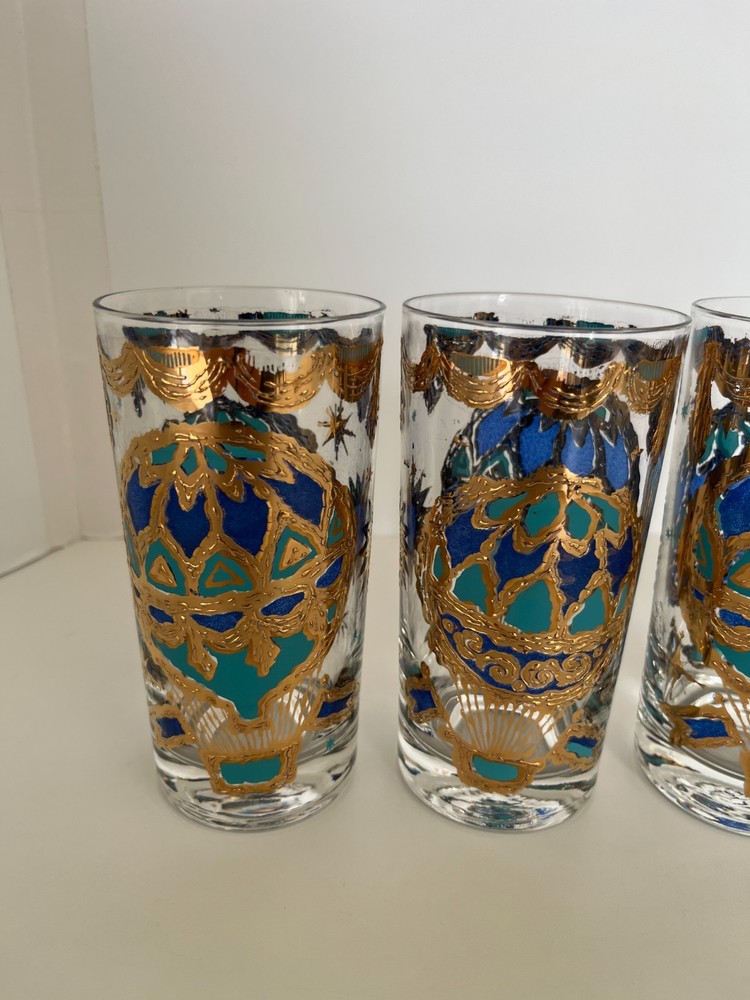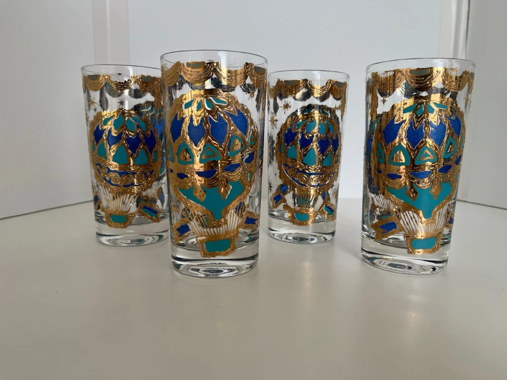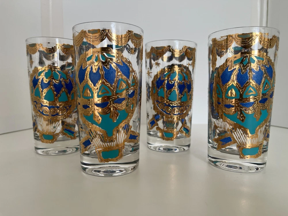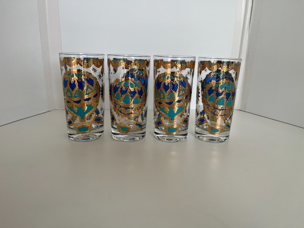 Georges Briard 22k gold gilt Hot Air Balloon high ball glasses/Vintage Barware/MCM tumblers/retro highballs/retro drinkware/HTF/Rare/VTG/60s Set of 4 RARE Georges Briard 22k gold gilt high ball tumblers featuring a hot air balloon and celestial motif in blue and green. These glasses are fun and kitschy with their over-the-top use of applied gold gilt and whimsical theme. The gold complements the rich blue and green colors well and they are sure to catch your eye! Each glass is signed by Georges Briard and is in great vintage condition. There are no chips or cracks but there is some very slight gold loss throughout. Please see the photos for more details regarding the condition. This pattern is very hard to find and is rarely on the market for purchase. This item is cross-posted to Etsy. Measures approximately- 5 5/8'' H x 2 3/4'' opening diameter All orders are shipped the next business day Monday-Saturday (as much as possible, however there may be an occasional delay due to unforeseen circumstances). This item will ship with insurance. Please note-Regarding shipping, I use clean recycled packaging materials whenever possible. Your item may arrive in a reused Amazon box (or another vendor). Items that are fragile will often be double-boxed for additional protection. All sales are final and sold AS-IS. If your item arrives damaged or you have a different issue with your order, before leaving feedback, please contact me to see what options I may be able to offer you. Thank you!!