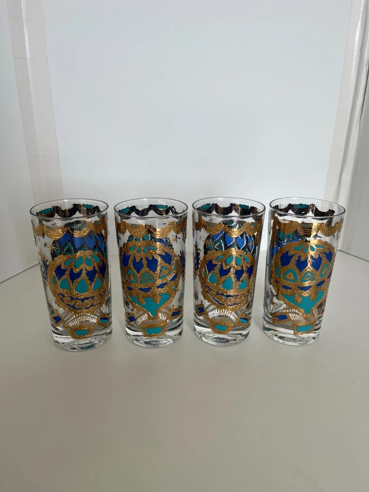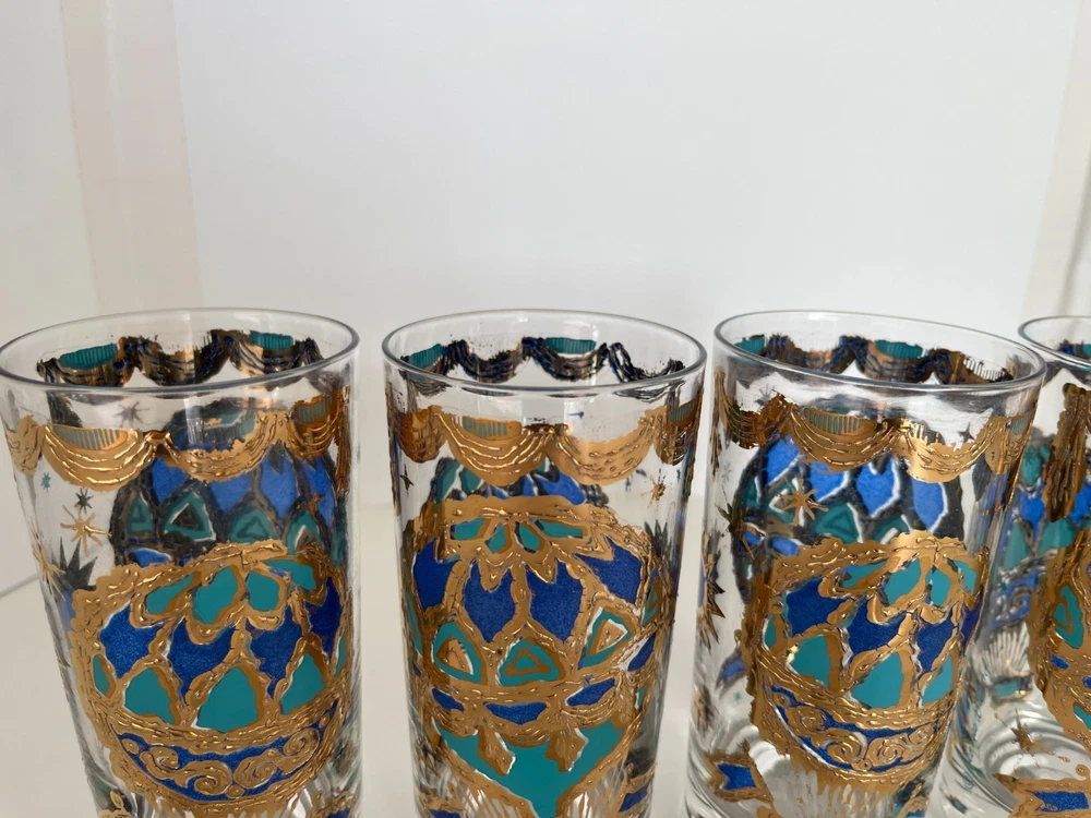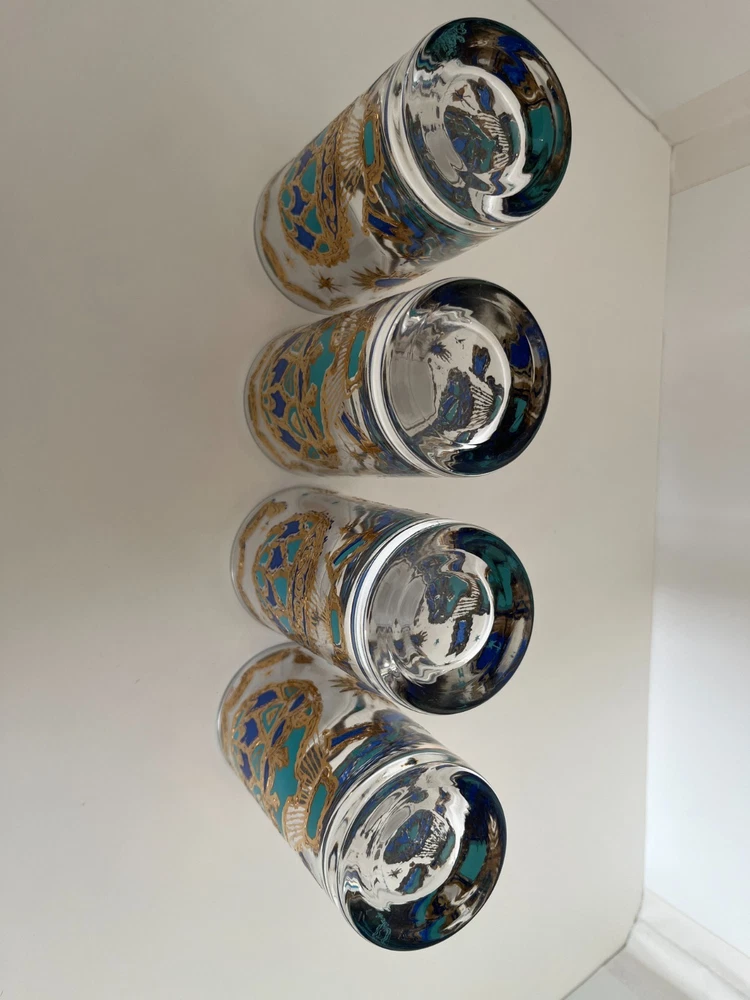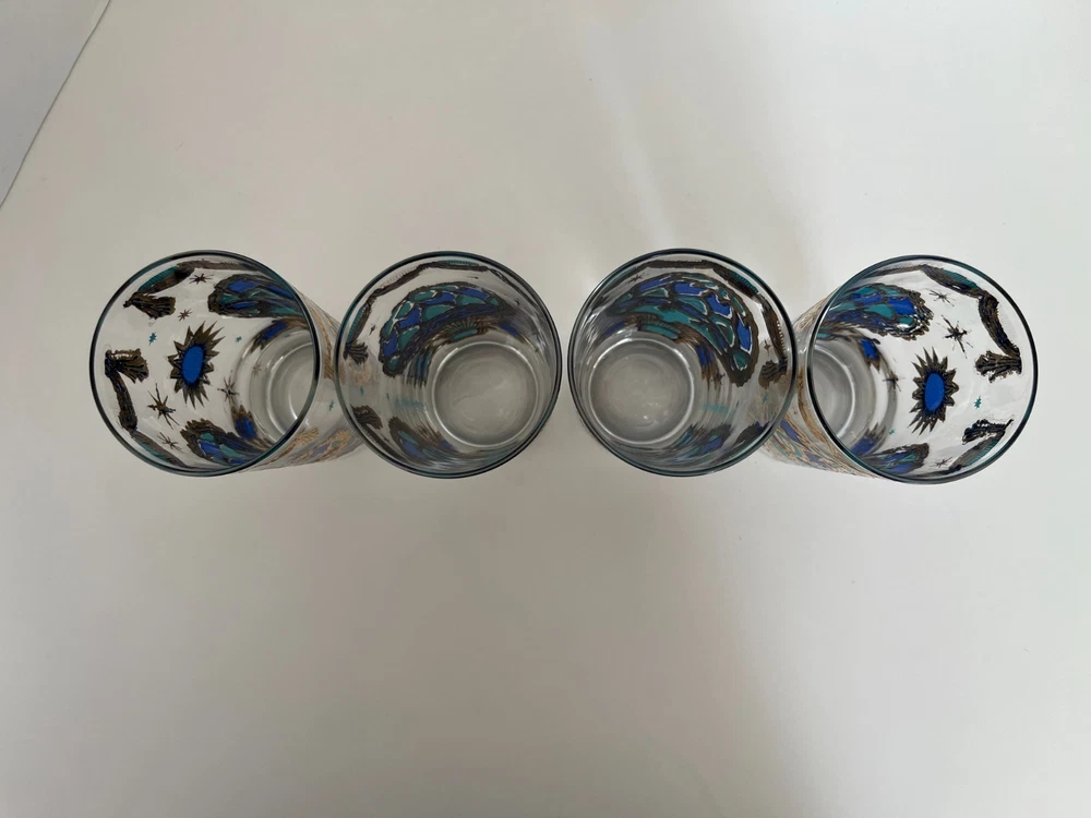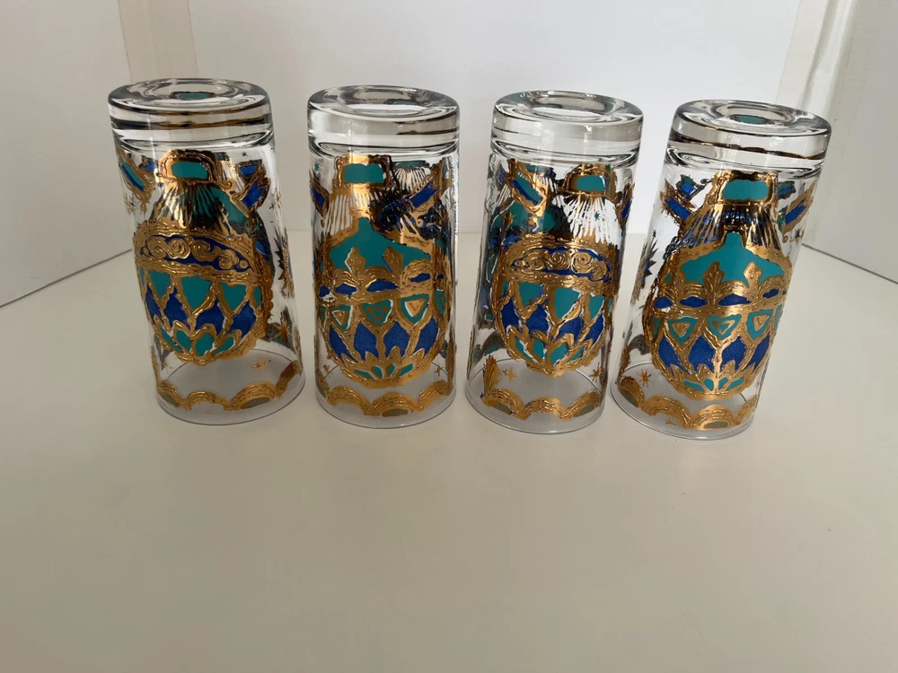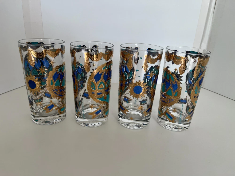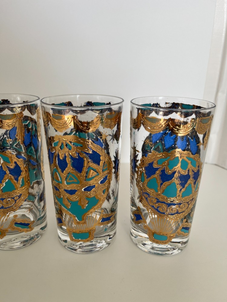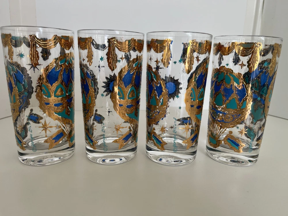 Georges Briard 22k gold gilt Hot Air Balloon high ball glasses/Vintage Barware/MCM tumblers/retro highballs/retro drinkware/HTF/Rare/VTG/60s Set of 4 RARE Georges Briard 22k gold gilt high ball tumblers featuring a hot air balloon and celestial motif in blue and green. These glasses are fun and kitschy with their over-the-top use of applied gold gilt and whimsical theme. The gold complements the rich blue and green colors well and they are sure to catch your eye! Each glass is signed by Georges Briard and is in great vintage condition. There are no chips or cracks but there is some very slight gold loss throughout. Please see the photos for more details regarding the condition. This pattern is very hard to find and is rarely on the market for purchase. This item is cross-posted to Etsy. Measures approximately- 5 5/8'' H x 2 3/4'' opening diameter All orders are shipped the next business day Monday-Saturday (as much as possible, however there may be an occasional delay due to unforeseen circumstances). This item will ship with insurance. Please note-Regarding shipping, I use clean recycled packaging materials whenever possible. Your item may arrive in a reused Amazon box (or another vendor). Items that are fragile will often be double-boxed for additional protection. All sales are final and sold AS-IS. If your item arrives damaged or you have a different issue with your order, before leaving feedback, please contact me to see what options I may be able to offer you. Thank you!!