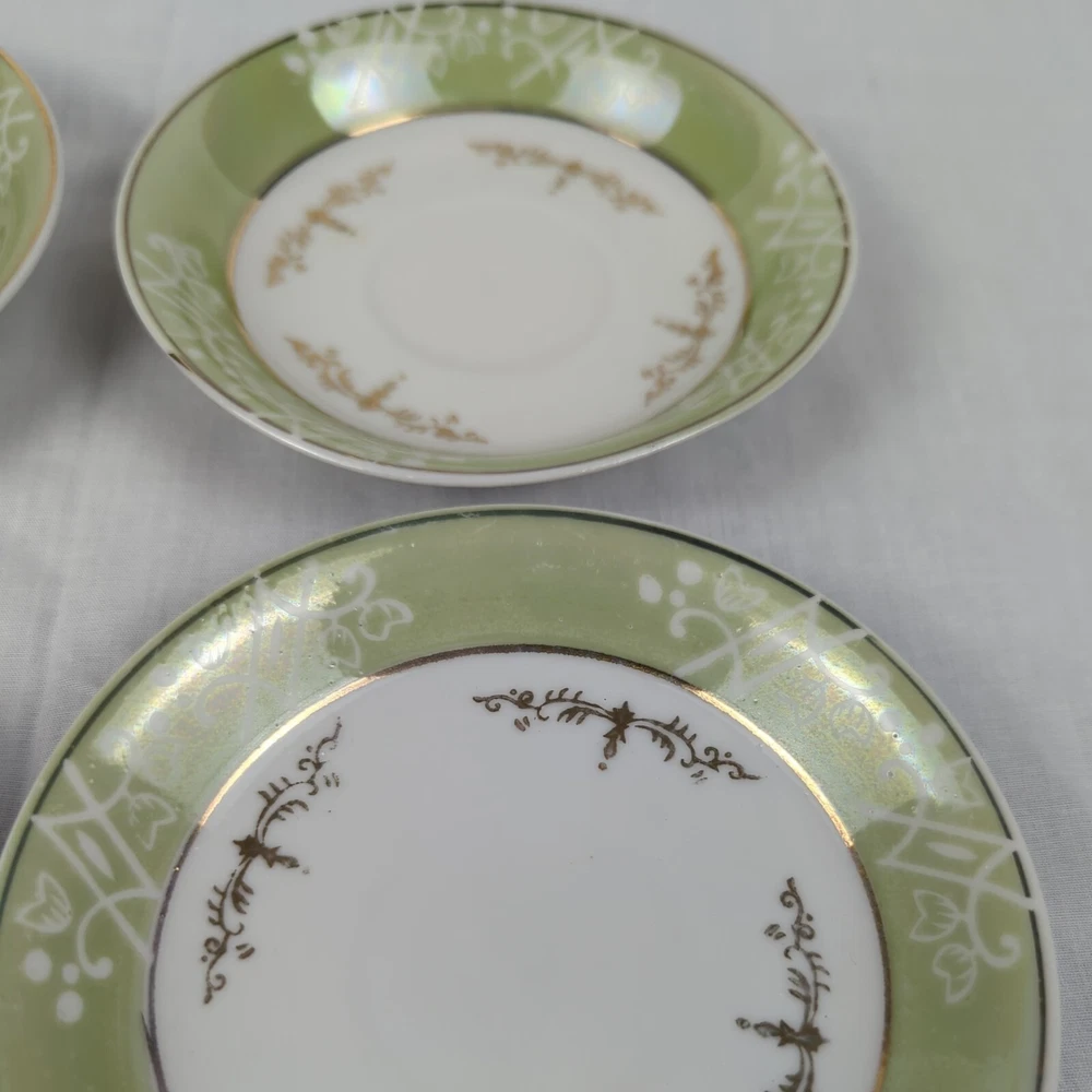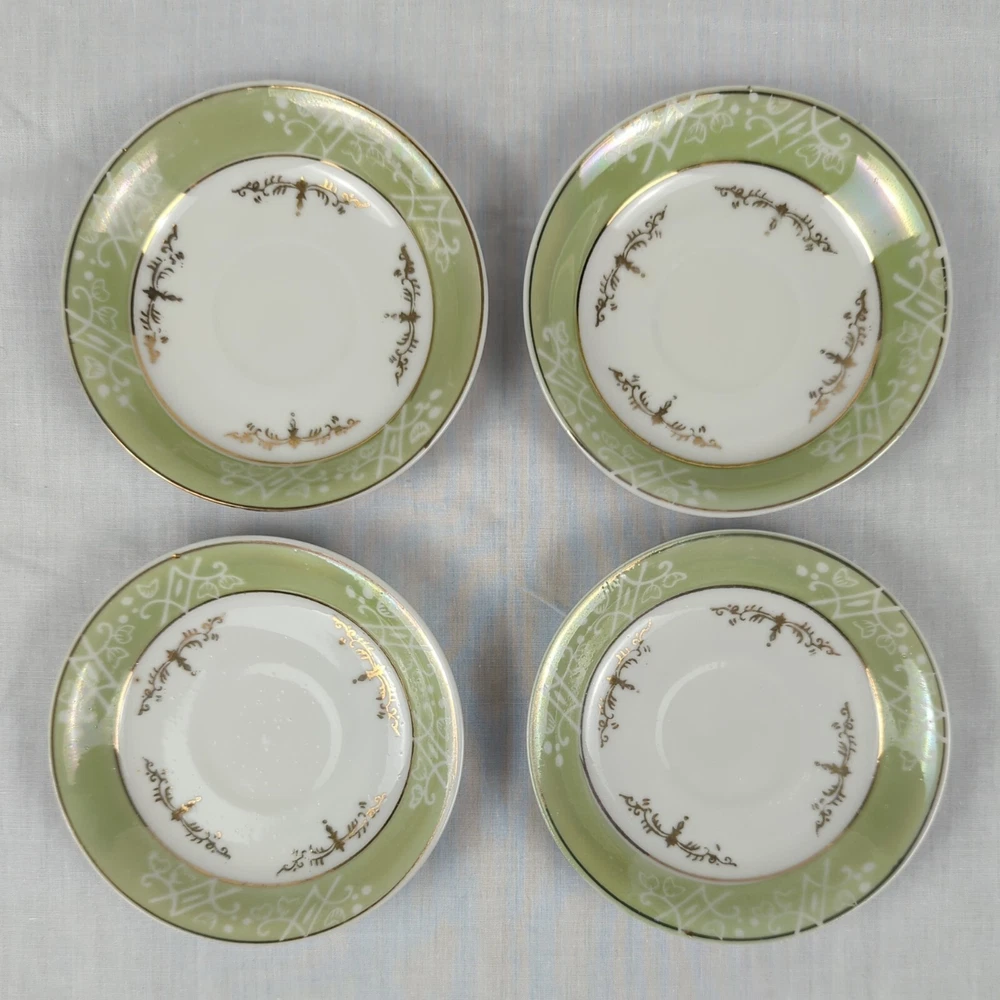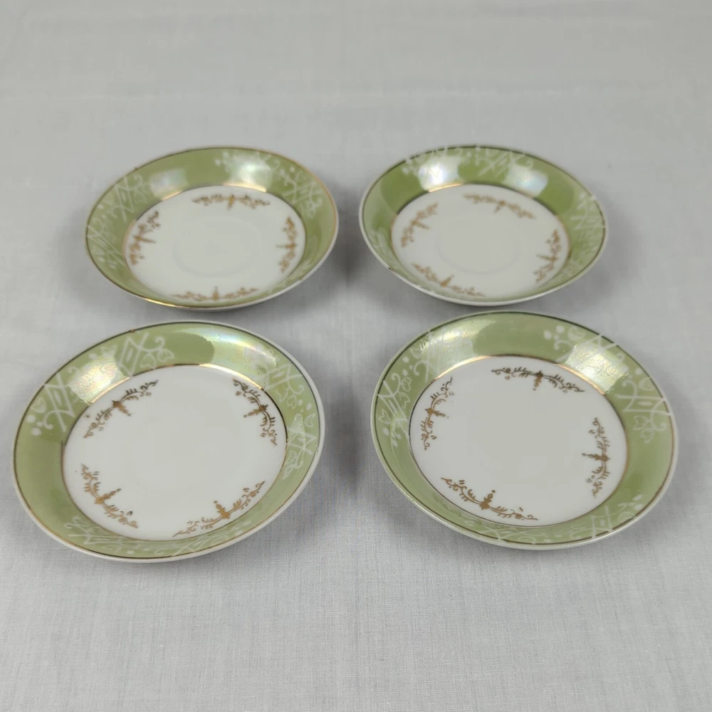 HomeSet of 4 Japanese Tea Cup Saucers Green with Gold & White Accents Japan Lot READ