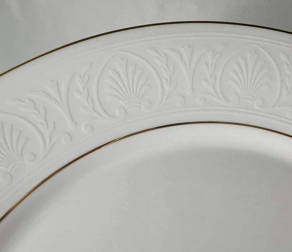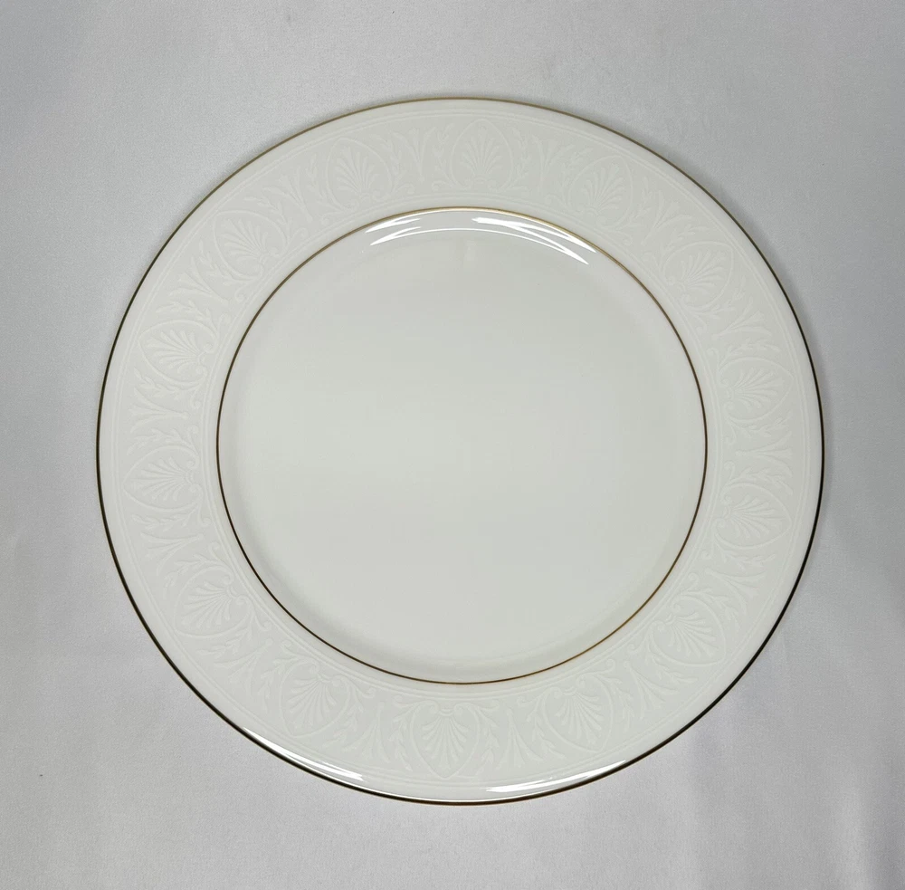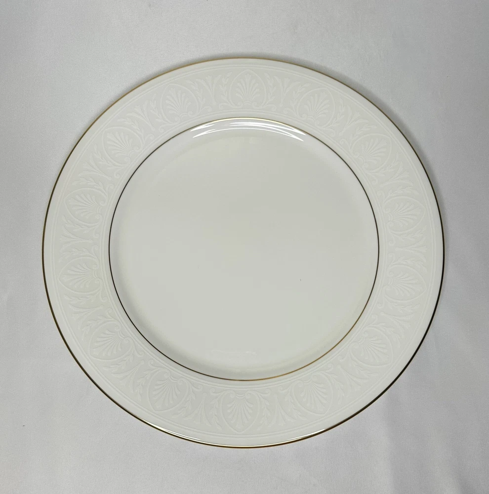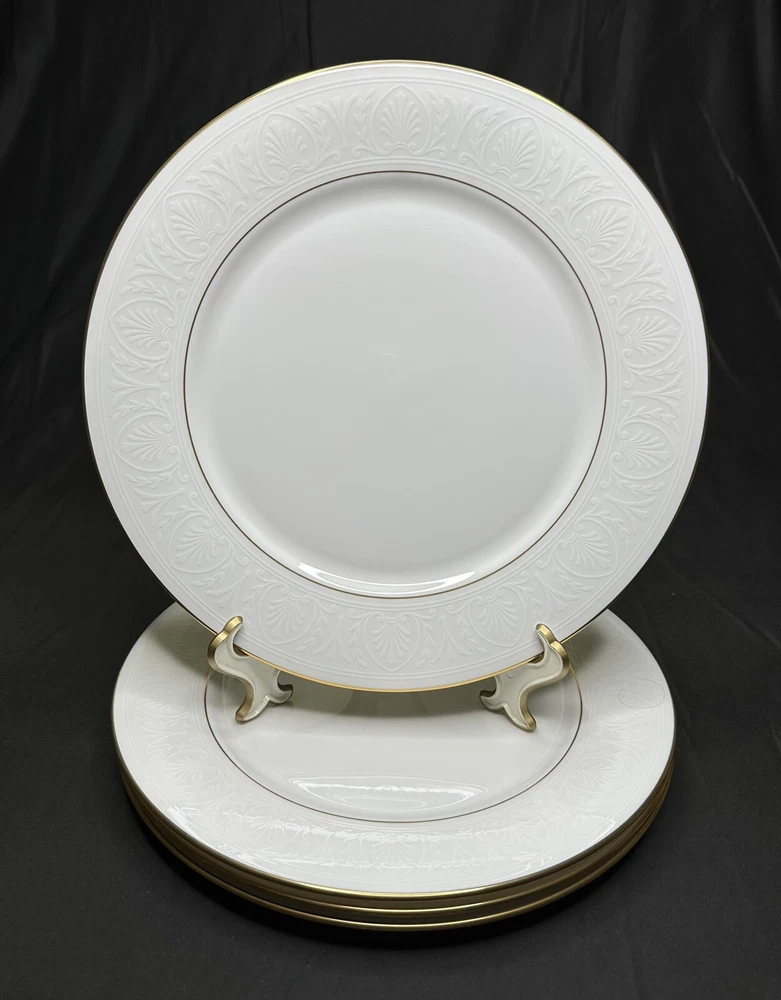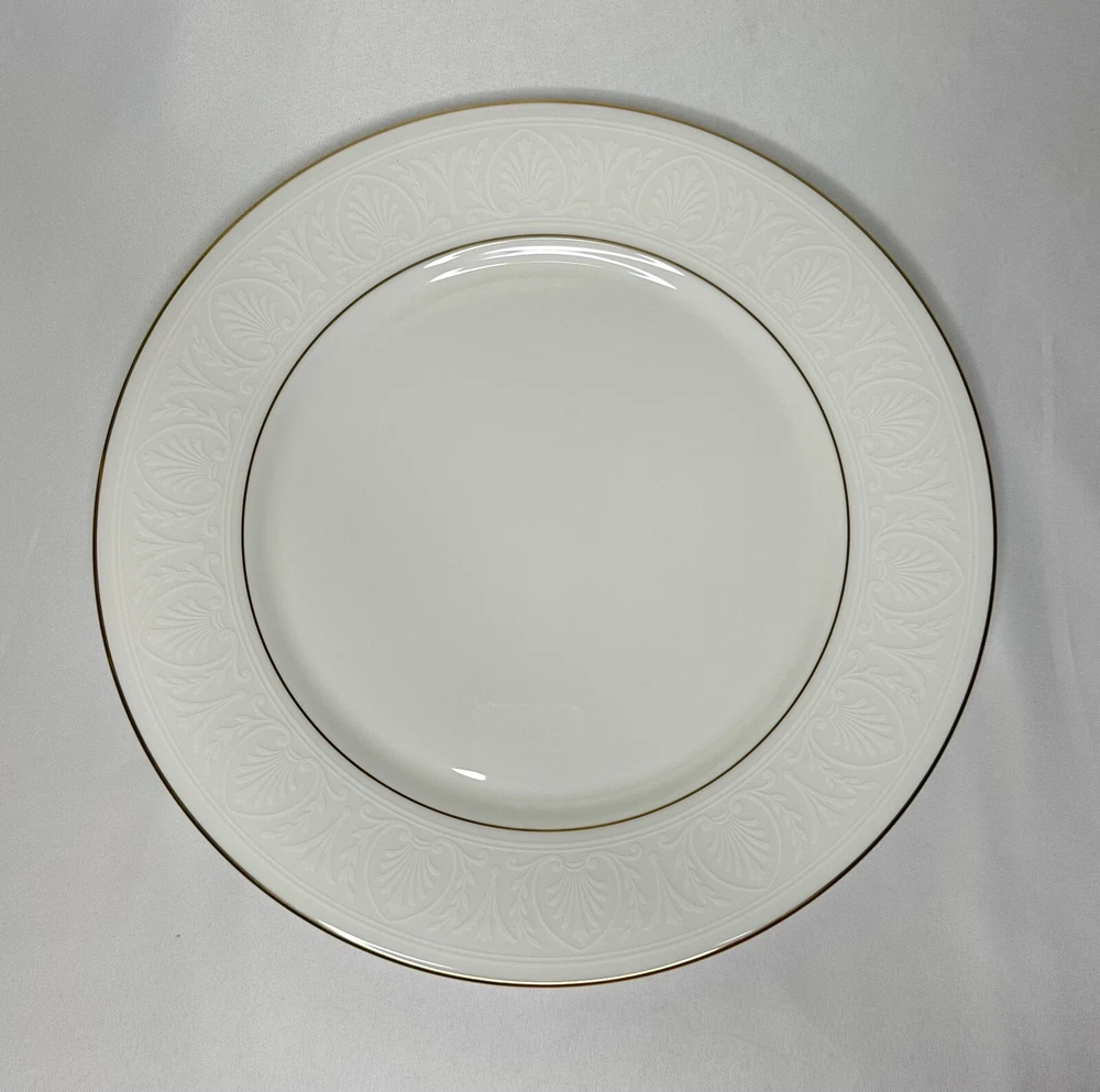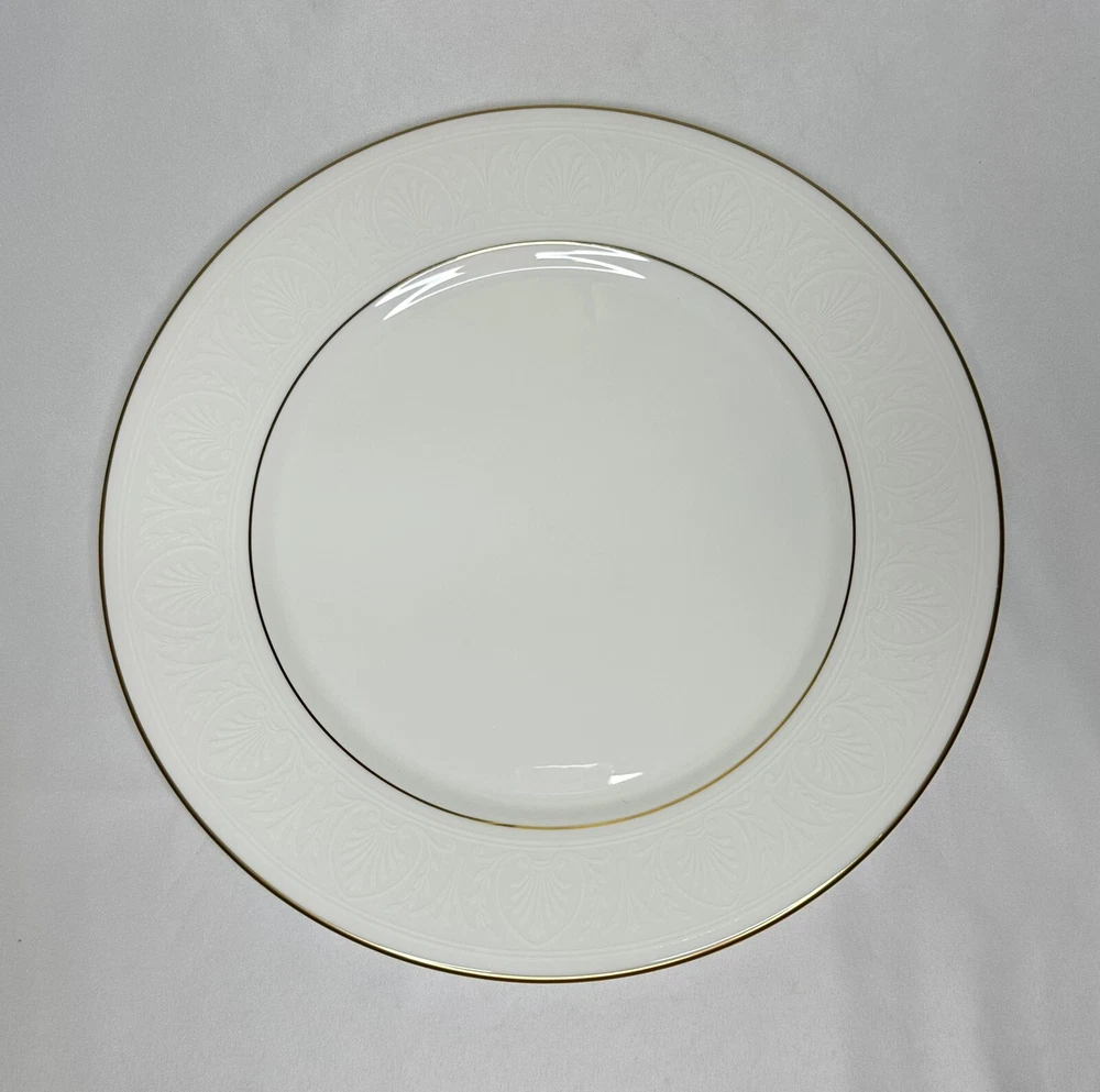 Set of 4 Lenox Hannah Gold Debut Collection Bone China Dinner Plates. Approximately 10 7/8” wide. Plates are in excellent pre-owned condition.