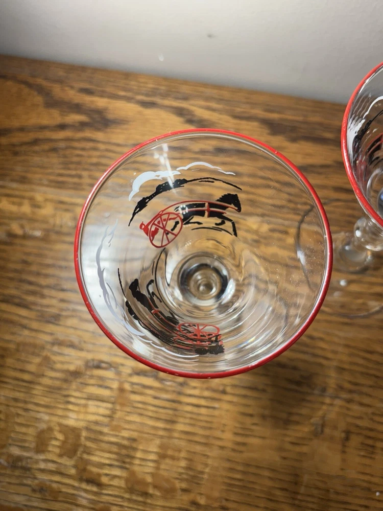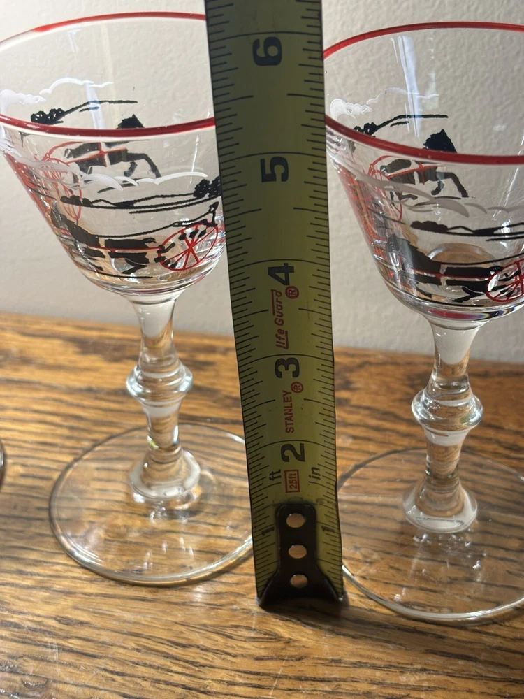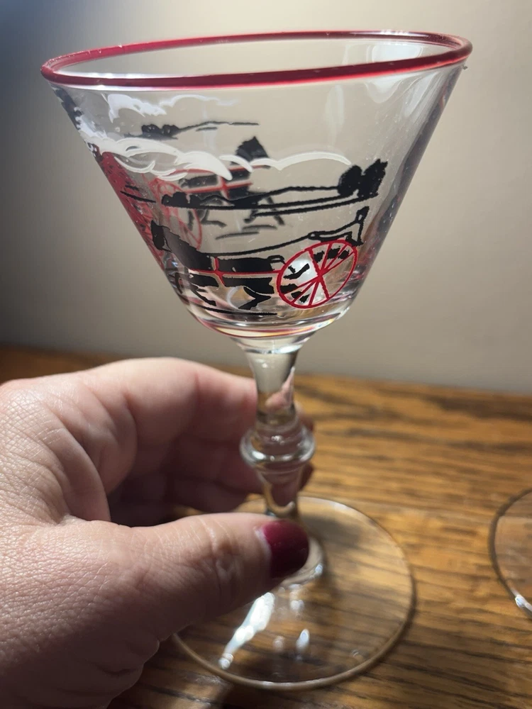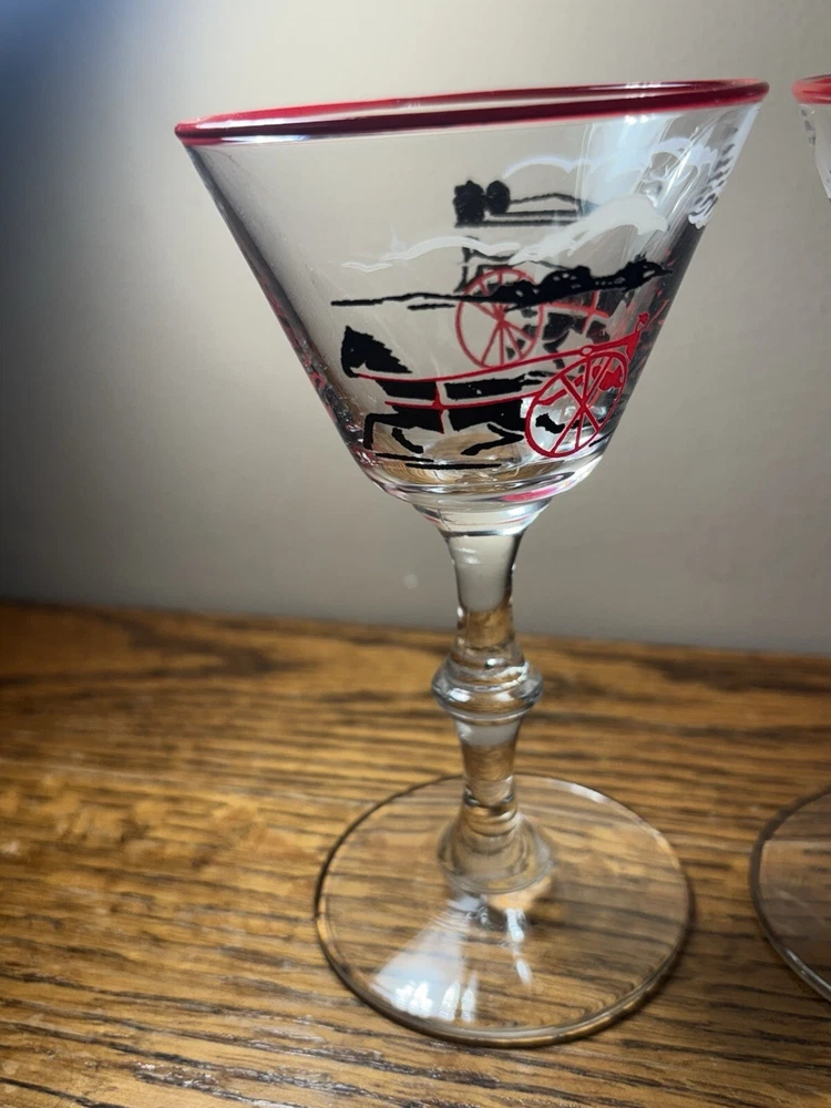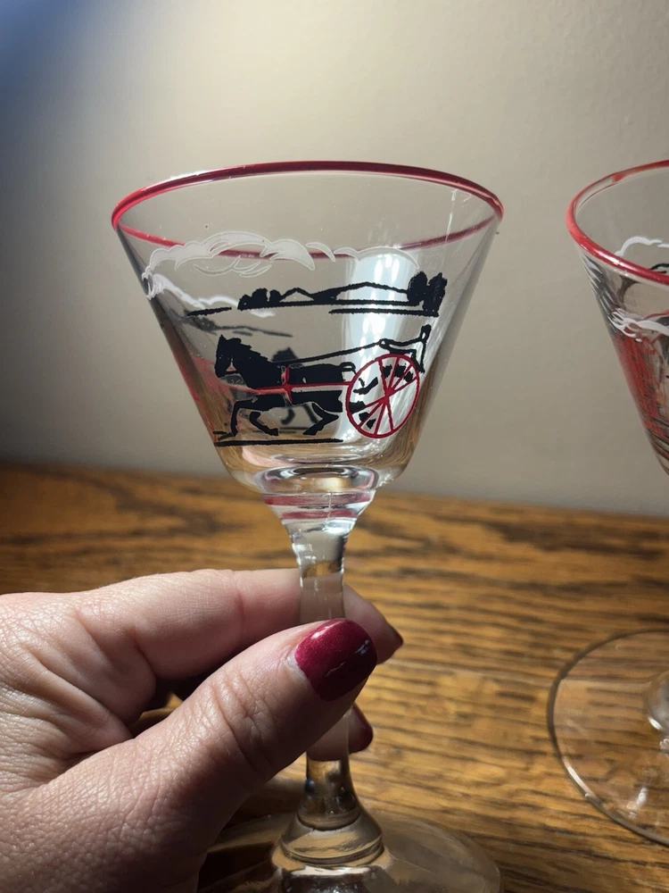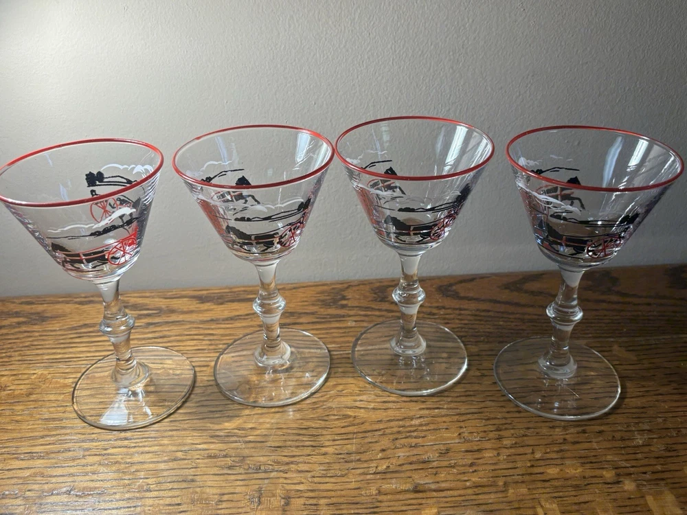 Add a touch of mid-century modern charm to your drinkware collection with this set of four Libbey Coaching Days Cordial Cocktail glasses. The glasses feature a colorful graphic print coach pattern and are made of pressed glass material. Each glass stands at 5.25 inches tall and has a round shape, making them perfect for serving cordials and cocktails. These vintage glasses are a great addition to any home bar or collection. They were produced in the United States using a fused glass technique and are perfect for entertaining guests. Whether you're hosting a party or just enjoying a drink at home, these glasses are sure to impress.