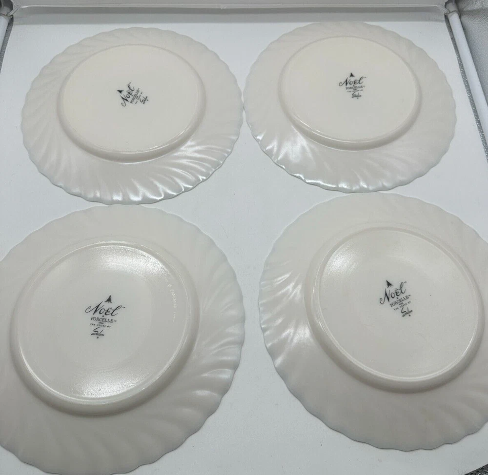 Add a festive touch to your dining table with this set of four Noel Porcelle plates. The white plates feature a beautifully designed Christmas tree pattern and are perfect for serving dinner, dessert, or even a bowl set. The plates are stackable, decorative, and stackable, making them a great addition to your collection. Crafted in France, these licensed reproduction plates are made of high-quality fluted porcelain and have a glossy finish. The set includes four plates, each measuring 10.5 inches in diameter. They are perfect for any Christmas occasion and will make your dining experience more enjoyable. Add a touch of retro style to your table with this beautiful set of plates.