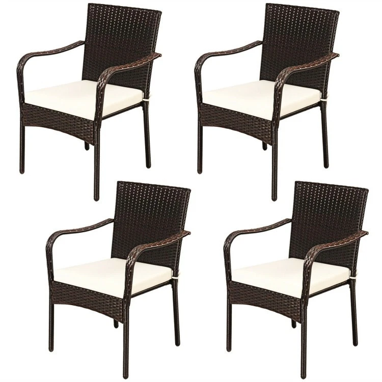 Set of 4 Patio Stackable Wicker Armchairs Garden Rattan Dining Seats W/ Cushions ● Stackable Design: Compared with other common outdoor chairs that can not stack, these 4 piece stackable outdoor patio wicker chairs offer great convenience. Therefore, when the guests visit your home, there are 4 both stylish and comfortable chairs for them. After that, you are able to stack 4 chairs on one pile for space-saving. ● Built for Comfort: The 4 pieces patio dining chairs feature soft seat cushions to provide you cozy sitting experience. And the cushion with zipper for convenient cleaning. At the same time, the widened backrest and ergonomic armrests fit your body to relieve fatigue. ● High Quality Materials: Constructed of weather-resistant PE rattan, waterproof seat cushion and anti-rust steel frame, these premium patio chairs are perfect for outdoor use, ensuring long service time. Meanwhile, the sturdy construction supports up to 350 lbs for each chair. ● Great Choice for Outdoor: These 4 pieces rattan chairs create comfortable places for friends and family gathering around, enjoying delicious dinners together. Hence, these 4 pcs rattan bistro armchairs are a great addition to your poolside, garden, backyard and patio, etc. ● Easy Installation: With detailed and easy-to-understand instruction, this outdoor dining set is easy to assemble. Dimension of each chair: 24" x 23" x 34" (L x W x H), seat height from the ground: 18", dimension of seat cushion: 18.5" x 18" x 2" (L x W x Thickness). Color: Brown, beige Material: PE rattan, steel Dimension of each chair: 24" x 23" x 34" (L x W x H) Dimension of each seat cushion: 18.5" x 18" x 2" (L x W x thickness) Seat height from the ground: 18" Net weight of each chair: 11 lbs Weight capacity of each chair: 350 lbs