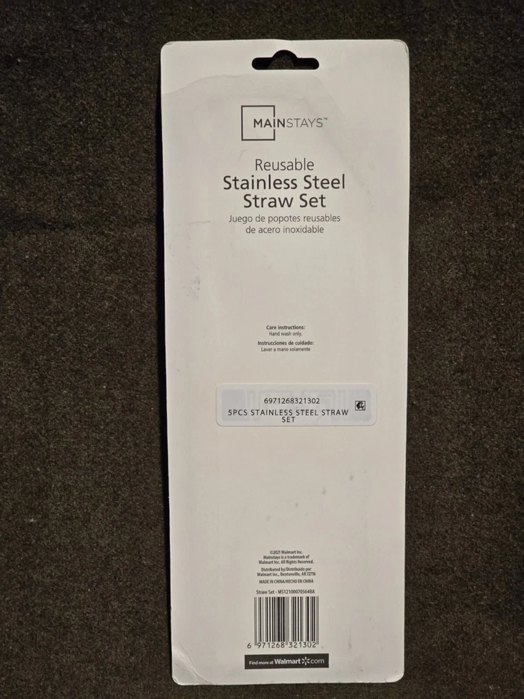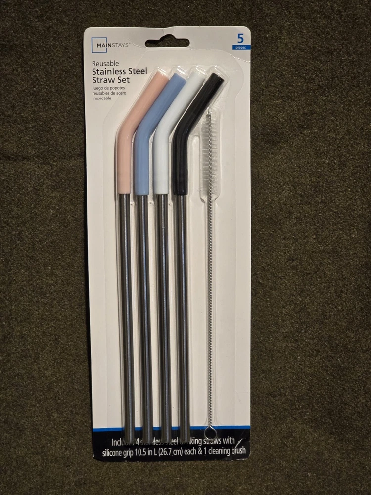 The product is a set of four reusable metal straws made of stainless steel, accompanied by a cleaning brush. Each metal straw is 10.5 inches in height and features a solid color design - pastel pink, pastel blue, white, and black. It is intended for use by boys, girls, and adults for beverages, with a drink. The straws come with a straw cleaning brush and should be hand washed. The brand is Mainstays and the straws are made in China.