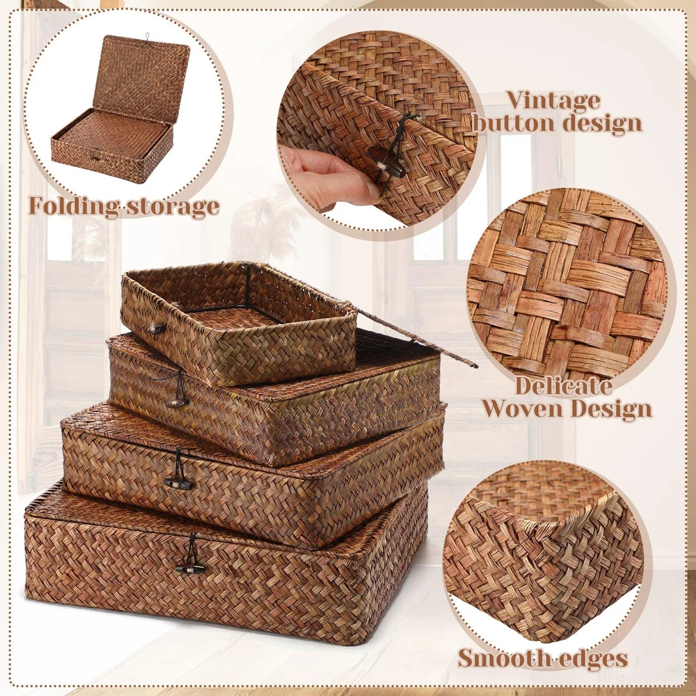 Seagrass Basket with Lid Set: we will provide you with 4 pieces of decorative storage boxes with lids, designed in 4 different sizes, suitable size to place on shelves, tabletop, drawer, bathroom counter, kitchen cabinet and more Reliable Material: our woven baskets for storage with lid are made of quality seagrass material, lightweight but strong enough, a combination of natural materials, and no unhealthy materials, which can be safely applied in your daily life 4 Sizes: the wicker storage basket comes with 4 sized trays, namely, approx. 10.24 x 6.3 x 2.17 inches/ 26 x 16 x 5.5 cm, 14.17 x 11.81 x 3.54 inches/ 36 x 30 x 9 cm, 12.6 x 11.02 x 2.95 inches/ 32 x 28 x 7.5 cm and 11.02 x 9.45 x 2.52 inches/ 28 x 24 x 6.4 cm, which can meet your different size needs Safe and Convenient: the flat basket is designed with a lid, keeping your room tidy and neat, enabling you to find what you need fast; Meanwhile, there is a wood button and strap for locking, inner items would not fall out once when it is locked Decorative Tabletop Organizer: the wicker storage bins can be applied in living room, dining room, kitchen counter, ottoman, coffee table, bathroom counter, vanity, desk, farmhouse, keep the things in one place and add a rustic look to your home