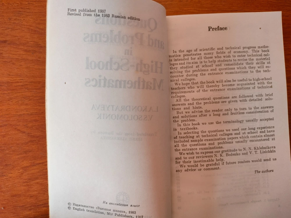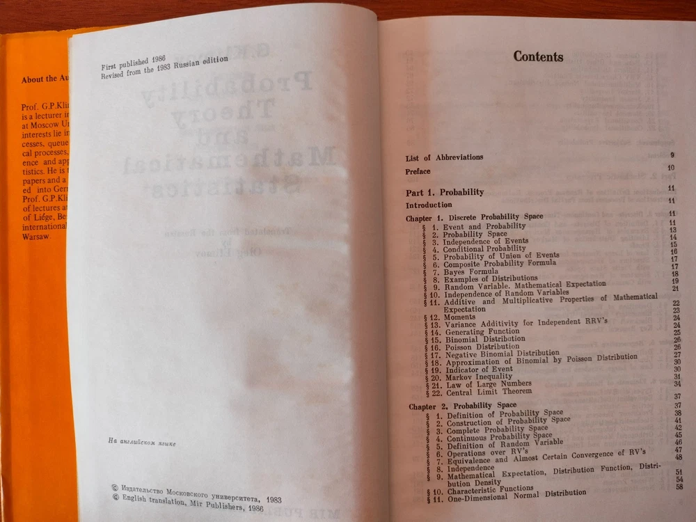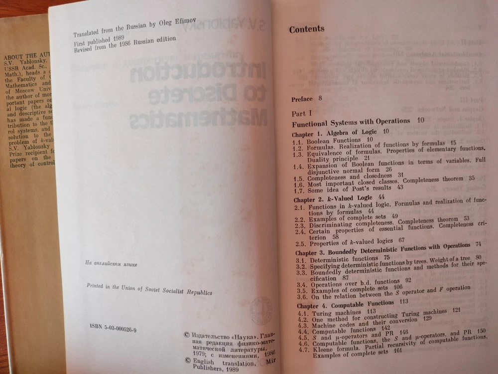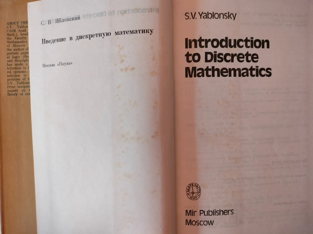 Book are in good condition. Please drop me a message if your want any specific details. 1.Algebra by S. M. Nikolsky M. K. Potapov Mir Publishers Moscow 1987 326 Pages. ( The front cover has a little bit of dirt, as seen in the images.) 2.Probability Theory and Mathematical Statistics G. Klimov Mir Publishers Moscow 1986 333 Pages. (The dust jacket is dirty due to dust and has some wear and tear.) 3. Introduction to Discrete Mathematics by S. V. Yablonsky 1989 384 Pages. (The dust jacket has some wear and tear, and some stains, as seen in the images.) 4.Questions Problems in High School Mathematics by L. A. Kondratyeva, V. S. Solomonik Mir Publishers 1987 268 Pages. (The cover shows some wear and tear, and there are two insect attack holes going from the front to the middle of the book, but they do not hinder reading.) Please check my store for more amazing rare books. Why I don't accept returns? - If you read the description and images, you will understand I have tried my best to describe the conditions exactly. You will see if there are any damages. I can assure you that you will receive in the exact same condition or better than that.