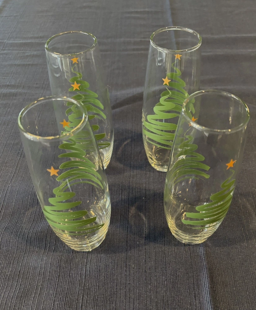 The product is a set of 4 contemporary stemless wine glasses designed for Christmas celebrations. The glasses feature a fluted shape and are made of clear glass, perfect for enjoying champagne during the holiday season. Each glass is adorned with a Christmas tree motif, adding a festive touch to your table setting. Ideal for serving drinks at Christmas gatherings, these stemless wine glasses combine modern style with a holiday theme for a cheerful and elegant touch to your celebrations.