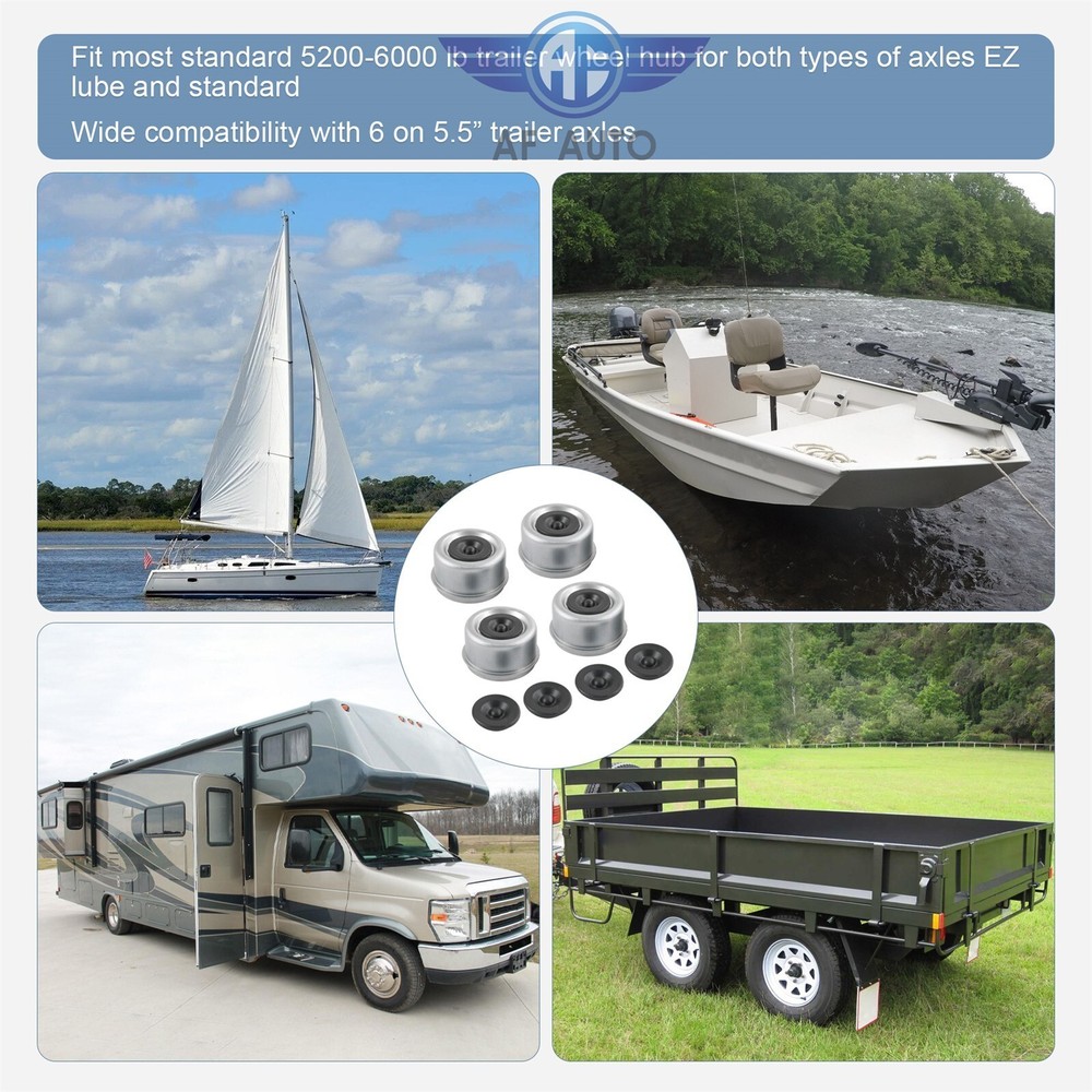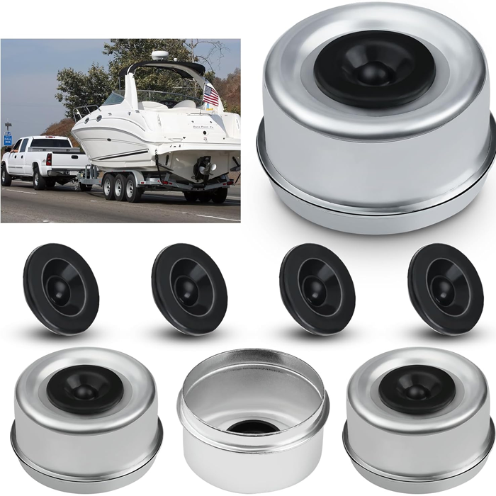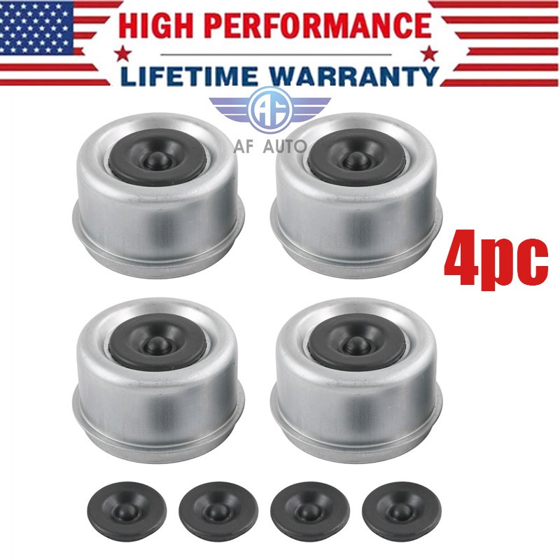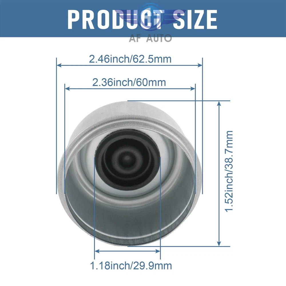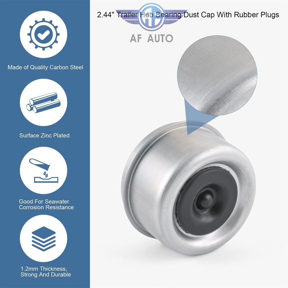 Product Description 2.44" Trailer Axle Dust Cap with Rubber Plugs - 4PCS Fitment Fits Most 2000-3500 Pound Axles Fit standard brake & idler trailer axles for most 4 lug & 5 lug axles with 2.44" diameter cap Package Include 4pcs 2.44 inches trailer axle covers 4pcs extra rubber plug Dimension Reference image size data The trailer axle cap is designed to avoid the trailer axle from dust, preserve the grease, prevent axle corrosion and as decoration Hub grease caps are designed with removable rubber plugs, easy to install and maintain In order to install firmly, the axle dust cap is slightly larger by design. You need to knock it into place using a wood block and hammer or rubber mallet, to prevent denting the cap while installing powered by