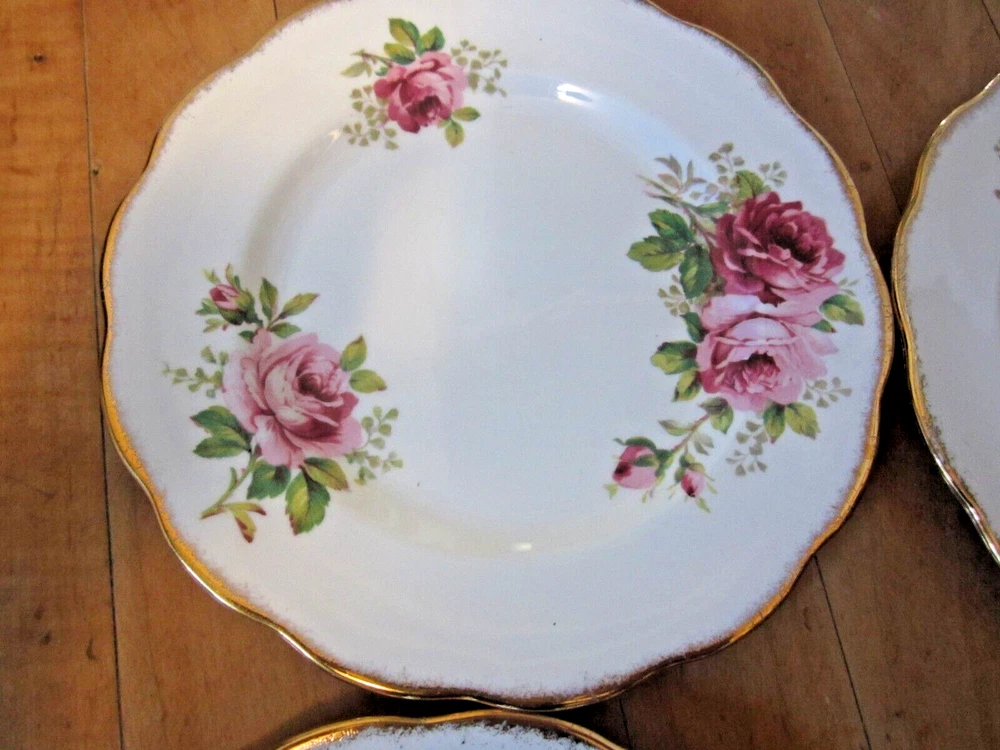 Enhance your dessert course with this exquisite set of 4 Royal Albert American Beauty dessert plates. Each 8-inch plate showcases a stunning display of roses, embodying the timeless elegance of mid-century design. Crafted from fine bone china, these plates originate from the United Kingdom and carry a printed backstamp authenticating their Royal Albert heritage. The set boasts a multicolored glazed finish, with a round shape that complements any table setting. Perfect for all occasions, these plates are not only functional but also serve as a decorative piece to cherish. Adhere to the hand wash only care instruction to maintain their beauty and ensure longevity.