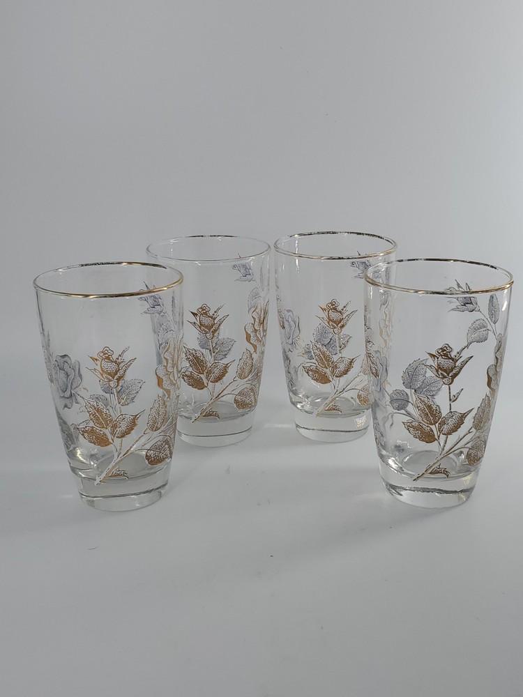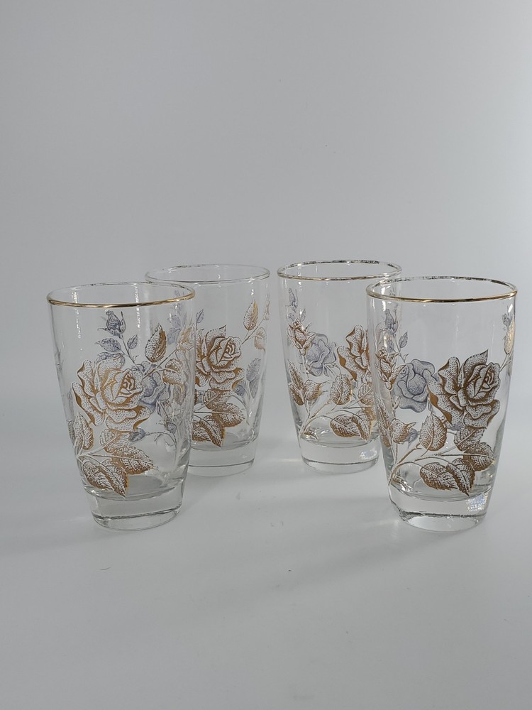 This set of 4 Vintage Libbey Rose Bouquet Tumblers from the 1960s features a floral pattern, gold rim, and an iridescent finish. These 12 oz tumblers are perfect for all occasions and have a decorative floral theme. Made in the United States, these vintage tumblers are a charming addition to any barware collection. The elegant design and pressed glass production style make them a unique piece for any home. Do not put in dishwasher. No chips or cracks. There is some gold loss on the glass rim. See pictures.
