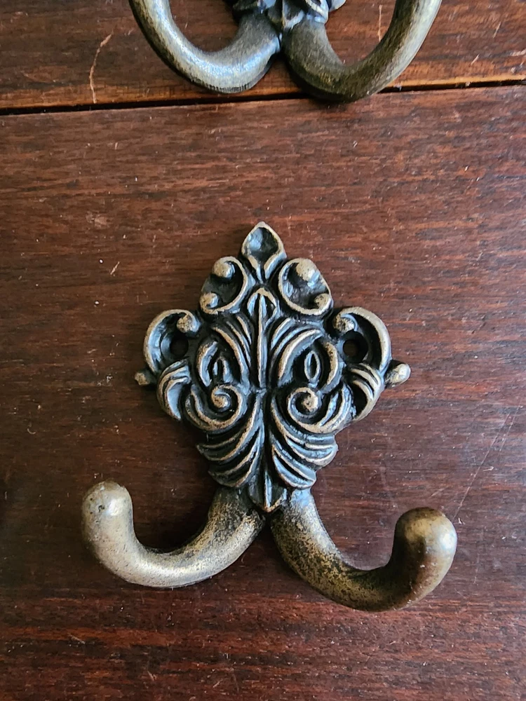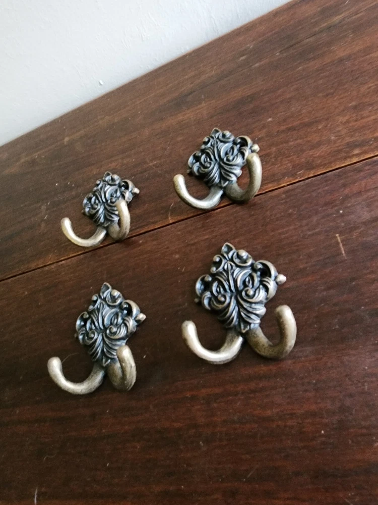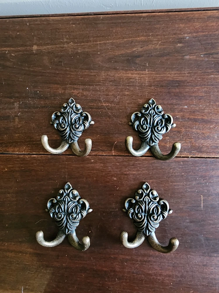 Set of 4 Wrought Iron Metal 2 Peg FLoral Wall Hanging Hook Coat/Towel Gold Tone
