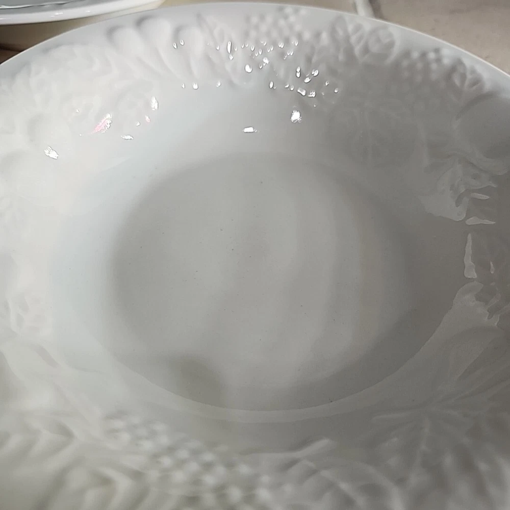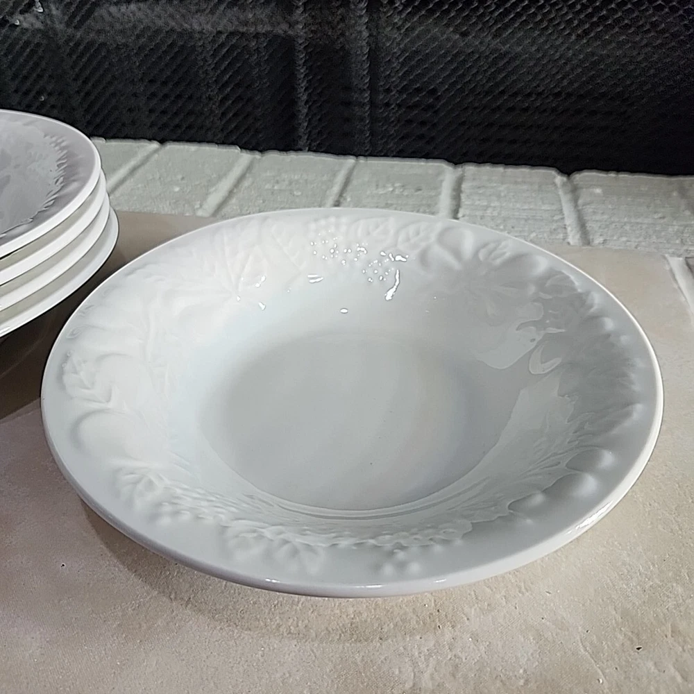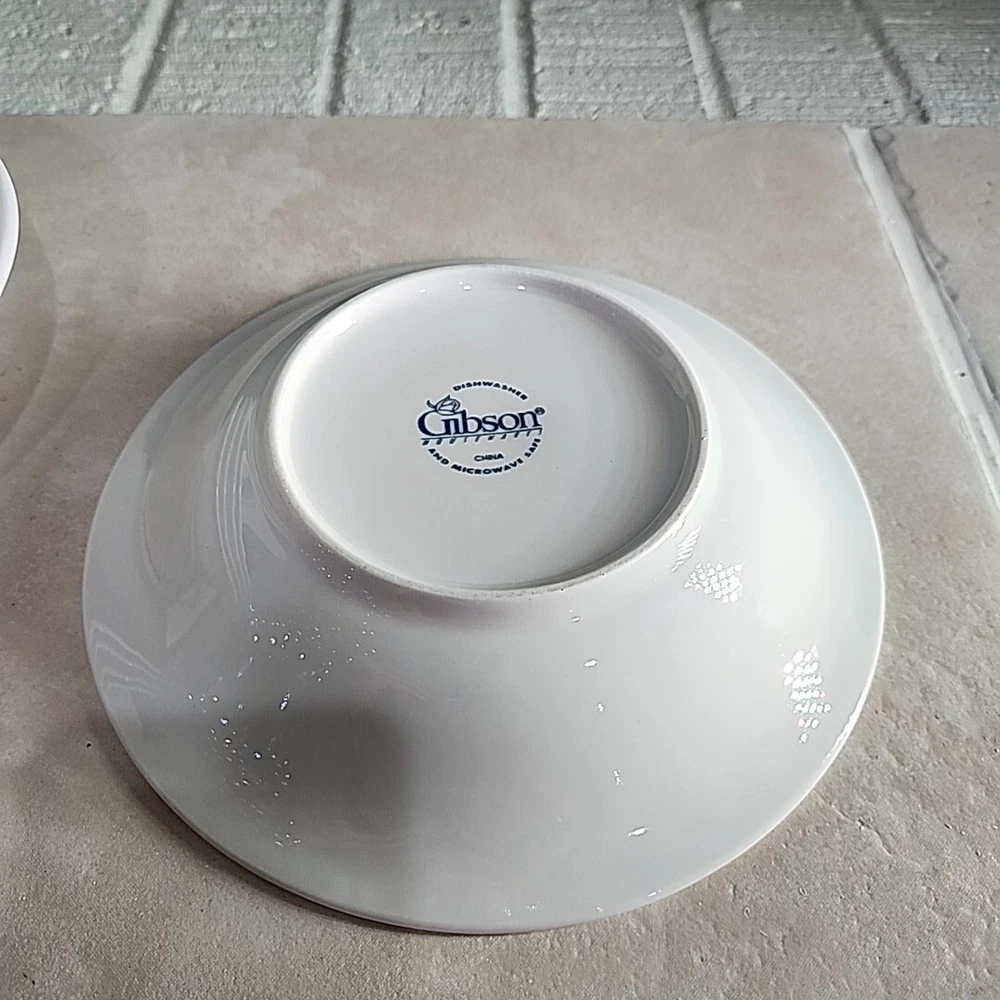 Add a touch of elegance to your dining table with this set of 5 Gibson Housewares soup bowls. The white porcelain and ceramic material make them perfect for all occasions. The embossed fruit pattern, inspired by the four seasons, adds a touch of nature to your table setting. These round salad bowls are approximately 8 inches in diameter and are perfect for serving soup, salad, or any other dish. The fruit design is a great addition to your collection and will make your meals more enjoyable. Made in China, these bowls are a great addition to your pottery and glass collection. Condition is shown above, Check my page for the rest of the set!