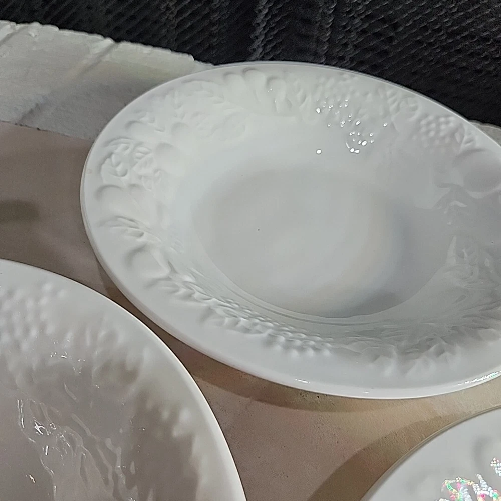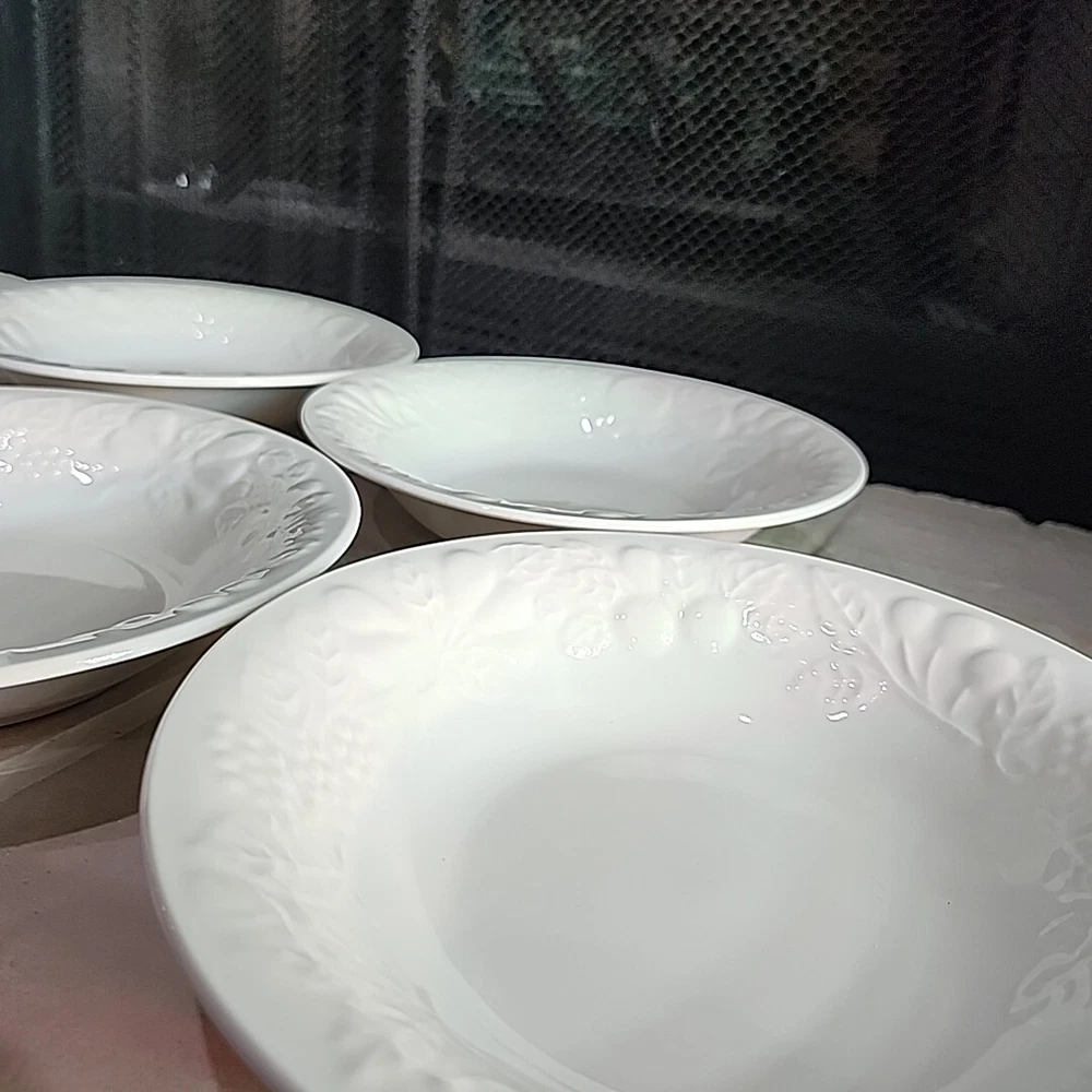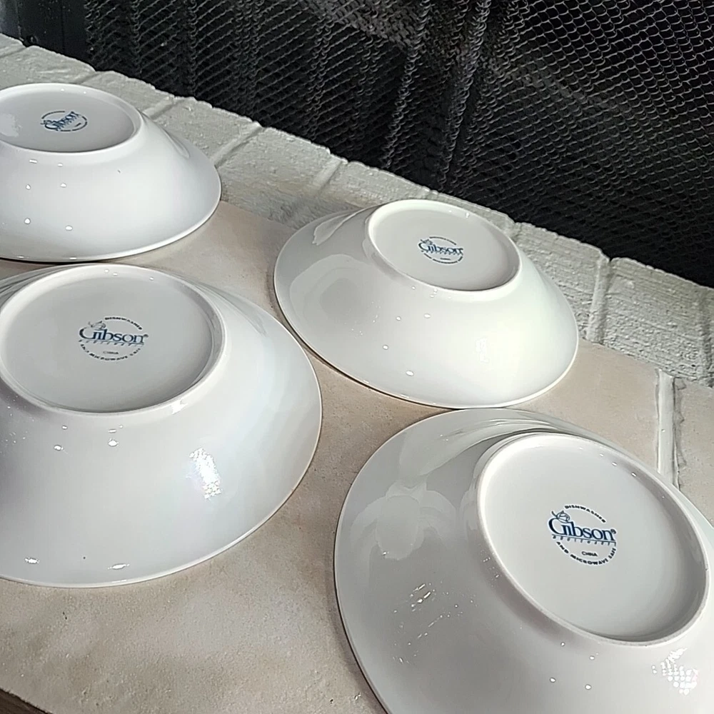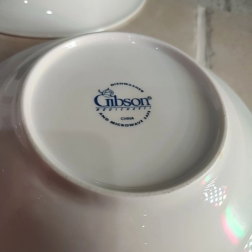 Add a touch of elegance to your dining table with this set of 5 Gibson Housewares soup bowls. The white porcelain and ceramic material make them perfect for all occasions. The embossed fruit pattern, inspired by the four seasons, adds a touch of nature to your table setting. These round salad bowls are approximately 8 inches in diameter and are perfect for serving soup, salad, or any other dish. The fruit design is a great addition to your collection and will make your meals more enjoyable. Made in China, these bowls are a great addition to your pottery and glass collection. Condition is shown above, Check my page for the rest of the set!