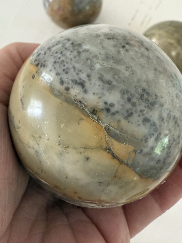 Bring timeless beauty and natural energy into your home with this set of 5 polished natural stone crystal spheres. Each ball measures approximately 3 inches (7.5 cm) in diameter and features unique colors and patterns of jasper, onyx, and other natural stones. Perfect for collectors, home décor, meditation, or as a thoughtful gift. • Lot of 5 spheres – all included • Size: approx. 3” (7.5 cm) each • Polished smooth finish • Natural stone – every piece is unique • Great for feng shui, display, or energy work ✨ Add a touch of elegance and grounding energy to your space.