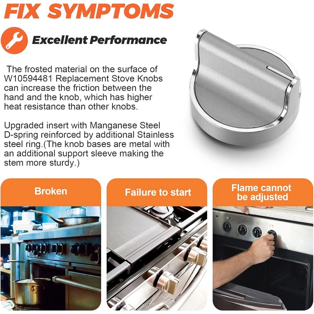 Product Specification Type Stove Knobs Color Silver Material ABS+Zinc Alloy Qty 5PCS Model Info: W10594481 WPW10594481 AP6023301 Item model number: W10594481 WPW10594481 AP6023301 Part Number: W10594481 WPW10594481 AP6023301 Compatible Brand : Whirlpool Product Dimensions 1.91"L x 1.67"W Specific Uses For Product Lets you control the heat of the surface burner on the cooktop by controlling the size of the flame Special Feature With the specifications of the original knob, while upgrade and reinforced knob material, shaft Item Weight 13.4 Ounces Handle Material Stainless Steel Unit Count 5.0 Count Item Weight 13.4 ounces Voltage 120 Volts Assembled Diameter 1.9 Inches Package Included: 5 x W10594481 Stove Knobs On Nov 16, 2025 at 19:04:09 PST, seller added the following information: