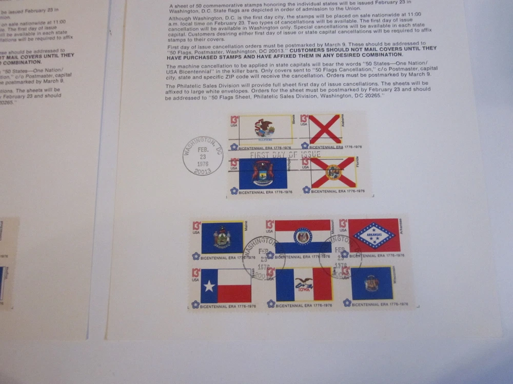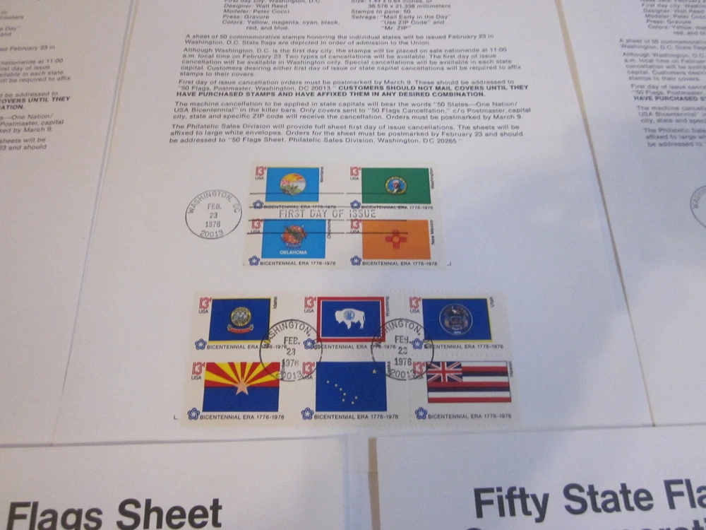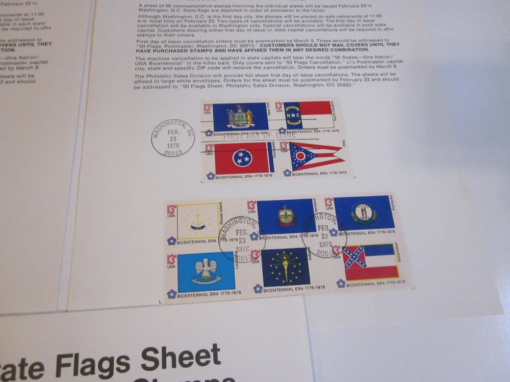 Explore the vibrancy of American heritage with this unique set of 50 State Flags from a 1976 First Day Cover, presented on advertising sheets. Each sheet features 10 colorful flags, capturing the essence of the United States' rich history and culture. These advertising sheets are a great way to display or store your collection, and they make for an eye-catching addition to any postal history collection. The flags are a denominational representation, each bearing the 13-cent stamp, and were issued between 1971 and 1980. Originating from the United States, the items are of used quality, multi-colored, and ungraded. The set celebrates the first day of issue, adding a special touch of nostalgia and authenticity to your collection.