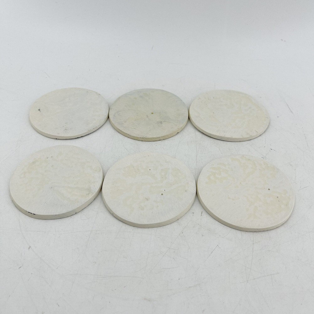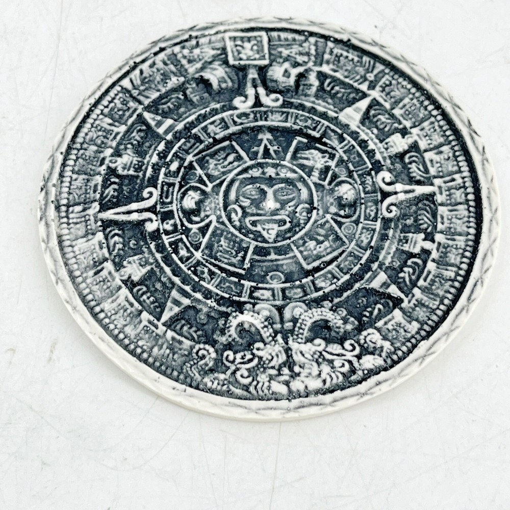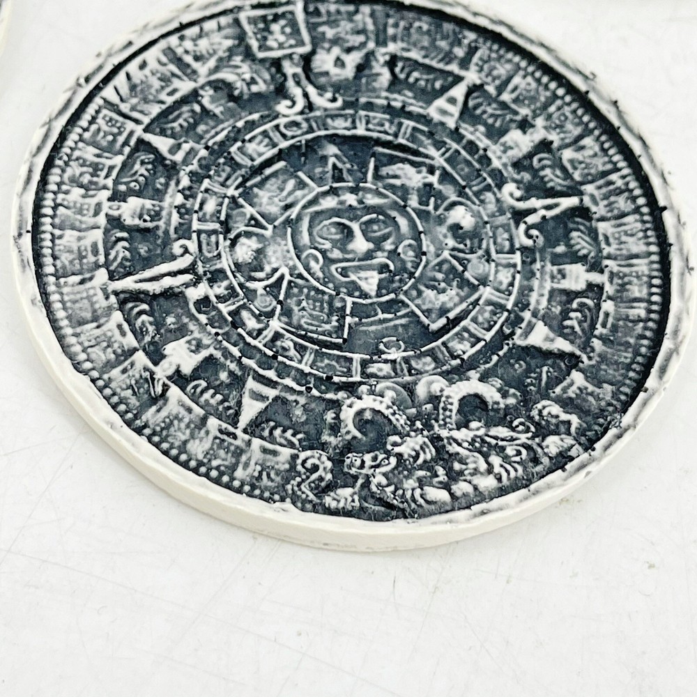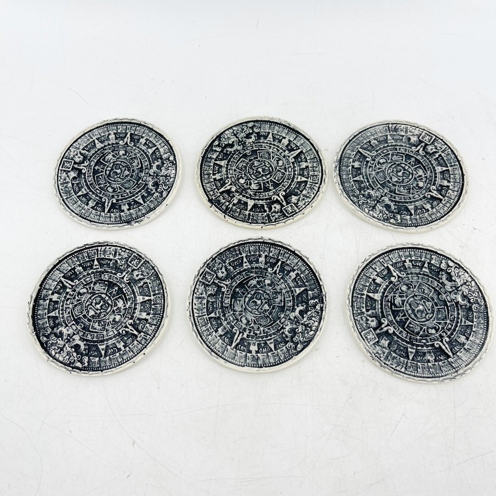 Set of 6 Aztec Calendar Drink Coasters Molded Resin Ceramic Barware Liquor Hand molded - all vary slightly in diameter. 3" to 3 1/4"