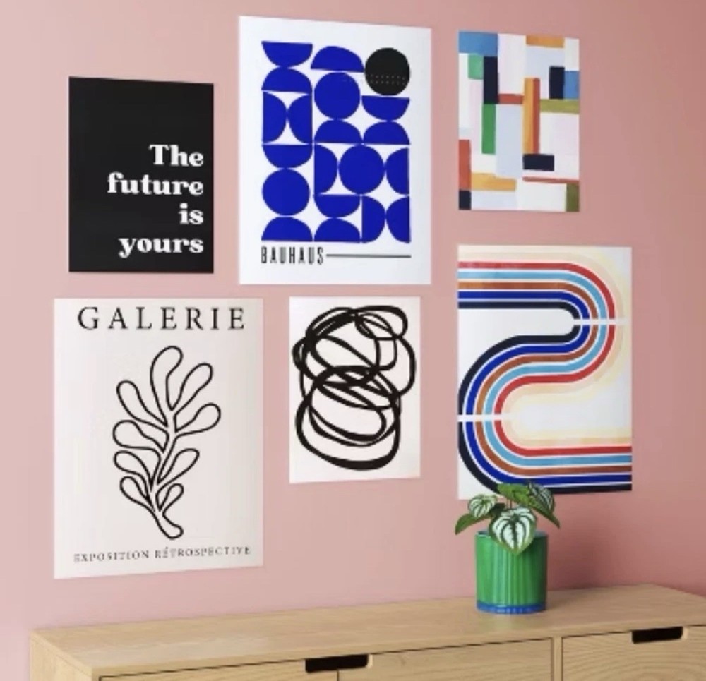 The product is a set of 6 printed posters designed for decorating a dorm room with an adhesive modern movement style. These posters are likely to feature a visually appealing and contemporary design, perfect for adding a modern touch to the room. The adhesive backing makes it easy to apply to the walls, creating a hassle-free way to enhance the overall aesthetic of the space with a bold and stylish statement.