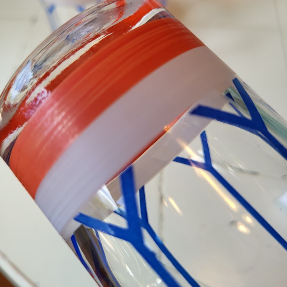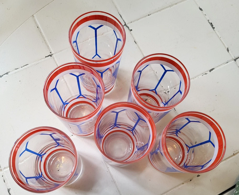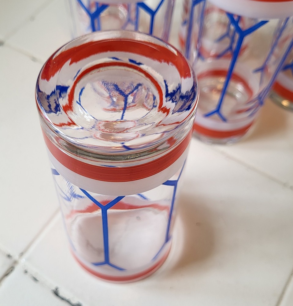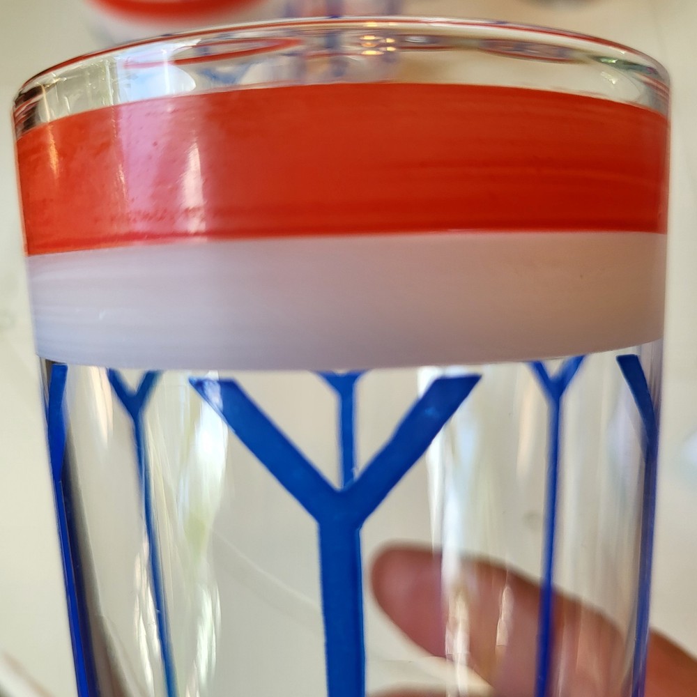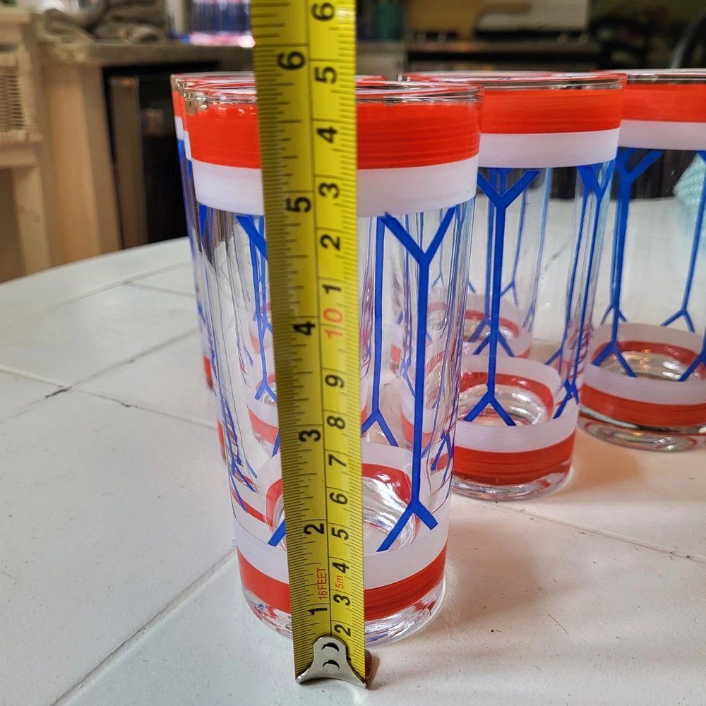 This set of six Gad Fad style glass tumblers is perfect for all occasions. The red, white, and blue colors are handpainted on each tumbler, making them unique and one-of-a-kind. Each tumbler has a capacity of 9 oz and stands at 5.75 inches tall. The drum design make them perfect for mid-century modern decor. The Americana theme and glassware type make them great for drinking glasses. This set includes six tumblers and is perfect for serving drinks to your guests.