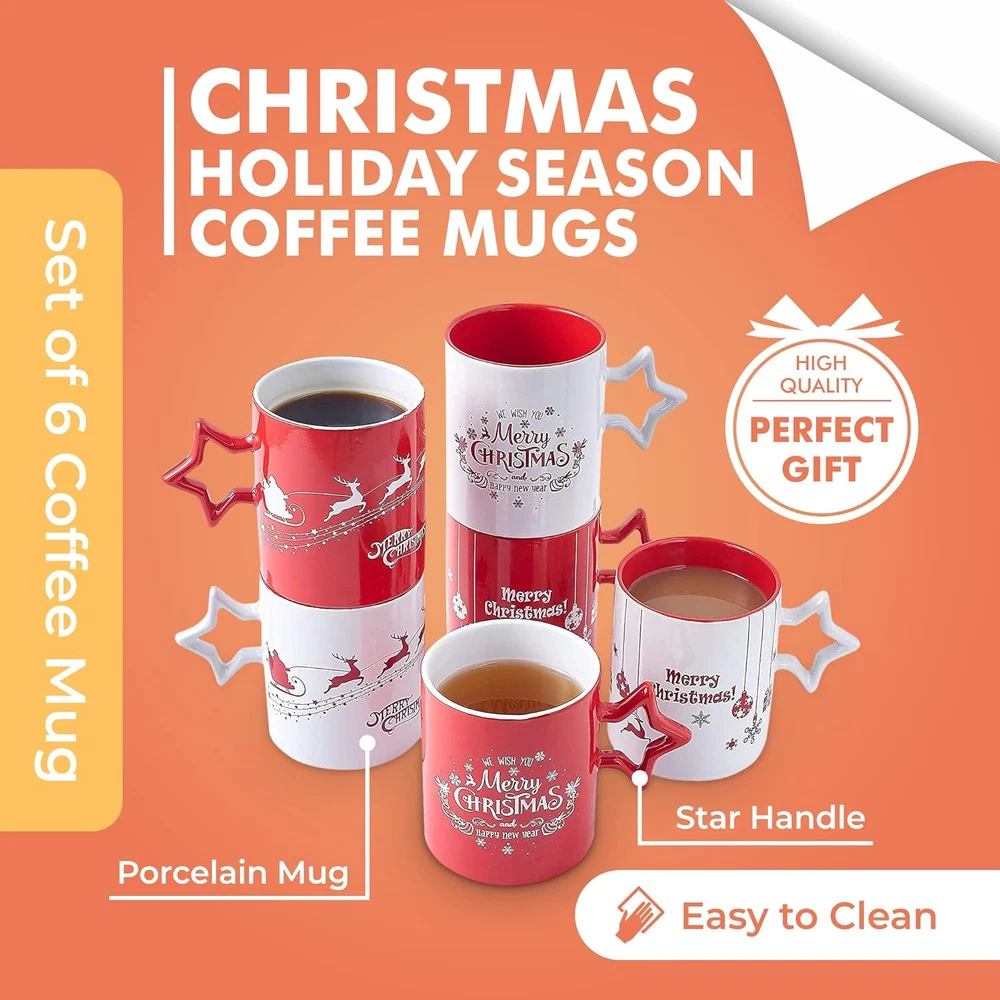 Perfect for All Drinks: These ceramic coffee mugs are ideal for coffee, tea, hot cocoa, and all other drinks, whether hot or cold. These mugs can be used for festive DIY baskets or coffee gift sets. Tea Cup: Start your morning with a festive-twist using our women's special tea cups. These festive caffeinated beverage cups come in an attractively designed seasonal spirit gift box. The Ideal Present Set for All: This ceramic tea cup is a perfect gift for men and women during winter festivities or New Year celebrations, making it a thoughtful token for family and friends. Festive Spirit: These delightful mugs, adorned with delightfully illustrated seasonal scenes, enhance your party or dinner's ambiance Our 14 oz mug set adds a hearty festive atmosphere. Microwave and Dishwasher Safe: These high-quality ceramic mug set does not contain any harsh chemicals. It's perfectly safe to use in microwave, dishwasher, oven or fridge and, it is easy to clean. Product Description