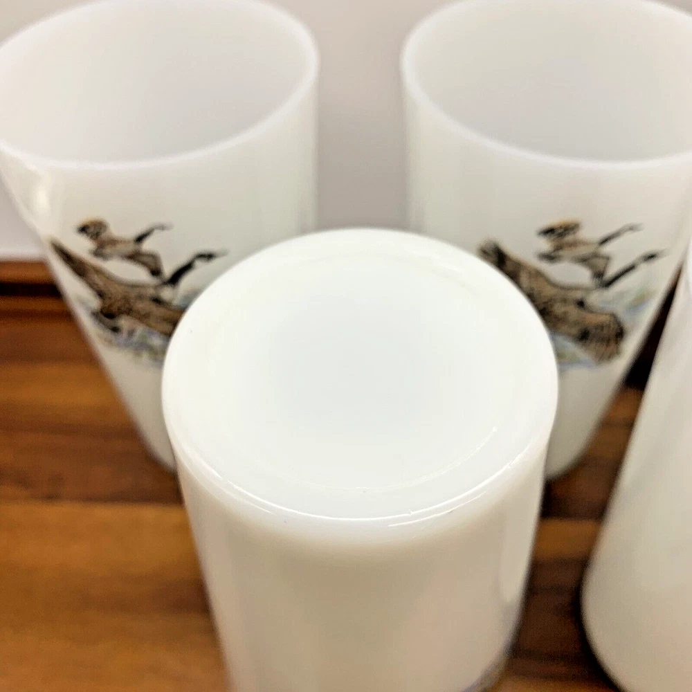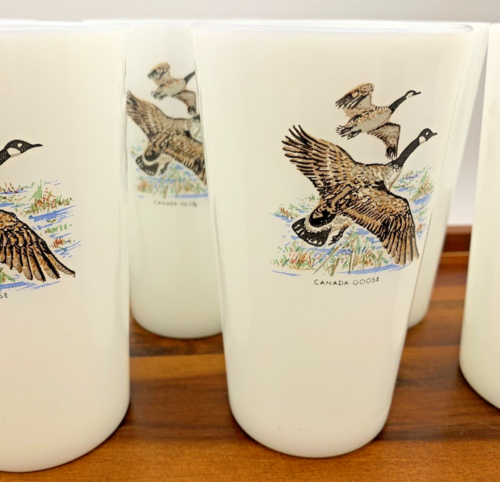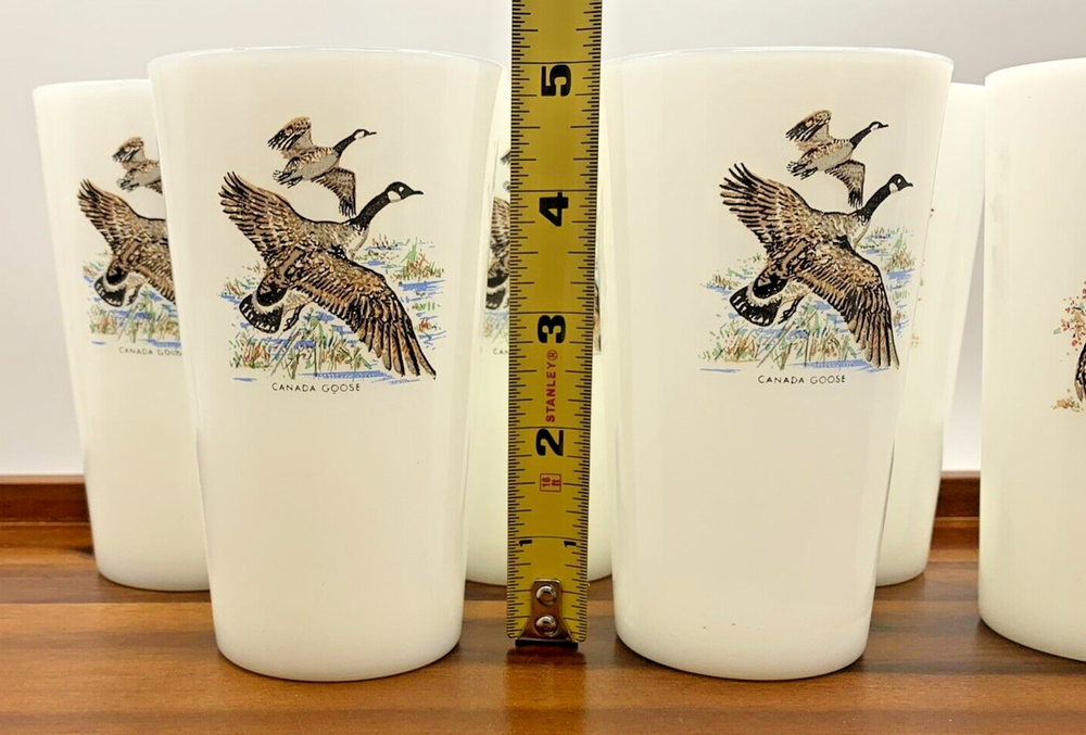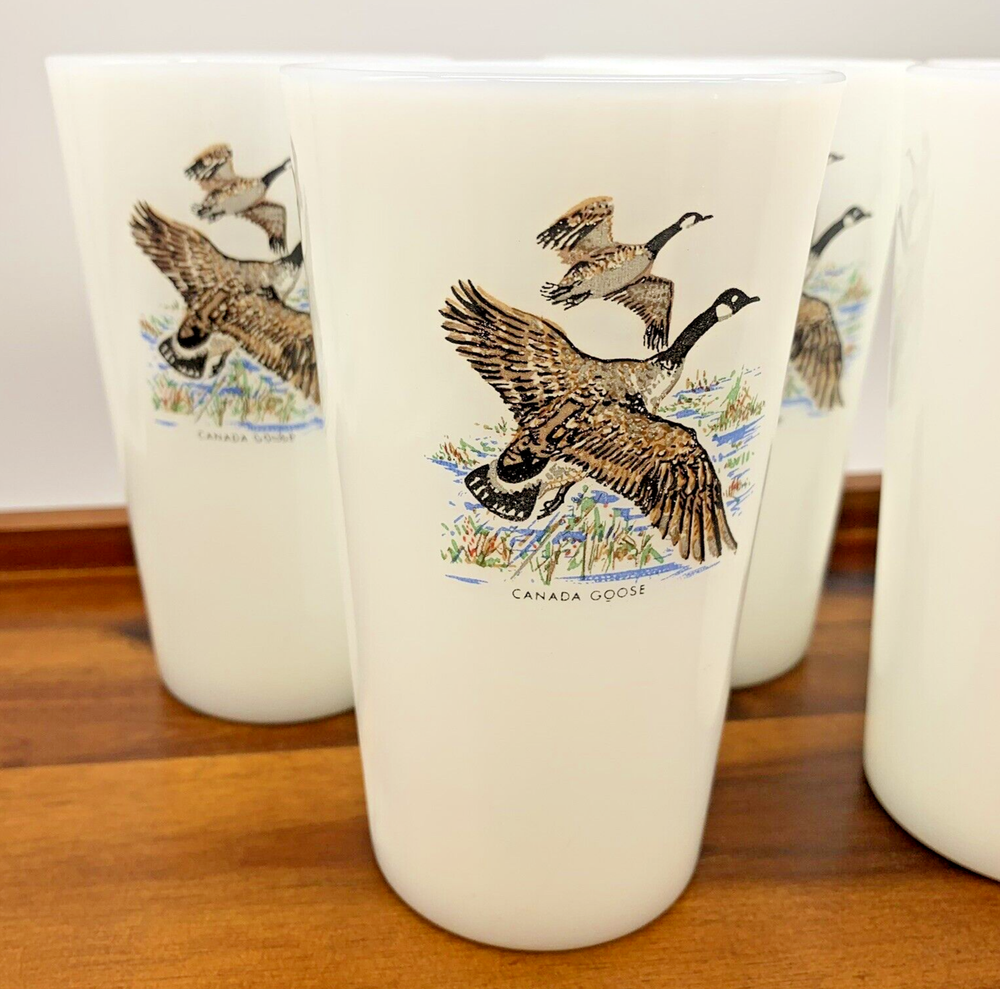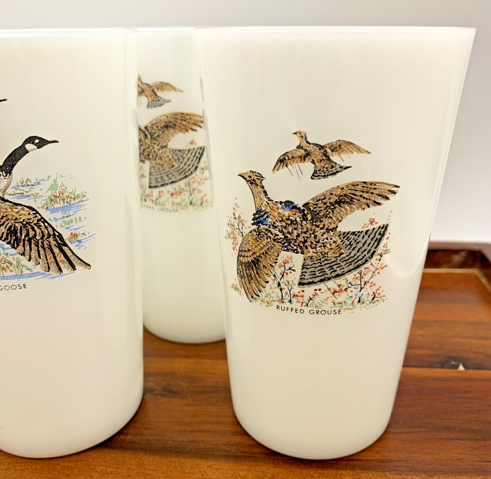 Set of 6 Vintage Game Bird 5" Canada Goose Grouse Tumblers 11 oz Milk Glass Cups In fantastic condition! These are NOT marked and from all the research, these 5" milk glass tumblers aren't marked. They are most likely Fire King / Anchor Hocking or Federal Glass. Four are Canada Goose and Two are Ruffed Grouse. Please zoom in on photos for a better view of the item's condition. We do our absolute best to research all items we sell. If you ever have questions, please reach out to me! We will always package items securely and with care. Thank you for viewing and please visit our store for more awesome vintage goodies!