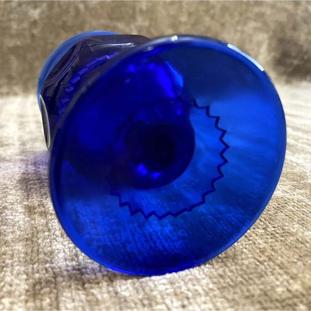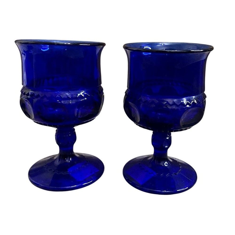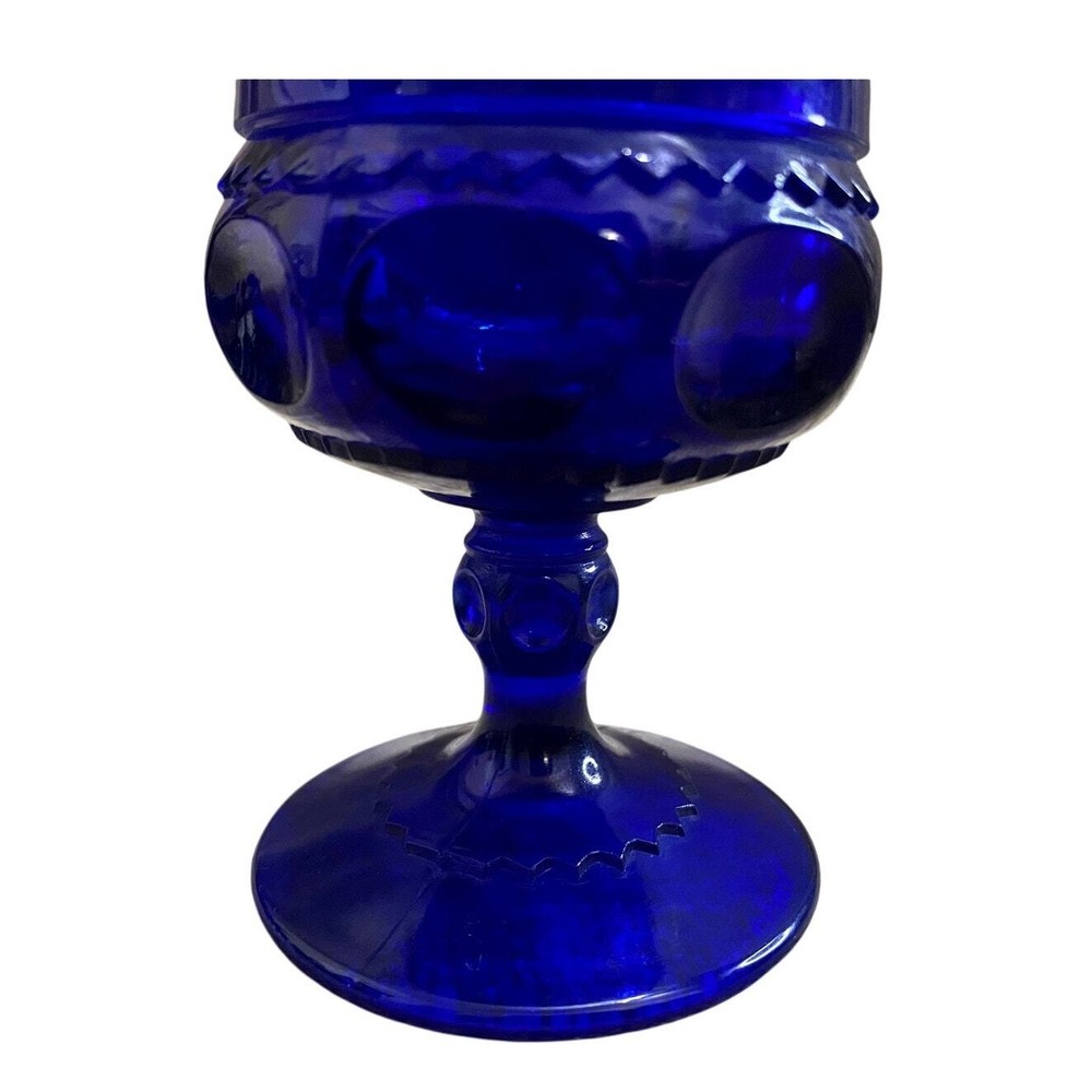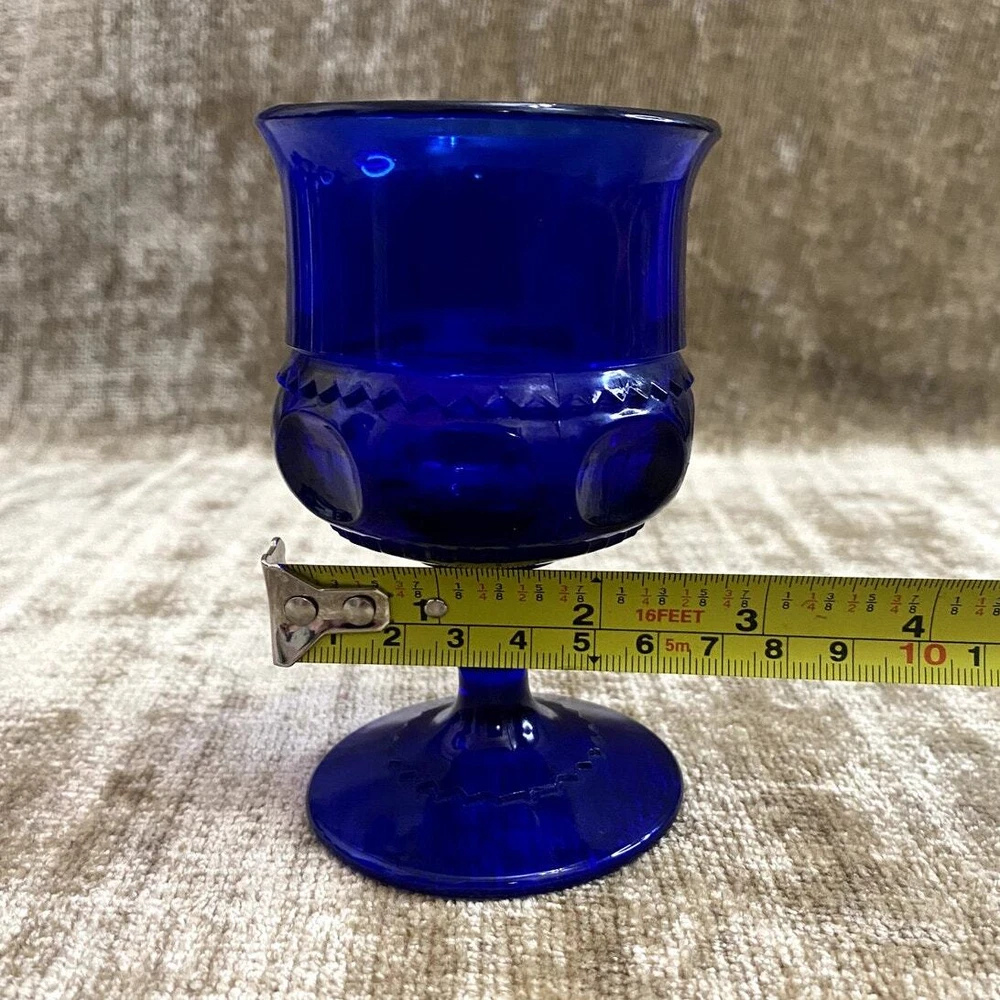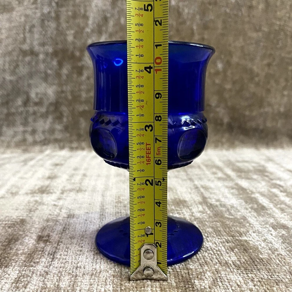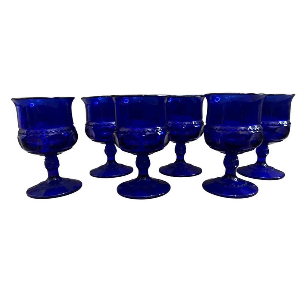 Elevate your entertaining with this exquisite set of six Kings Crown Cobalt Blue Thumbprint cordial glasses. Each piece showcases the timeless elegance of Mid-Century Modern design, featuring a vivid cobalt blue color matched with a classic thumbprint pattern and sophisticated stem. Despite slight vintage wear with some cloudiness, these glasses maintain a stately presence. Perfect for serving your favorite cordials, these glasses add a royal touch to any table setting or glassware collection. Ideal for collectors and enthusiasts of unique, vintage glassware. - Title: Kings Crown Cobalt Blue Thumbprint Cordial Glasses, Set of 6 - Maker: Indiana Glass in the Imperial Kings Crown style - Color: Rich Cobalt Blue - Pattern: Thumbprint - Style: Mid Century Modern - Quantity: Set of 6 Glasses - Capacity: 4 oz each - Condition: Very Good Vintage; slight cloudiness noted in some glasses - Height: 4.375 inches - Features: Elegant stemmed design suitable for formal occasions or special events