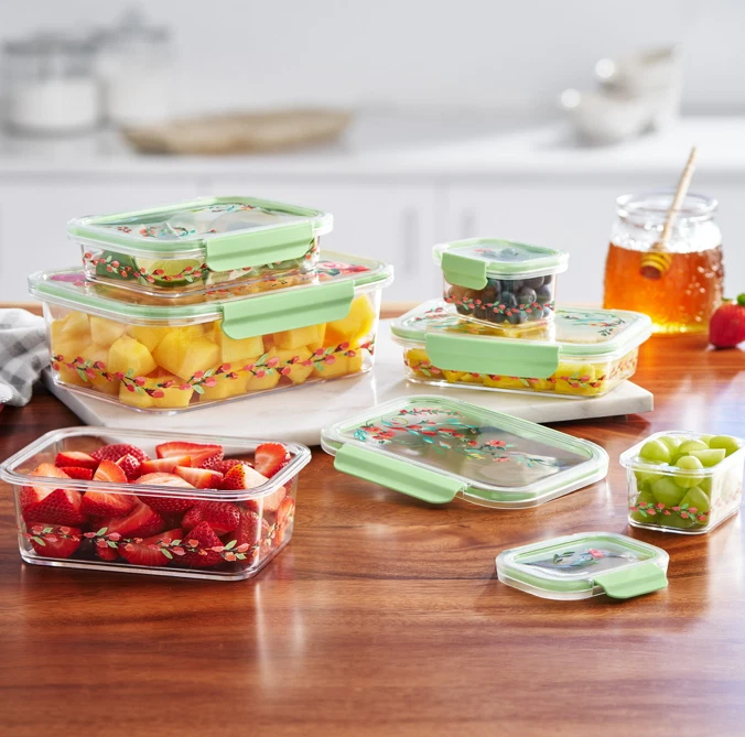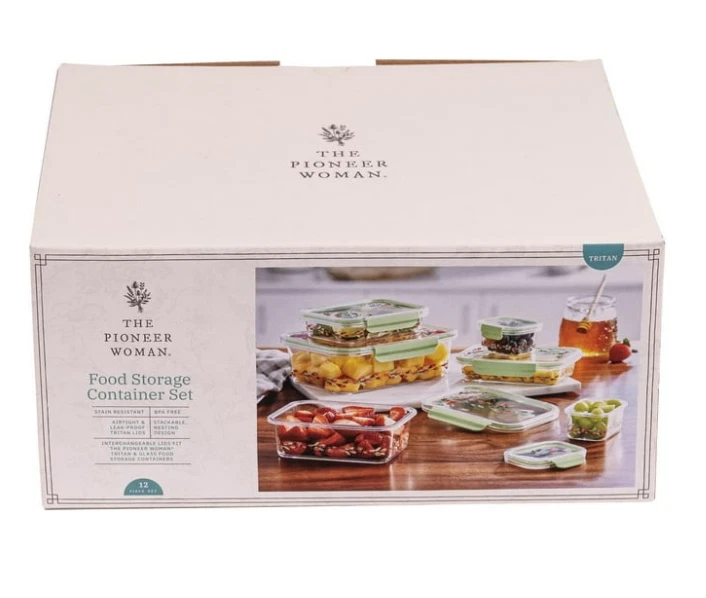 The Pioneer Woman Painted Meadow 12-Piece Tritan Food Storage Set 🌸🥗 Durable & BPA-Free: Made from Tritan for long-lasting use Microwave, Freezer & Dishwasher Safe: (Lids NOT microwave-safe) Includes 6 Containers with Lids: 2 x 0.8 cup (3.94"L x 3.07"W x 2.03"H) 2 x 2.3 cup (7.3"L x 5.48"W x 1.7"D) 1 x 4 cup (7.3"L x 5.48"W x 2.66"H) 1 x 10 cup (10"L x 7.28"W x 3.2"H) Interchangeable Lids: Compatible with The Pioneer Woman Tritan & Glass containers Airtight & Leak-Proof: Keeps food fresh & prevents spills Stackable & Nesting Design: Saves space in your kitchen Stain Resistant: No lingering odors or stains from sauces & spices From meal prep to leftovers, The Pioneer Woman Painted Meadow Tritan Food Storage Set makes kitchen organization effortless and stylish! 🌿✨