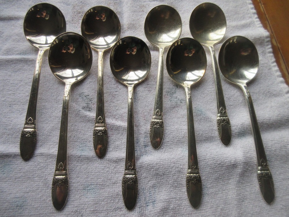 Previously owned SET OF 8 1847 Rogers Bros IS Silverplate Pattern: FIRST LOVE 7" GUMBO SOUP SPOONS Please email any questions. USPS Ground Advantage Shipping $ FREE