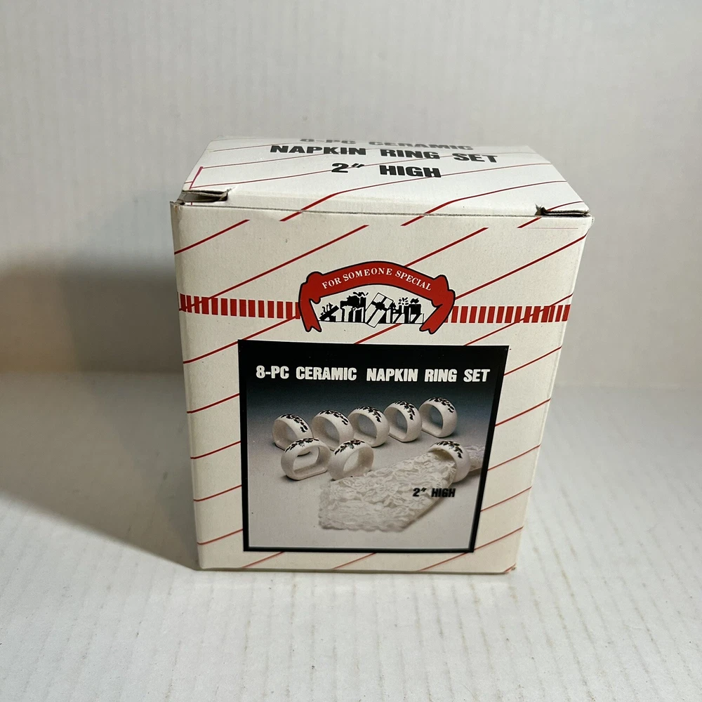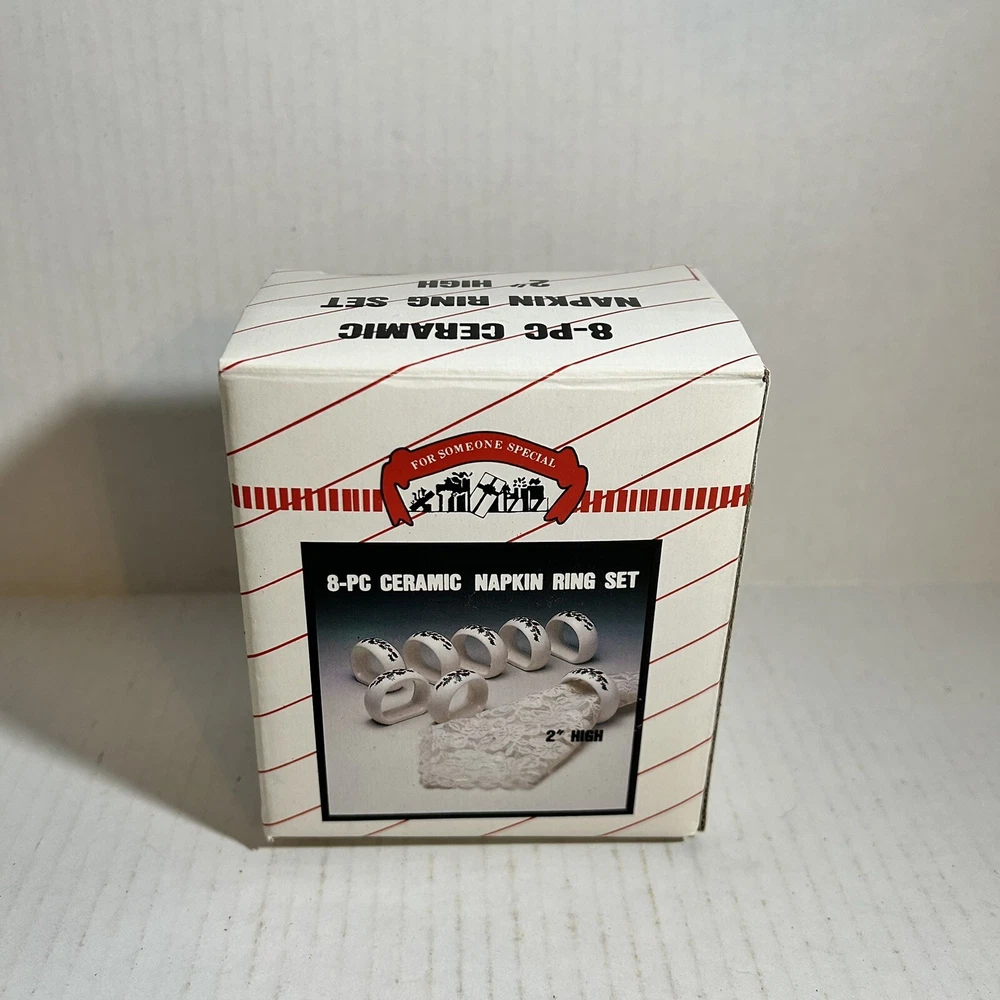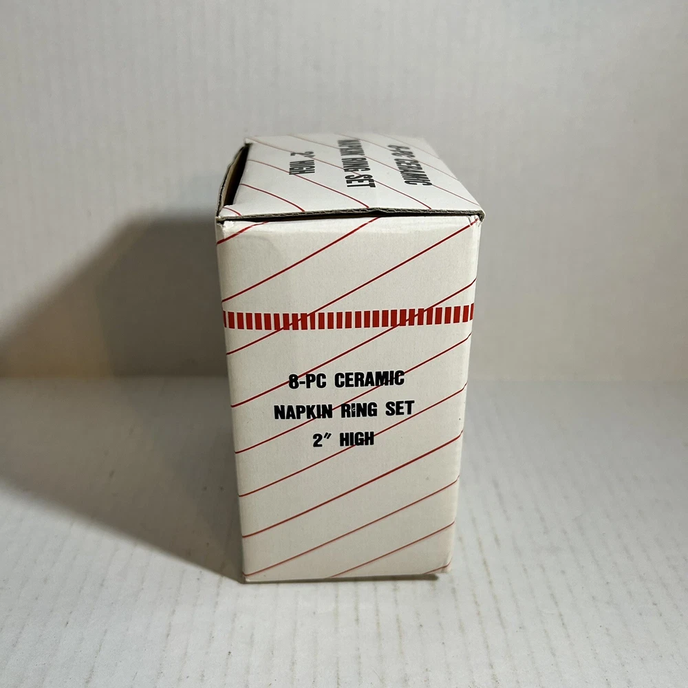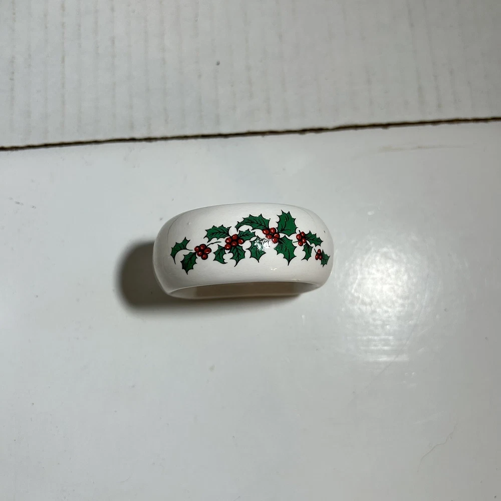 Set of 8 Ceramic Holiday Christmas Holly Napkin Rings are in very good condition, with some minor wear from making but none from use or age as they have been kept in the box and wrapping. Please see Photos for Condition of Napkin Rings. This is a set of 8 holiday Christmas ceramic napkin rings in a white color featuring a holly berry design. The napkin rings are made of porcelain and are in excellent condition, as they have hardly been used. Perfect for adding a festive touch to your holiday table setting, these napkin rings showcase a traditional Christmas theme with their red, green, and white colors, making them ideal for the holiday season.