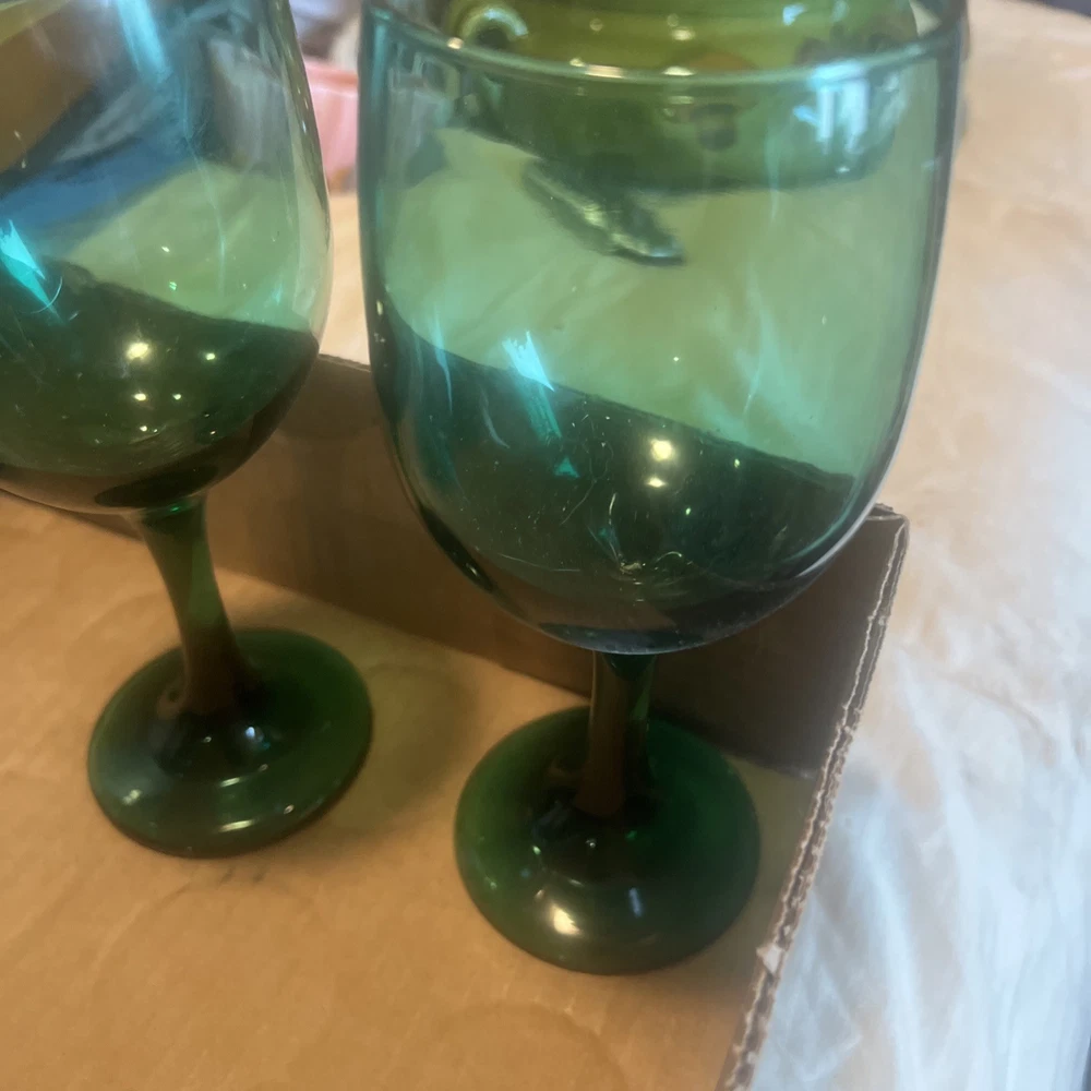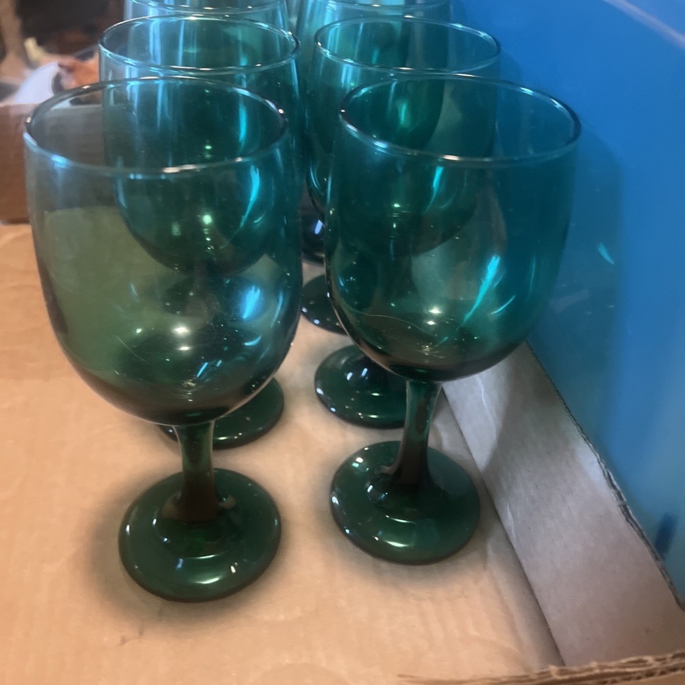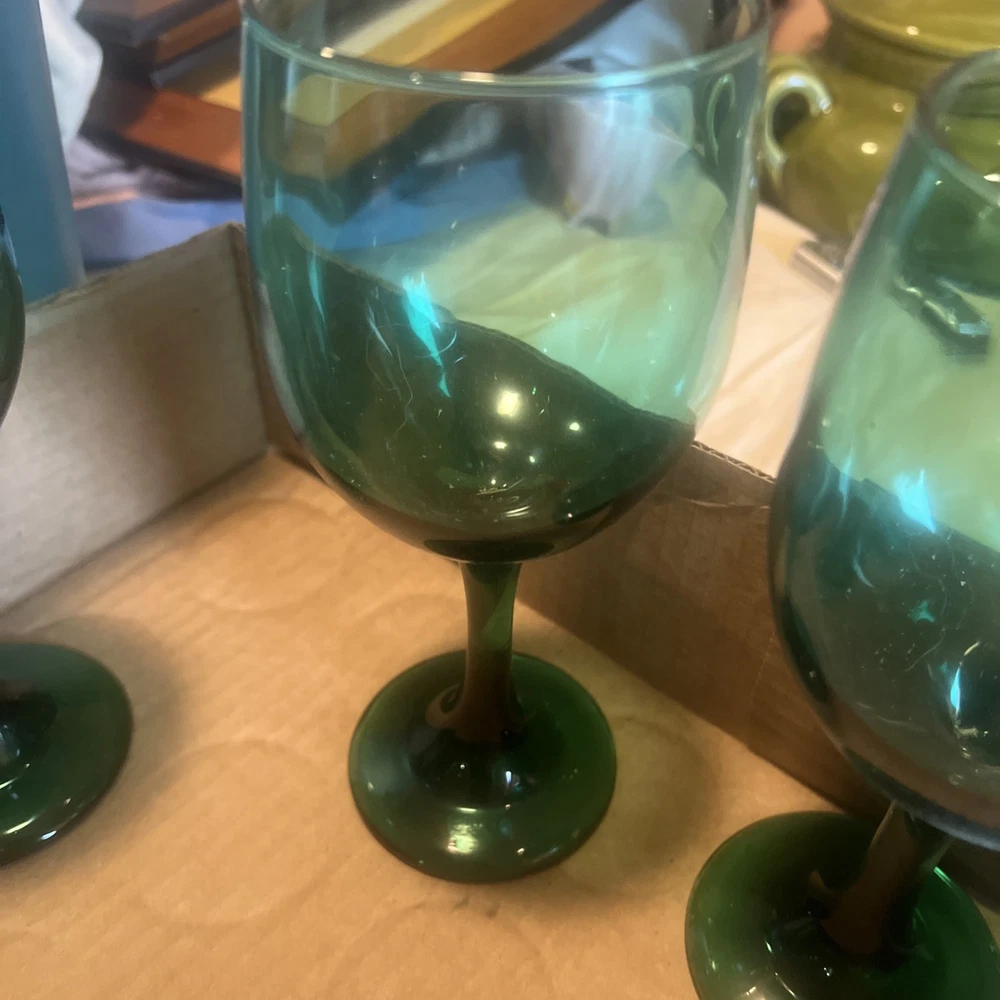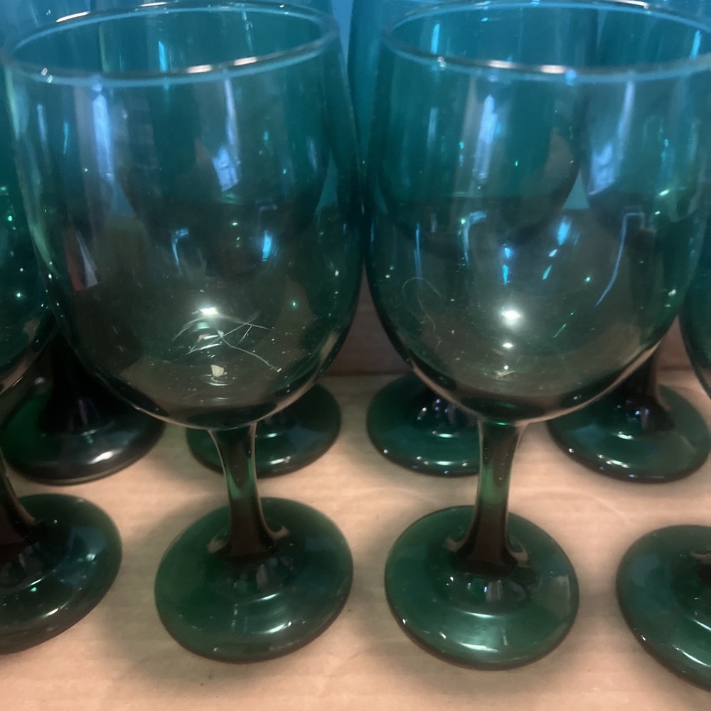 Please verify these are LIVBEY emerald green glasses. We do the best that we can in identifying them, but we asked the customer to be sure what they’re buying regardless of what it’s labeled at if you need close up pictures on certain parts to identify, we will gladly send them to you. What’s your purchasing is in the picture I put in the picture. It is included as there are no returns refund or exchanges. Please be sure about your purchasing is right for you.  This set of 8 Libbey Emerald Green Glass Water Wine Glasses Goblets is a vintage mid-century modern piece that exudes a classic and elegant look. Standing at 7.5 inches tall, these glasses are perfect for all occasions and feature a beautiful art glass production style. Made in the United States in the 1970s, these original vintage pieces are a unique addition to any drinkware collection. With a classic green color and a timeless design, these glasses are sure to impress both guests and collectors alike.