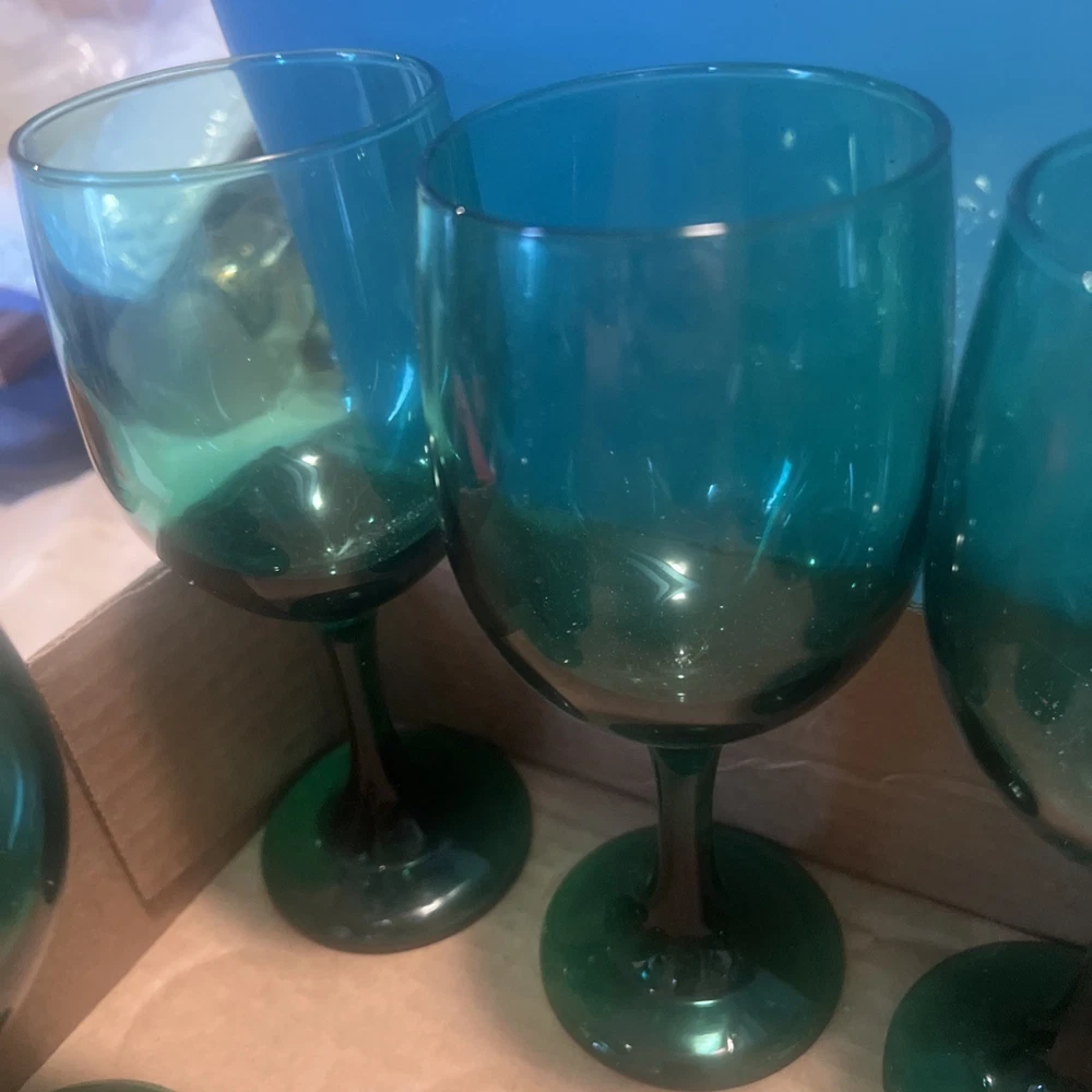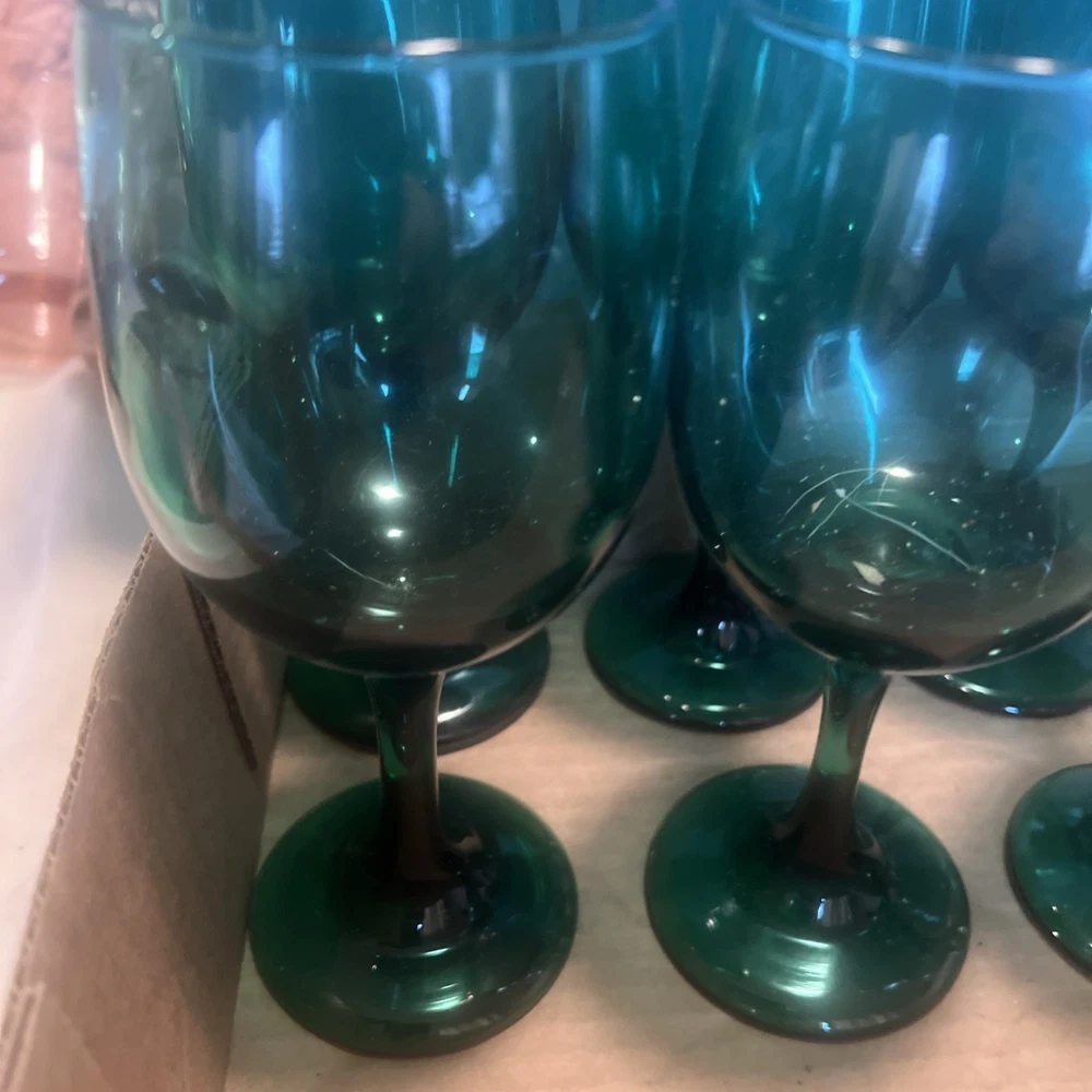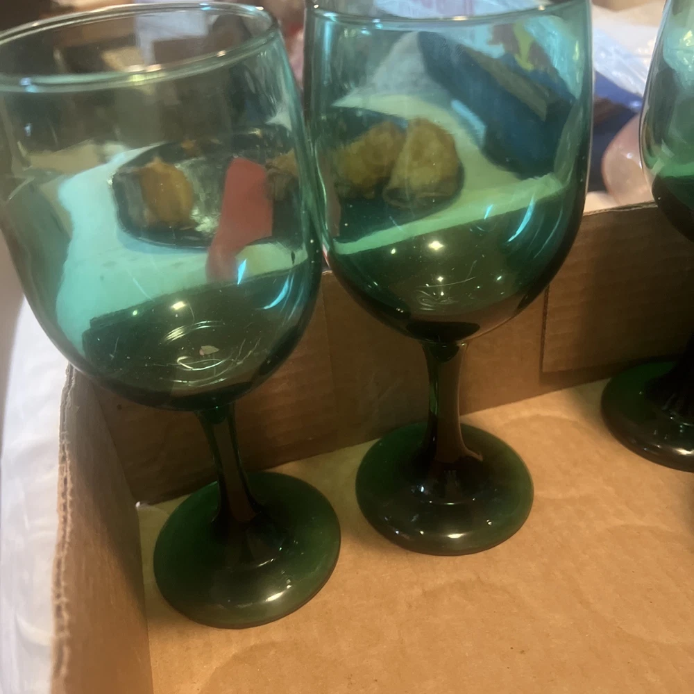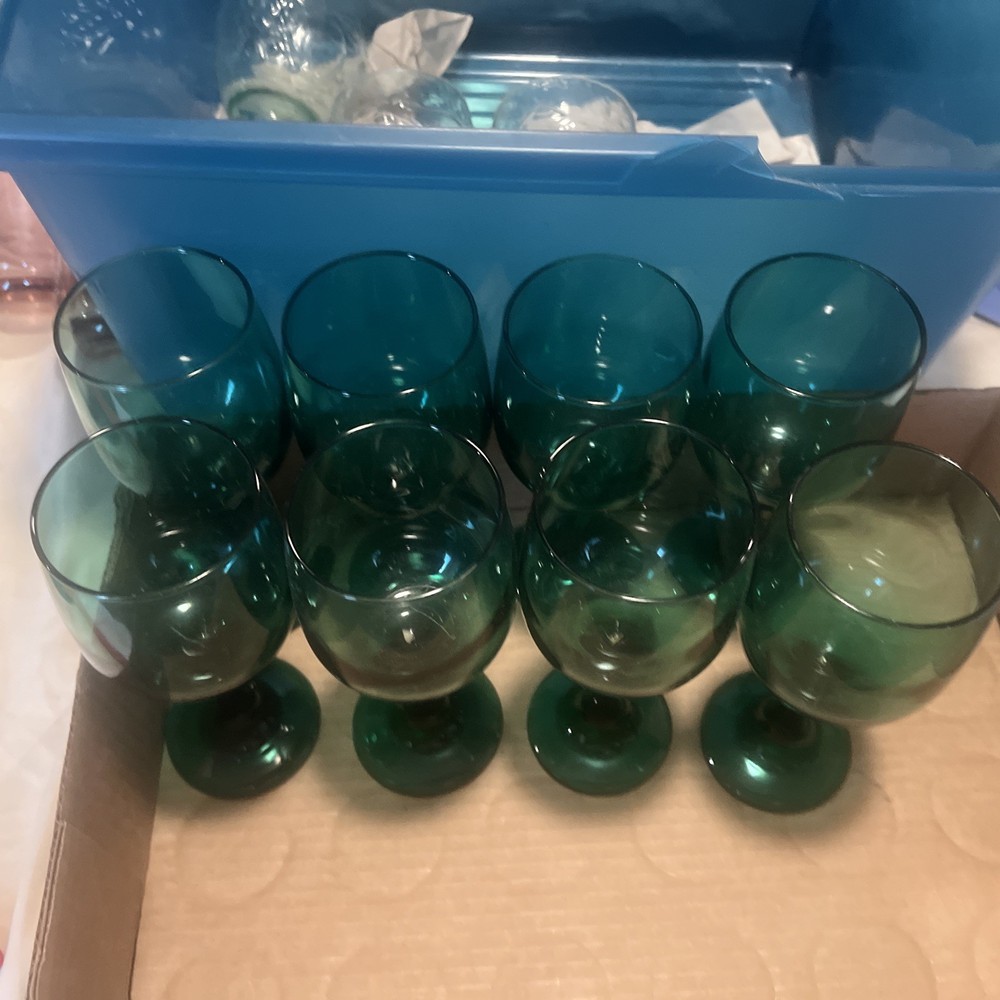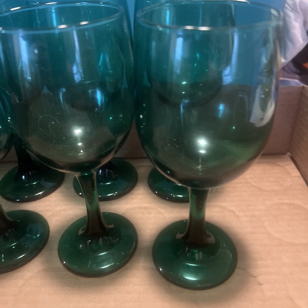 Please verify these are LIVBEY emerald green glasses. We do the best that we can in identifying them, but we asked the customer to be sure what they’re buying regardless of what it’s labeled at if you need close up pictures on certain parts to identify, we will gladly send them to you. What’s your purchasing is in the picture I put in the picture. It is included as there are no returns refund or exchanges. Please be sure about your purchasing is right for you.  This set of 8 Libbey Emerald Green Glass Water Wine Glasses Goblets is a vintage mid-century modern piece that exudes a classic and elegant look. Standing at 7.5 inches tall, these glasses are perfect for all occasions and feature a beautiful art glass production style. Made in the United States in the 1970s, these original vintage pieces are a unique addition to any drinkware collection. With a classic green color and a timeless design, these glasses are sure to impress both guests and collectors alike.