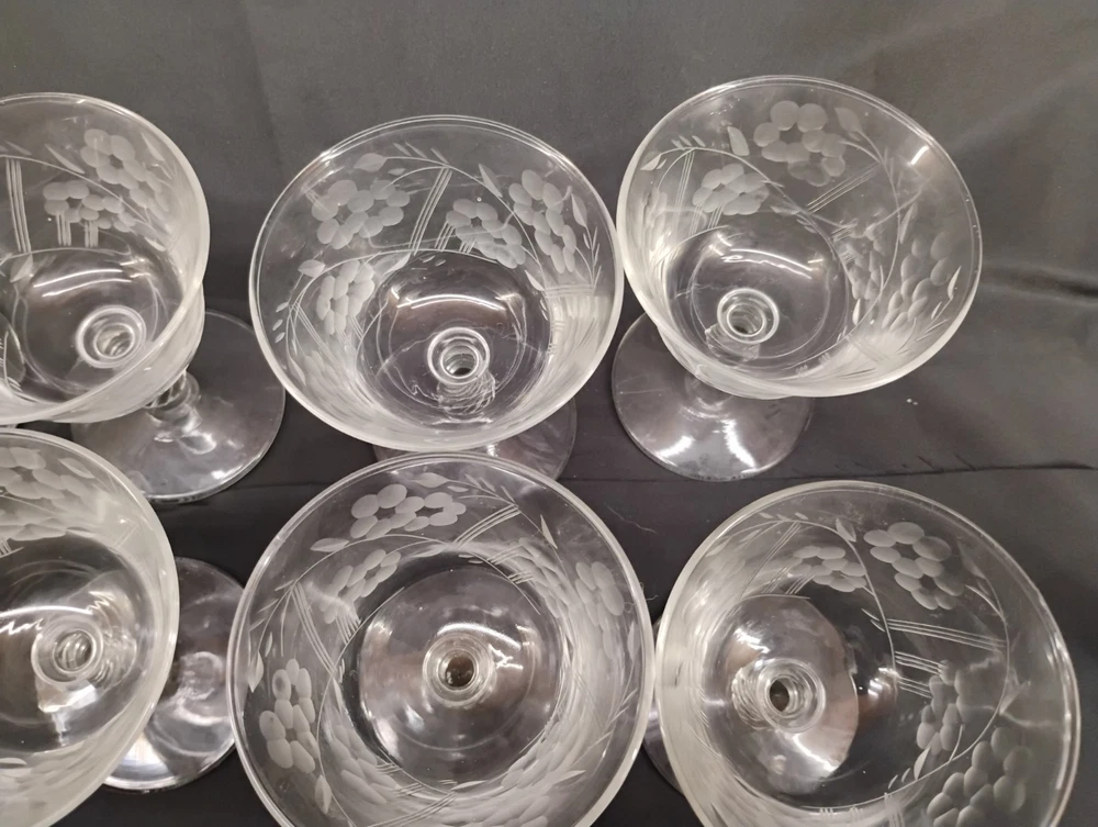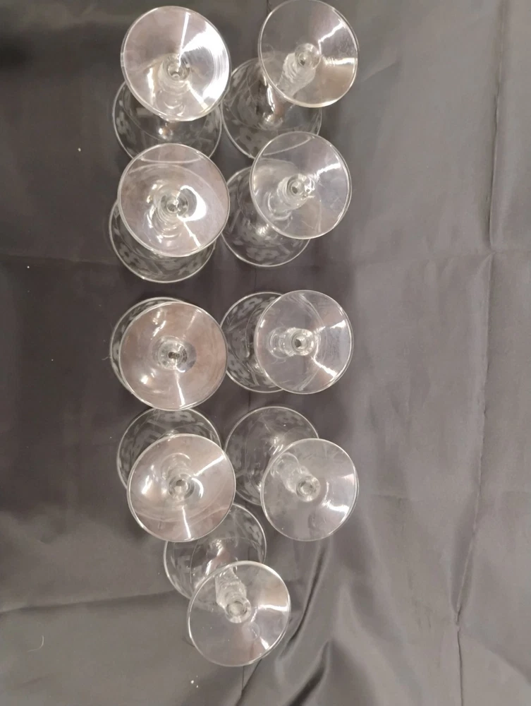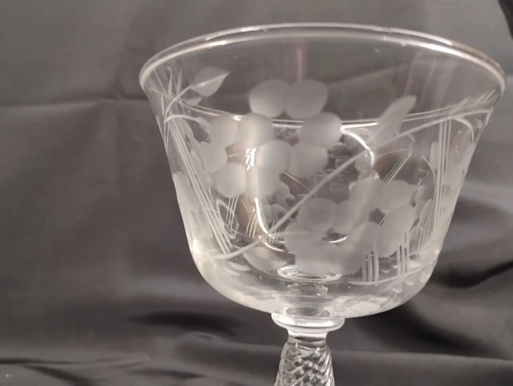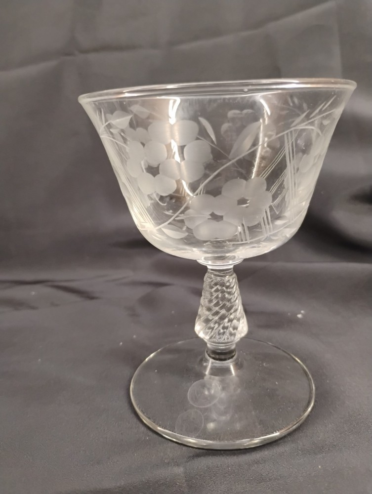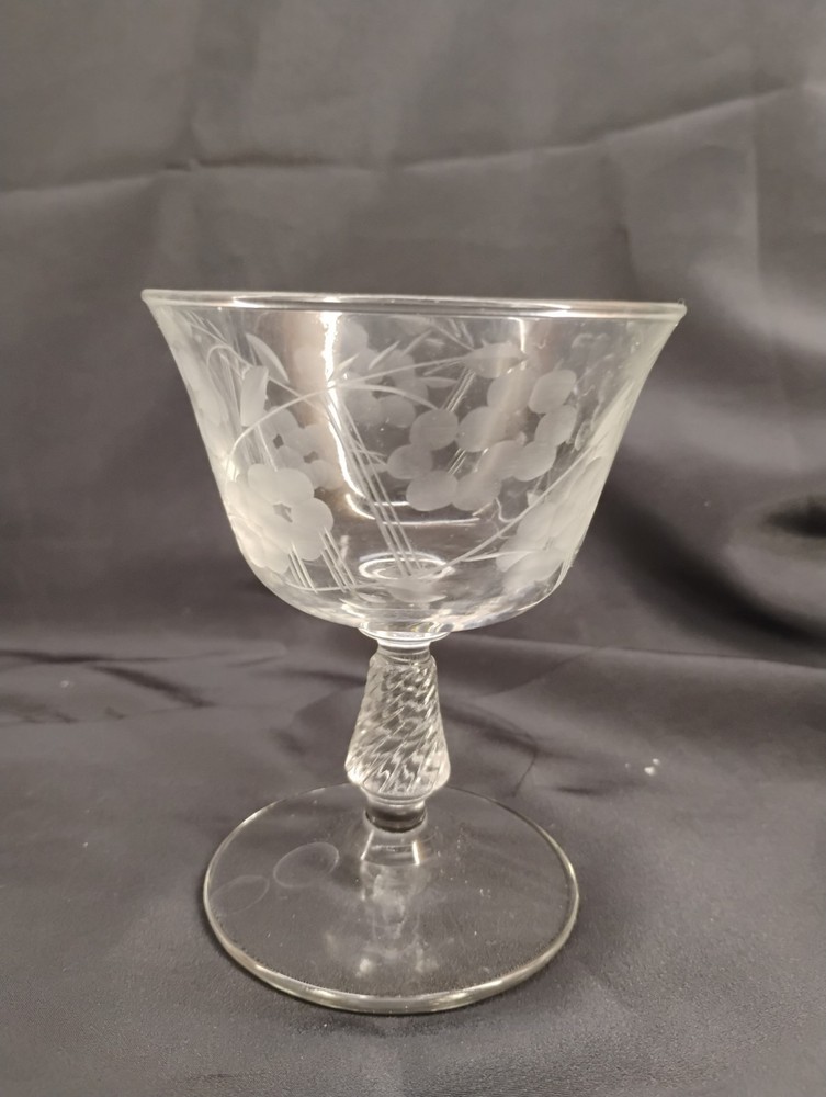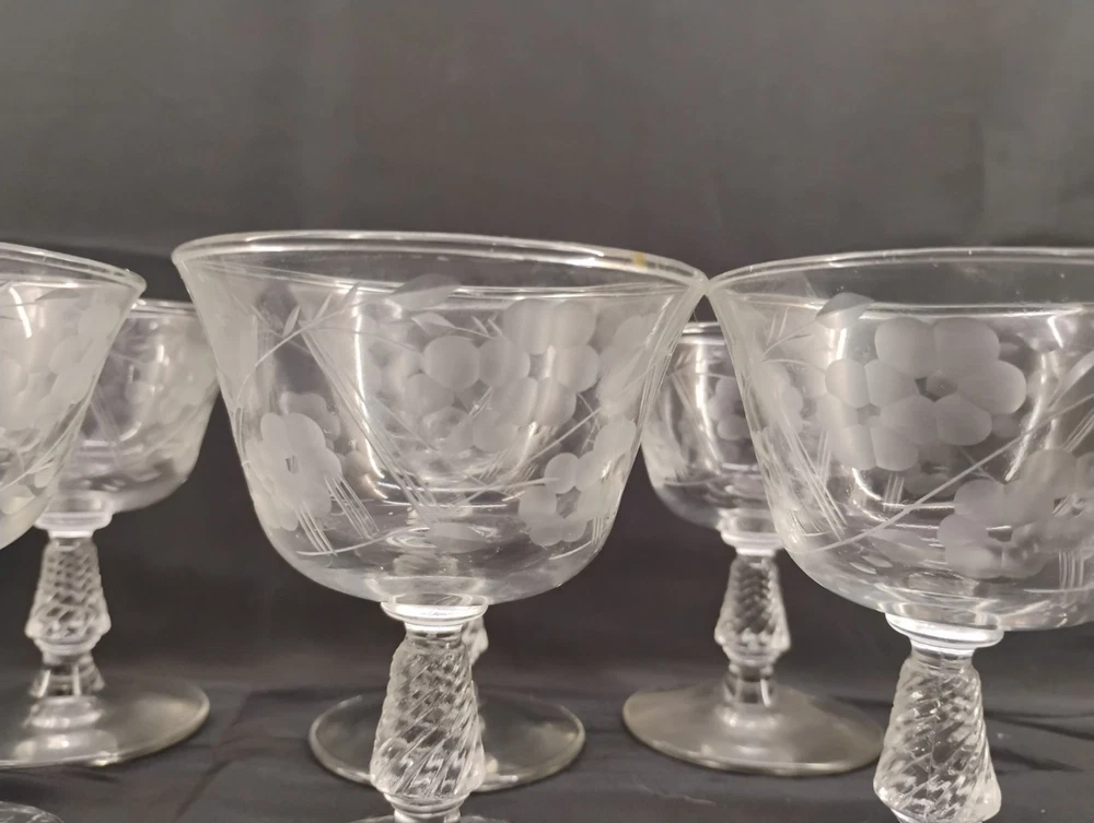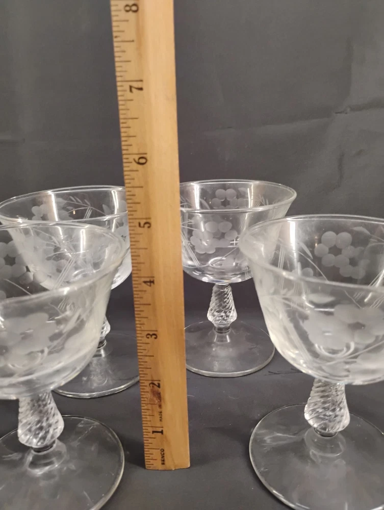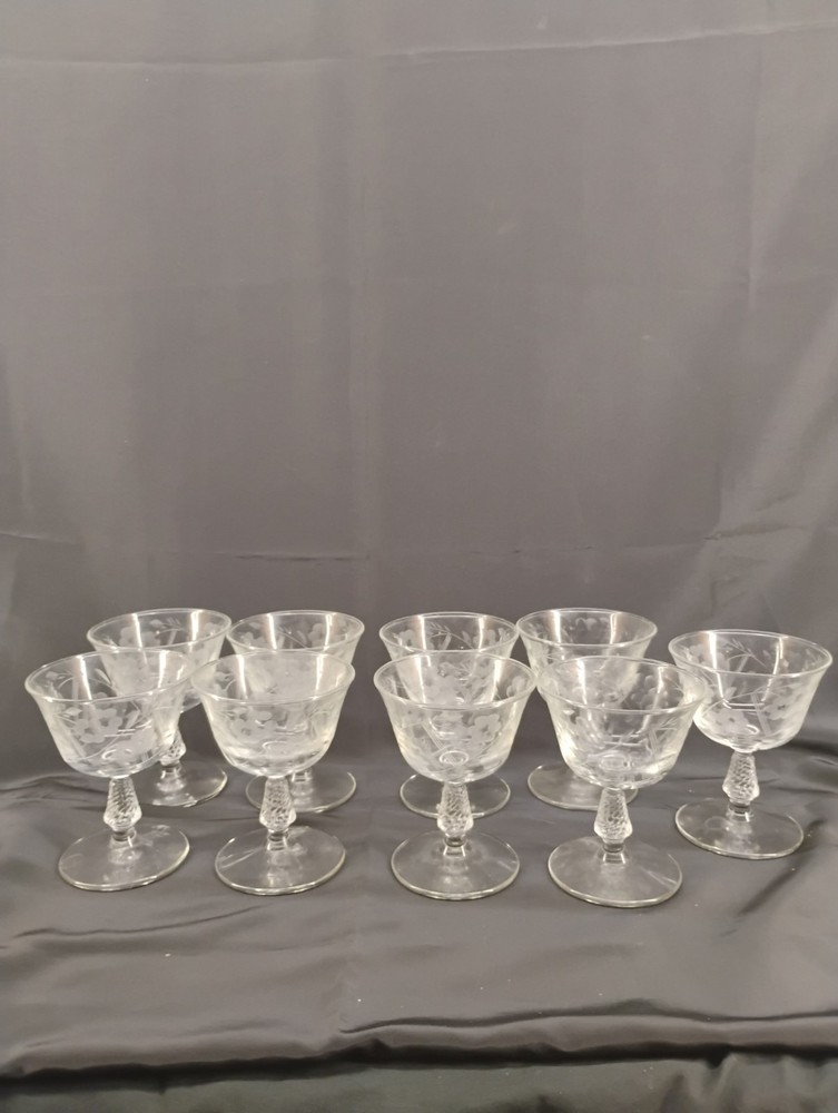 The product is a set of 9 clear coupe sherbet glasses, each measuring 4 1/2 inches in height. These glasses are made of glass and feature an etched design, adding a touch of elegance to the classic sherbet glass style. Perfect for serving sorbets, ice creams, or other desserts, these glasses would make a stylish addition to any table setting or barware collection. Thank you for visiting my listing today and thank you for your interest in this item! My goal is to have a pleasant transaction resulting in a satisfied customer. I hope any transaction between us leaves you with a feeling of confidence knowing you can trust me and the items I offer here. *Most if not all my listings are set to accept offers. Feel free to send an offer and I will be happy to consider it!! *Please contact me with any questions or concerns and I will be happy to help. *Always examine the photos carefully, and if in doubt, email me with any questions you may have. *Please note that condition statements are offered as a guide only. They will always be somewhat subjective and reflect our opinion, which may not necessarily agree with someone else's opinion. PLEASE READ: I aim to please and I want my buyers to have a positive transaction with me. If you have questions, concerns, or special requests related to any of my items I hope you will contact me so we can work them out to your satisfaction. I sell my items to give you a great item at a decent price while making a little profit at the same time. If you feel the item you are interested in is too pricey do not hesitate to send me a fair offer and I will consider it. My goal is to satisfy your needs and mine so both parties can benefit. SHIPPING: If you prefer a different shipping method or company please contact me and I will do all I can to make that happen. If you have concerns or requests about the packaging of your item contact me and I will do all I can to accommodate them. Shipping costs are based on location in each state or country, the costs always differ. After I have received your payment I will ship your item out within 3 business days or less excluding weekends and holidays. BEFORE PURCHASING & BIDDING: **Please see all the pictures. I do not have great photography skills but I try to get the most accurate photos I can. If you are unsure about something you see in a photo contact me so I can do what I am able to answer your concern about the item. **I cannot stress enough that if you have any questions or concerns please contact me before purchasing and bidding. Communication can solve so much. **As a customer myself, I understand the meaning of customer satisfaction and my goal is to have nothing but satisfied customers. If you are not unsatisfied with your purchase I ask that you please contact me so I can take care of your issue. My goal is for you to be 100% satisfied. INTERNATIONAL BUYERS WELCOMED - PLEASE NOTE: I welcome International buyers! Please be aware that any custom/duties/taxes that the parcel might incur once it is out of the USA are the responsibility of the buyer. Please check with your country's customs office to determine what these additional costs will be prior to bidding or buying. Please refer to the eBay Site Map for more information if needed.