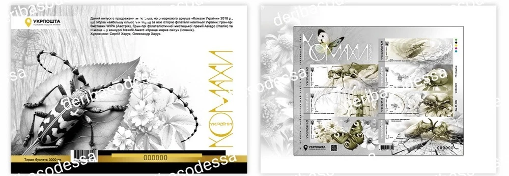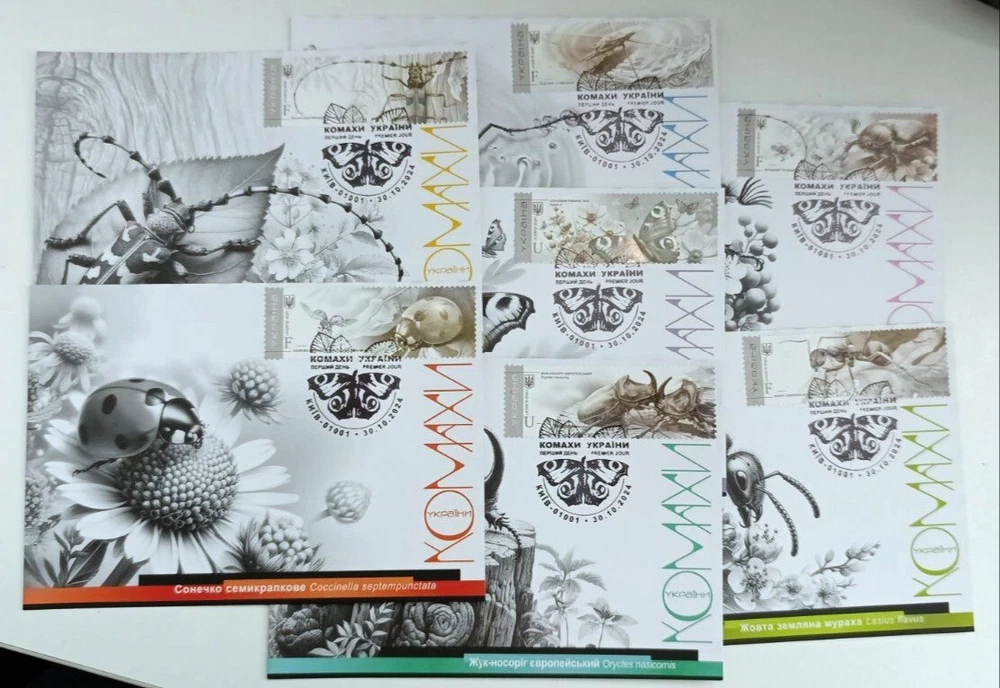 📬 "Exclusive"set! «Insects of Ukraine» 2024 Set 11 in 1 with NON-PERF0RATED blocks! Exclusive from Ukrposhta "Insects of Ukraine" The set of postal products for October 2024 includes the issue 🐞 "Insects of Ukraine": ✔️ 1pcs Stamp sheet with 7 stamps with holographic film elements ✔️ 1pcs C5 envelope with stamp sheet with repayment "First day. Kyiv" ✔️ 1pcs Stamp sheet numbered non-perforated with 7 stamps with holographic film elements in a booklet ✔️ 1pcs C5 envelope with a numbered non-perforated stamped sheet with repayment "First day. Kyiv" ✔️ A set of 7 maximum cards with repayment "First day. Kyiv" This issue is a continuation of the legendary “Insects of Ukraine” sheet of stamps issued in 2018, which has won the largest number of awards in the history of philately in modern Ukraine: Grand Prix of the WIPA International Philatelic Exhibition in Vienna (Austria), Grand Prix of the Asiago Philatelic Art Prize (Italy) and the second prize Nexofil to Best Stamp of the World (Spain). On the stamp sheet a modern technology of holographic film embossing was used for the first time. The 2024 postal issue features: yellow meadow ant Lasius flavus, Rosalia longicorn Rosalia alpina, European peacock butterfly Aglais io, common pond skater Gerris lacustris, seven-spot ladybird Coccinella septempunctata, common cockchafer Melolontha melolontha, European rhinoceros beetle Oryctes nasicornis. Specification: Artist — Serhii ta Oleksandr Kharuky Isuue date (year) — 30.10.2024 The number of stamps in the sheet — 7 Face value of each postage stamp — 2хU+5xF The cancellation will not take place in the city of Odessa! Shipping within 1-3 days, to the USA and Canada 14-30 days, European countries 10-25 days, Israel 30-35 days. Please take your country's holidays into account. 💙💛
