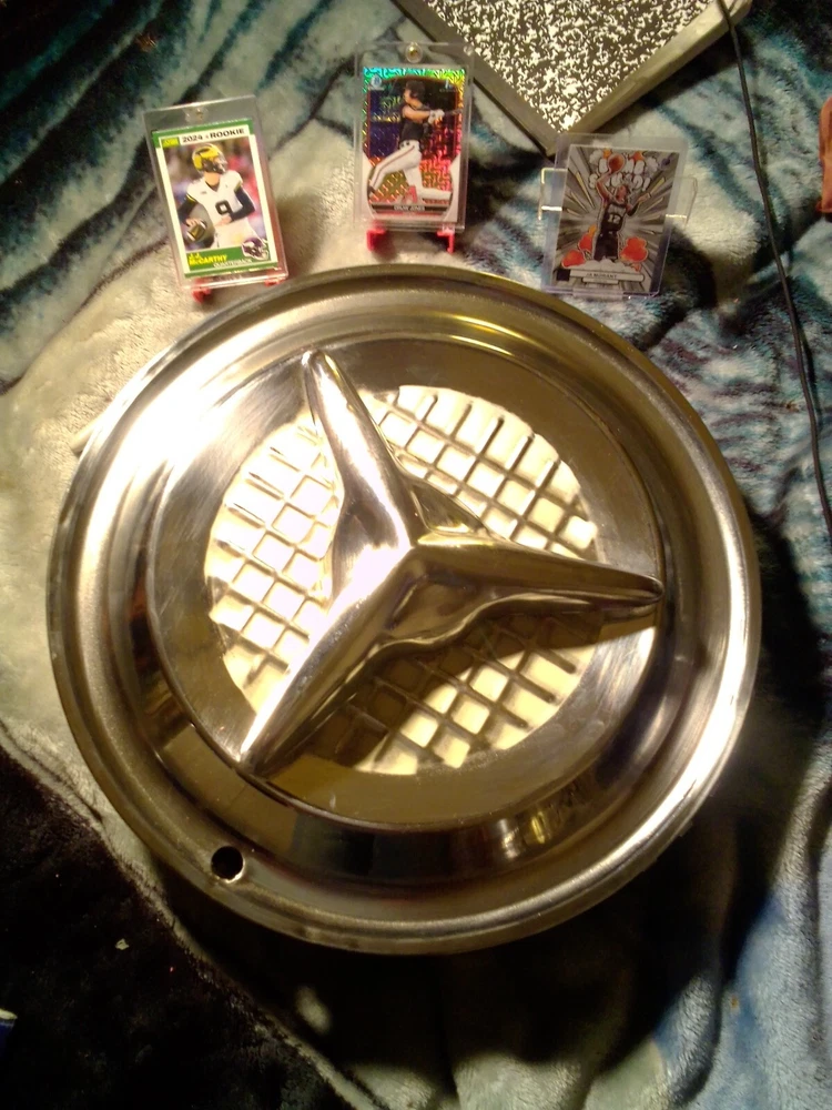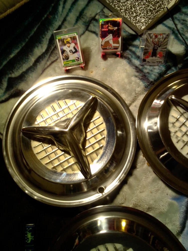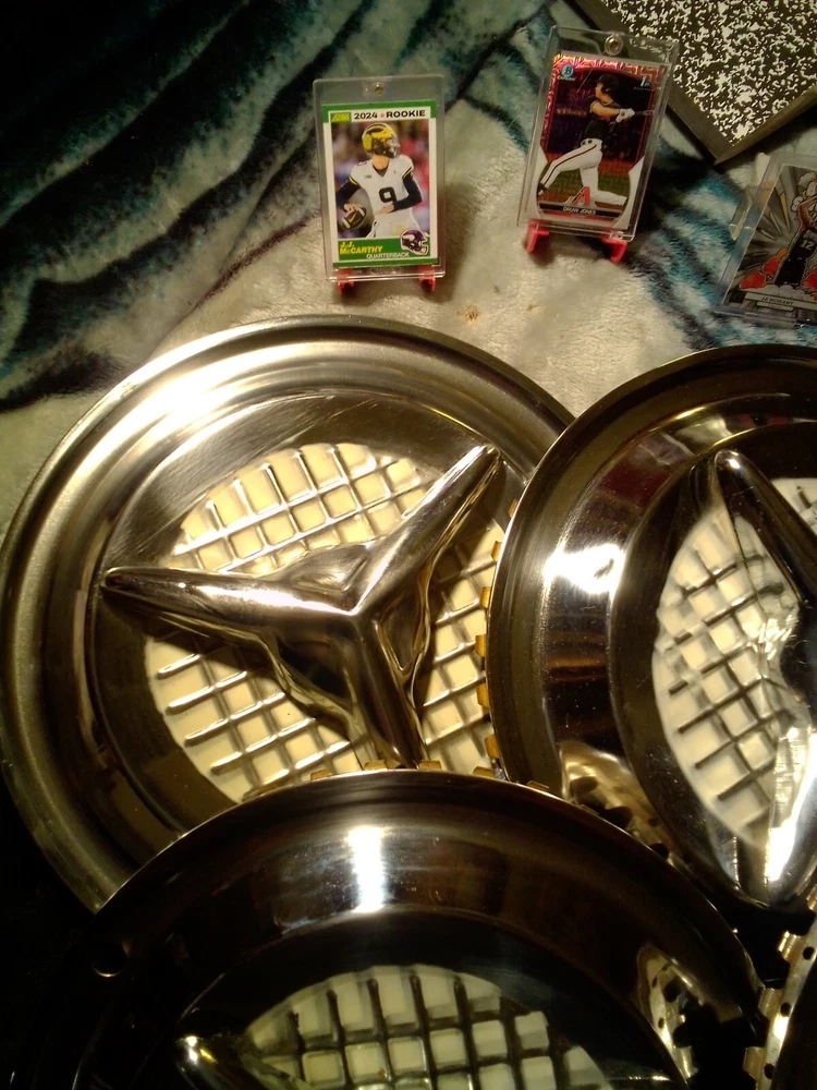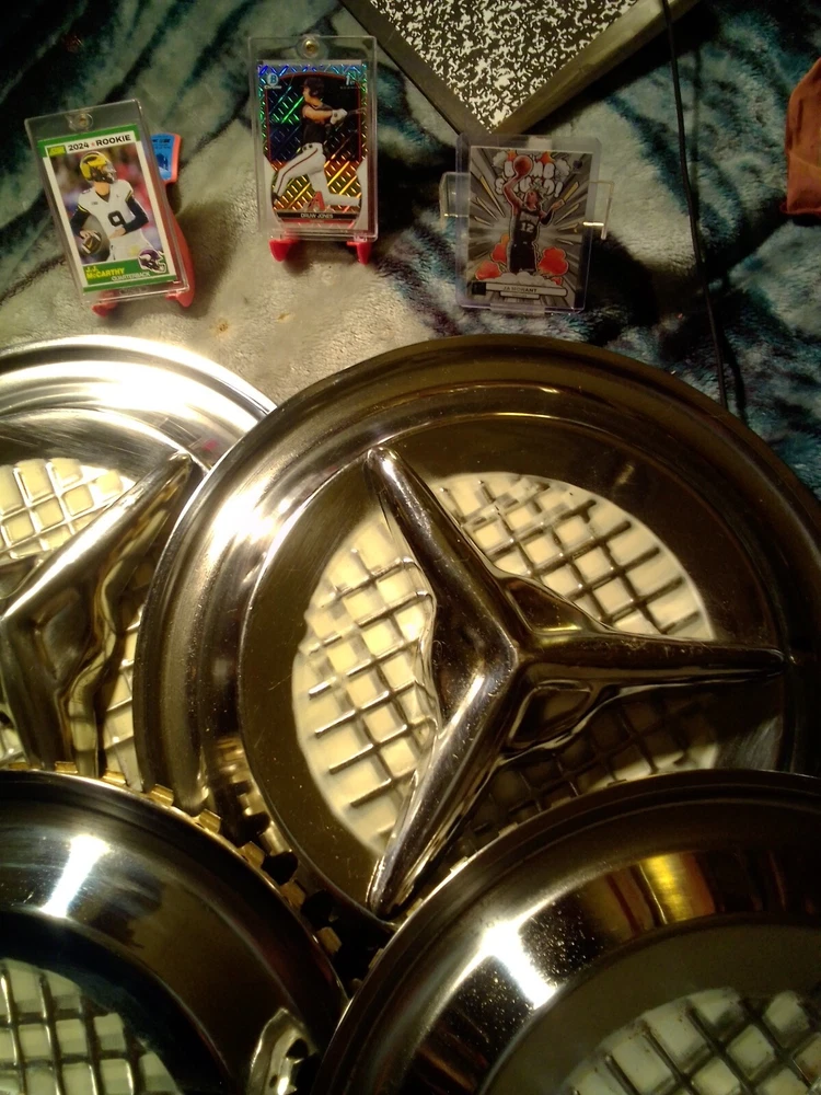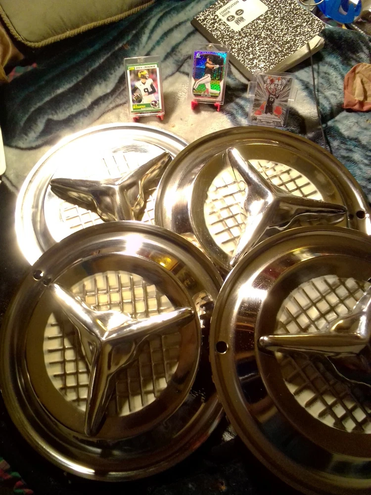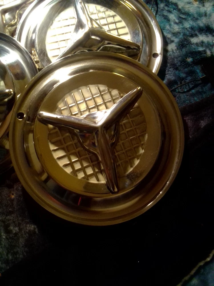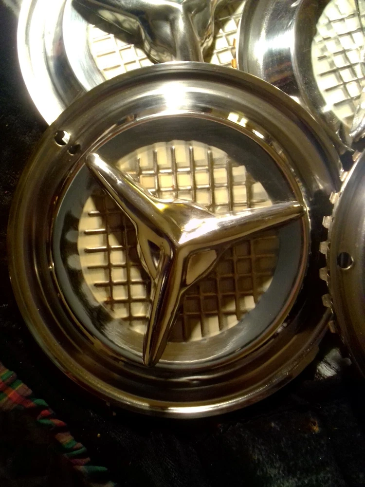 The product is a set of four vintage 14" Olds Fiesta Style hubcaps with a crossbar design in chrome finish. These hubcaps are suitable for rear, left, front, and right placements on vehicles with 14" wheels. They are interchangeable with various models such as Dodge, Plymouth, Ford, Chevy, Mercury, Buick, and Oldsmobile. The manufacturer offers a 6-month warranty on these chrome hubcaps.
