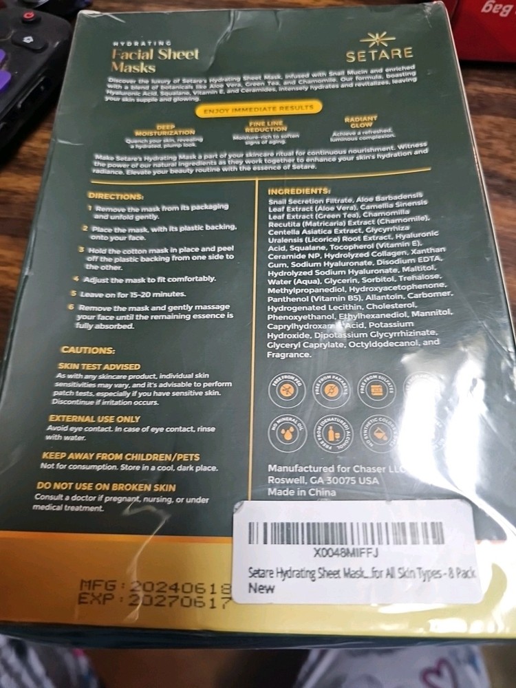 Setare Hydrating Sheet Masks with Snail Mucin, Collagen, Hyaluronic 8SNGLE MASK.
