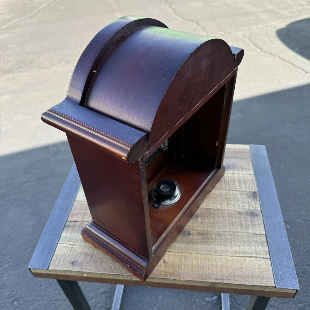 This Seth Thomas Mantle Clock features a brown wooden frame with a chime door and "Tempus Fugit" inscription. It is a quartz (battery powered) clock from the 2000-2009 time period. The clock is designed for desk or shelf display, and it has been tested and confirmed to be in working condition. Shipped with USPS Ground Advantage.