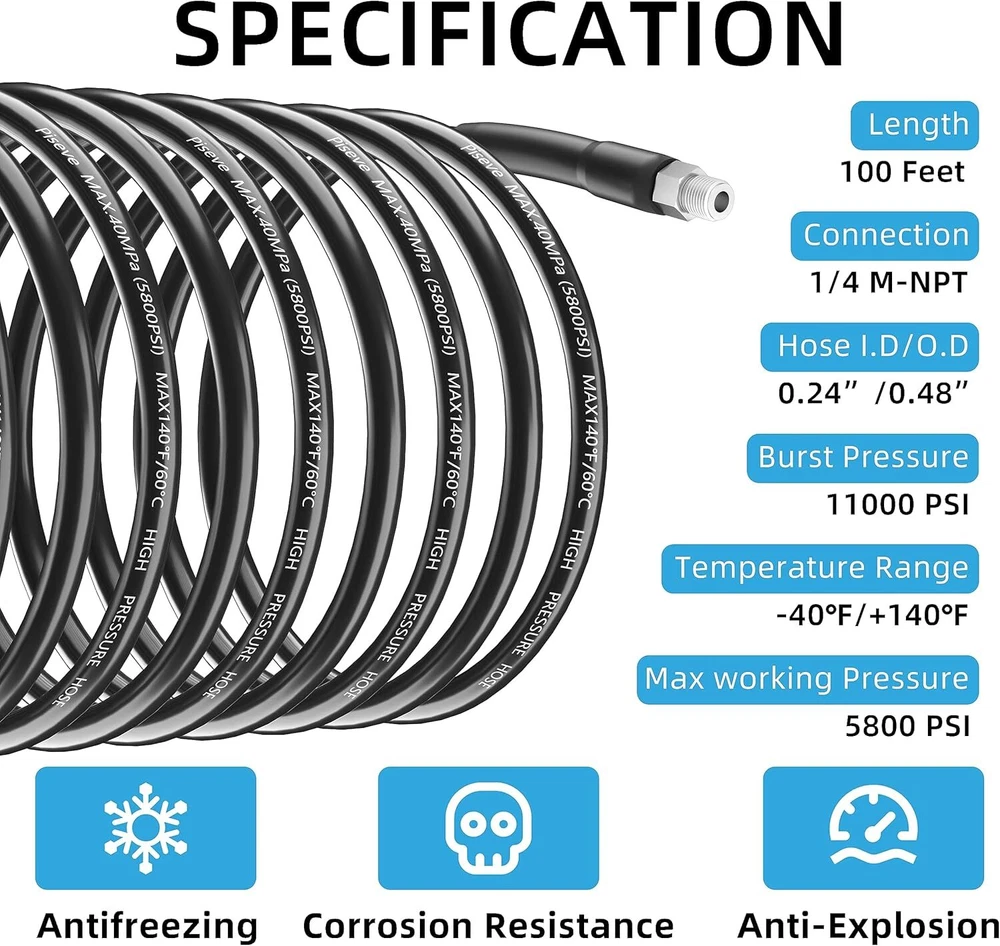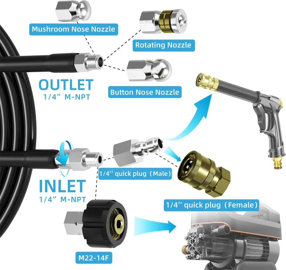 Product Description Sewer Jetter Kit 100FT for Pressure Washer 5800PSI Drain Cleaner Hose With 1/4 Inch Female NPT Button & Nose Rotating Sewer Jet Nozzle Pressure Washer quick connect Set 【Professional Sewer Jetting Kit Includes】 1× sewer jetter hose,1×button nose sewer jet nozzle,1×Mushroom Nose Nozzle,1×Rotating Nozzle,1×M22 female to 1/4’’ female NPT coupler(M22-14),1×1/4’’ quick connect plug(Female),1×1/4’’ quick connect plug(Male),1×waterproof tape, 2×spanners, 1×box of pearl corsage pin,1×instructions manual. 【High Quality 5800PSI Cleaner Hose】 sewer dredge hose are compatible with many air and electric pressure washers up to 5800 PSI.The hose is composed of 4 layers, the first layer is a PVC shell, the second layer is a fiber protection, the third layer is a steel wire braid, and the last layer is a PE inner tube.Therefore, the hose has excellent heat resistance, oil resistance, wear resistance, ozone resistance, pressure resistance, durability, explosion-proof and other characteristics. 【3 Efficient Sewer Jetter Nozzles】The set comes with 3 high efficiency sewer nozzles.Mushroom Nose Nozzle:One 0° rear nozzle can remove the blockage in the corner. Three 33° rear nozzles flush loose debris from the front nozzles.Button Nose Nozzle:One 0° rear nozzle for removing blockages from blocked pipes. Three 33° rear nozzles flush loose debris from the front nozzles. Rotating Nozzle:Three counter-rotating sprayers shoot at the blocked pipe. 【Quick Connect Plug And Female Metric M22-1/4 Inch Female NPT Fitting】Quick Connect Plug used in a lot of situations where high pressure connections are frequently assembled or disassembled.Ideal for quick exchange of pressure washer outlet, sewer jetter hose, guns and nozzles.It makes a solid connection with quick coupler each time.Pressure washer coupler convert metric M22 14mm female NPT thread to 1/4" Female NPT.And we have male and female fittings to make the hose fit more machines. 【Multifunctional Hose Set】High-pressure cleaning hoses can be used to clean cars, motorcycles, floors, Windows, driveways, roofs, siding, sinks, toilets, outdoor, indoor, etc.The piseve sewer spray kit can meet all your needs.We add a variety of common and needed accessories to facilitate your daily use, so the set is ideal for family purchases.Thank you for choosing . During transportation, the outer box may be squeezed, but it will not affect the use of the hose. About Us We are a reputable seller with many years of experience selling on eBay. Our goal is to provide high-quality products and excellent customer service. Shipping Items will be shipped within 1-3 business days when we received payment. (Orders are not processed on weekends & holidays) Tracking information will be sent once item is shipped. Delivery time depends on destination and other factors Item is shipped to ebay address. Leaving correct address can minimize delay. For international shipping and shipping to Guam, Hawaii and Alaska, Please contact us before placing the order. International buyers please note: Import duties, taxes and charges are not included in the item price or shipping charges. These charges are buyer’s responsibility. We will try our best to reduce the risk of the custom duties. Local pick-up is unavailable at the moment. Contact Us We reply any email messages within 1 business / working days(off-duty at weekend). If you do not get a response from us, then please check your junk or spam mailbox. Our Business hours: Mon-Fri 9:00-18:00, UTC/GMT +8 hours. Please contact us either by clicking "contact seller" in the "purchase history" section or simply click "ask a question" at the bottom of this page. If you are unsatisfied with our item or service, please contact us before leaving any feedback. We are committed to resolve all issues in a friendly and satisfactory manner.