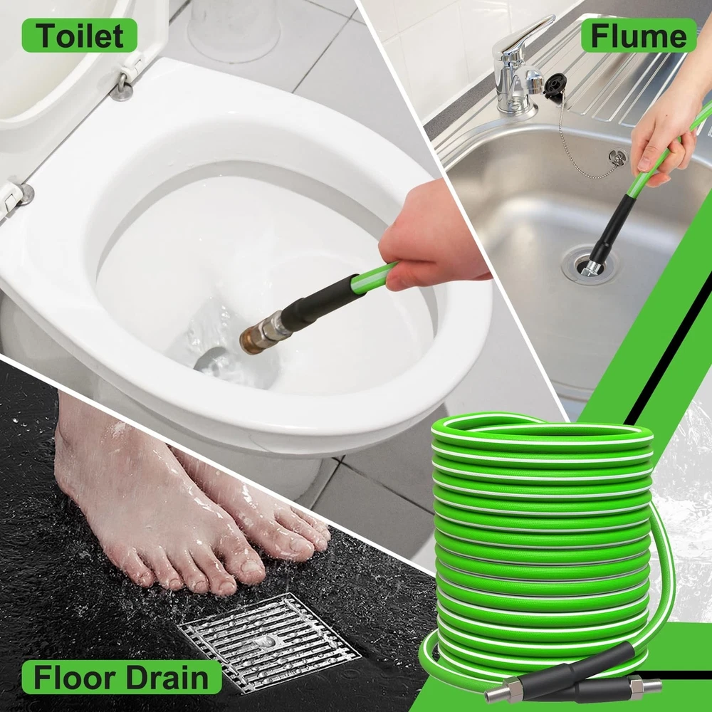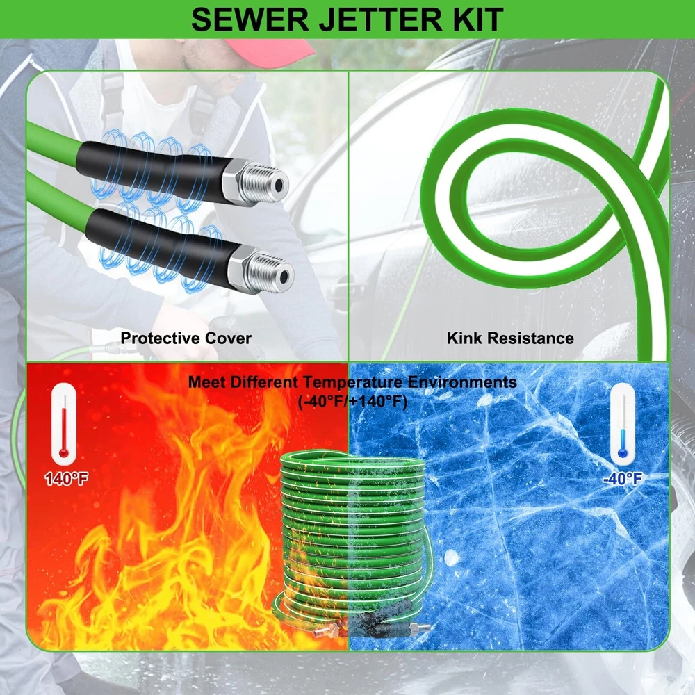 Sewer Jetter Kit for Pressure Washer 100 FT, 5800 PSI Pressure Drain Cleaner Hose for 1/4 Inch NPT Corner, Pressure Washer Cleaning Kit with 5 Pcs Sewer Jetting Nozzle, Pearl Corsage Pin (Green) Product Details Brand: Tayapura Material: Plastic Color: Green-White Item Weight: 3.14 Kilograms Maximum Pressure: 5800 Pound per Square Inch Item Length: 1E+2 Feet Number of Flutes: 5 Manufacturer: Tayapura Brand: Tayapura Material: Plastic Color: Green-White Item Weight: 3.14 Kilograms Maximum Pressure: 5800 Pound per Square Inch Item Length: 1E+2 Feet Number of Flutes: 5 Manufacturer: Tayapura Part Number: Sewer Jetter Kit-100Ft(Green&White) Item Weight: 6.91 pounds Country of Origin: China Item model number: Sewer Jetter Kit-100Ft(Green&White) Power Source: NO Batteries Included?: No Batteries Required?: No Date First Available: March 7, 2024 SEWER JETTER KIT: Includes all the accessories you need. It comes with 1 x 100 ft sewer jetter hose (green with white line), 1 x M22-14 NPT coupler, 1 x 1/4'' quick connect, 1 x 1/4'' plug, 5 x sewer nozzles,1 x pearl corsage pin and 2 x spanners THICKER CLEANER HOSE with EXCELLENT MATERIAL: The outer layer of the upgraded hose is made of thicker material, which can delay aging and increase wear resistance. The reinforcing layer is a chemically bonded 1/4 " high-tenacity polyester fabric WORKING PRESSURE with 5800 PSI: With working pressure up to 5800 PSI and temperatures up to 40F/+140F, blockages can be easily cleared QUICK CONNECT: Both ends of the hose are equipped with a 1/4" M-NPT quick connect, which is suitable for assembling and disassembling high-pressure fitting. Sewer jet hoses can be connected to the pressure washer machine by M22-14F to a 1/4'' connector DIFFERENT SEWER JETTER NOZZLES: More powerful and unique nozzle design, suitable for general water pipe cleaning, for sewer clogging to provide better results GREAT NOZZLES: The fixed nozzle is used to dredge the sewer pipe that needs to be turned; Rotating sewer jet nozzle can provide debris flushing; 1 front jet and 6 rear jet designs can clean and unclog drains laterally, remove clogs in corners WIDELY USED: Our sewer jetter kit can be widely used to clean indoor & outdoor sewers, such as sinks, toilets, drains, etc. It can also be used to clean cars, floors, driveways or roofs. Tape can help prevent leaks, pearl pin can clean the clogged nozzle