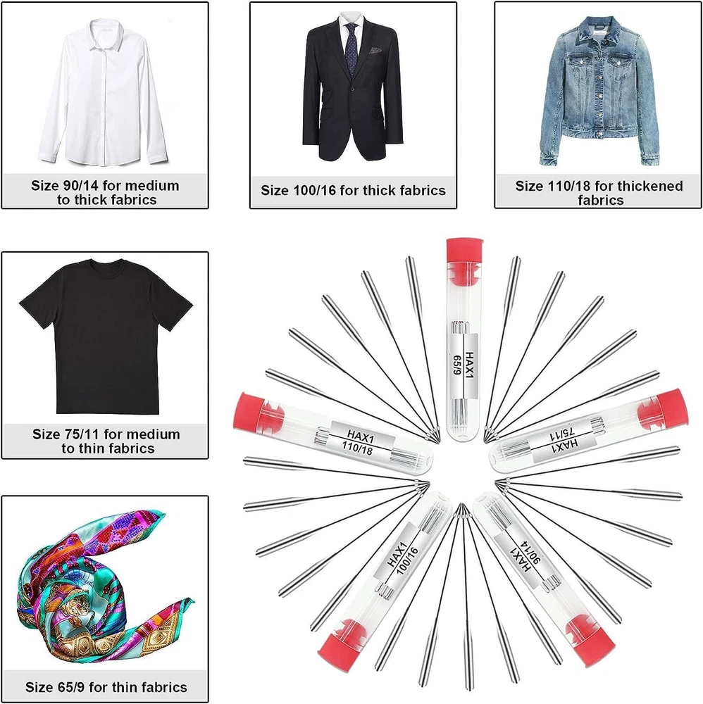 CONTACT US DIRECTLY FOR FREE & PREPAID RETURNS Sewing Machine Needles, Universal Sewing Machine Needle, for Singer, Brother, Ja 【Perfect Compatibility】 They are compatible with most household sewing machines or old sewing machines, such as Singer, Brother, Janome, Varmax, Kenmore, etc. NOTICE! Not suitable for industrial large sewing machines. 【Value Pack Set】 This set comes in five sizes: 65/9, 75/11, 90/14, 100/16, 110/18, 10 needles per size, 50 needles in total. It also includes 3 bobbins, 5 storage tubes (random color) and 1 transparent box for storage. 【High Quality Material】This machine needles are made of top quality high-strength steel, high hardness, sharp needle tip, smooth needle hole, not easy to bend & skip needle, and long service life. 【Suitable Multiple Fabrics】Suitable for thin fabrics such as tulle, silk (size: 65/9); medium-thin fabrics such as shirts, satin (size: 75/11); ordinary fabrics such as windbreaker (size: 90/14); thick fabrics such as jeans(size: 100/16); thicker fabrics such as thick coats(size: 110/18) . 【Perfect Gift 】The set is a perfect gift for your relatives, friends, families, mother and wife, whether they are professionals or beginners, they will find this kit convenient and complete, especially for DIY hand stitch lovers. 【Quality Assurance】 100% Money Back Guarantee. We provide high quality sewing machine needles, if you have any questions, please feel free to contact us through Amazon. Are you looking for a high-qualityhousehold sewing machine needle? Our sewing machine needles are compatiblewith most household sewing machines or old sewing machines, such as Singer,Brother, Janome, Varmax, Kenmore, etc. they are ideal for quilting, sewing,home decor projects. Whether you are professionals or beginners,you will find this kit convenient and complete, especially for DIY hand stitchlovers. The set is also a perfect gift for yourrelatives, friends, families, mother and wife. Product Specification: Material: Top quality high strength steel Needle Size: 1.54 in Color: Silver Package Includes: 10* HAX1 65/9: suitable for thin fabrics(such as real silk fabrics) 10* HAX1 75/11: suitable for medium andthin fabrics (such as shirt fabrics) 10* HAX1 90/14: suitable for medium andthick fabrics (such as windbreaker and jacket fabrics) 10* HAX1 100/16: suitable for thick fabrics(such as jeans fabric) 10* HAX1 110/18: suitable for thickerfabrics (such as thick cotton fabrics) 5 storage tubes 3 bobbins 1 transparent box for storage Lifetime Guarantee: 100% Money back guarantee. We providehigh-quality sewing machine needles, if you have any problems with it, pleasefeel free to contact us via Amazon. REVIEWS The product came very well packaged. I'm very happy. thank you for everything. Seller strongly recommended. This is great! I definitely recommend! Product looks amazing Delivery was fast. Excellent seller, great communication. I advise everyone
