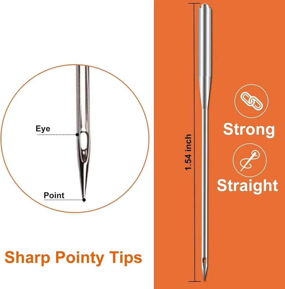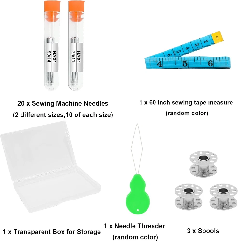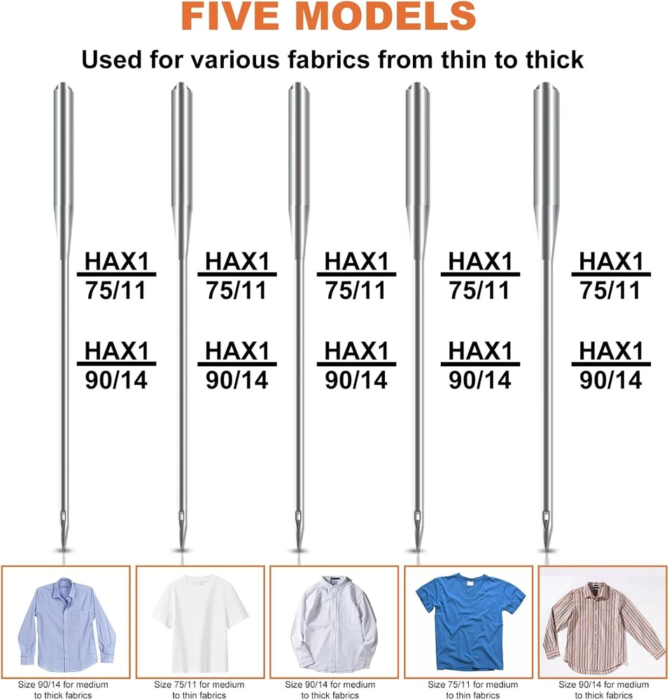 Sewing Machine Needles, Universal Standard Needle, Home Sewing Machines Needles, Tuiasn Compatible with Singer, Brother, Janome, Varmax, Sizes HAX1 75/11, 90/14 (20 PCS) Product Details Product Dimensions: 2.83 x 2.05 x 0.63 inches Item model number: HAX1 Item Weight: 1.44 ounces Manufacturer: Tuiasn Country of Origin: China Brand: Tuiasn Compatible Devices: Domestic Sewing Machine Compatible Material: Fabric Point Type: Regular Point 【Perfect Compatibility】 Tuiasn Compatible with most quality household sewing machines, including Singer, Brother, Janome, Kenmore, etc. 【Value Pack Set】 Two sizes: 75/11, 90/14, 10 needles per size, 20 needles in total. It also includes 1 needle threader (random color), 1 60 inch sewing tape measure (random color), 2 storage tubes (random color) ,3 spools and 1 transparent box for storage. 【High Quality Material】This machine needles are made of top quality high-strength steel, high hardness, sharp needle tip, smooth needle hole, not easy to bend & skip needle, and long service life. 【Suitable Multiple Fabrics】Suitable for medium-thin fabrics such as shirts, satin (size: 75/11); ordinary fabrics such as windbreaker (size: 90/14). 【Perfect Gift 】Perfect gift for your relatives, friends, families, mother and wife, whether they are professionals or beginners, they will find this kit convenient and complete, especially for DIY hand stitch lovers. Product Specification:Material: Top quality high strength steelNeedle Size: 1.54 inColor: SilverPackage Includes:10* HAX1 75/11: suitable for medium and thin fabrics (such as shirt fabrics)10* HAX1 90/14: suitable for medium and thick fabrics (such as windbreaker and jacket fabrics)1 needle threader (random color)1 60 inch sewing tape measure (random color)2 storage tubes (random color) 3 spools1 transparent box for storage