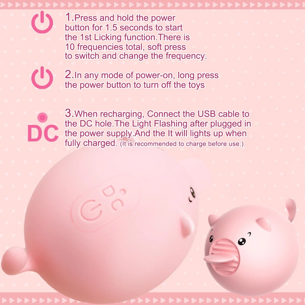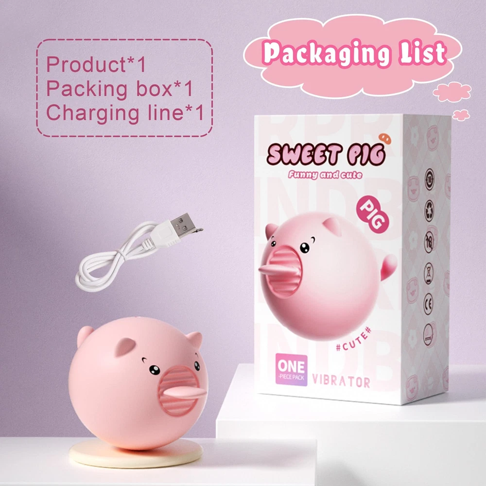 <> <> <> Specifications: Product name:Cute pig Product model:LL-2330 Material:Silicone+ABS Rated voltage:3.7V Function:Tongue lick 10 modes Product size:42mm*68mm Features: Instructions for use: 1.Press the switch for 1.5 seconds to activate the first tongue lick function, change one mode with each light press, 10 modes in total. 2.In each mode, long press the button to turn off. 3.When charging, please insert the charging pin into the DC charging hole on the back of the product, the indicator light will flash when the power is on, and the indicator light will be on for a long time when it is fully charged. (It is recommended to fully charge the device before use) Precautions: When cleaning, please use slow flow water to gently clean the head, do not directly immerse the entire product in water to prevent water into the internal damage to the circuit components. Package includes: 1X vibrator 1X USB charger Please refer to the product manual for specific operating methods. Privacy Guaranteed: Your privacy is the utmost importan ce to us. With our discreet packaging you can shop in confidence, the only person who knows what's inside the package is you!